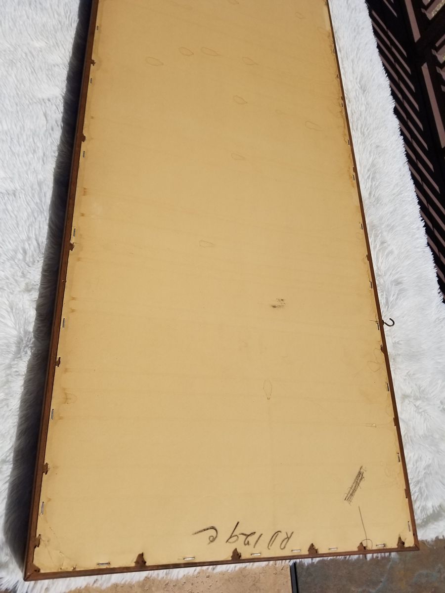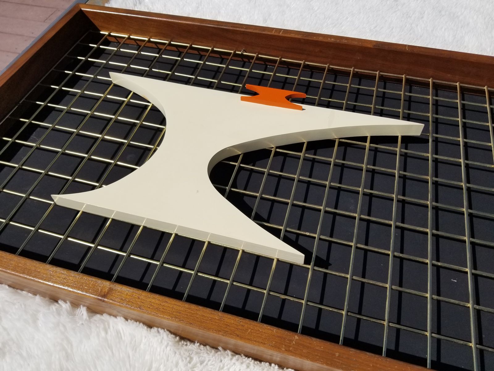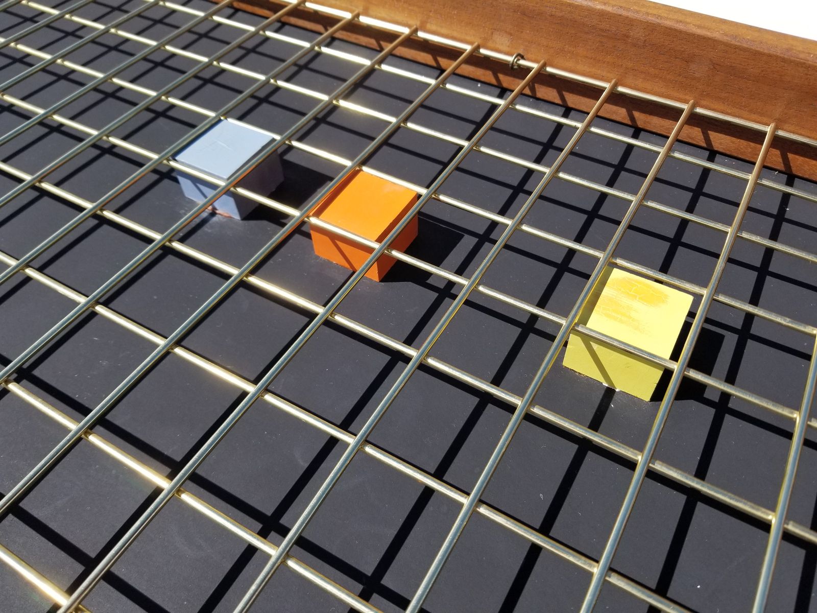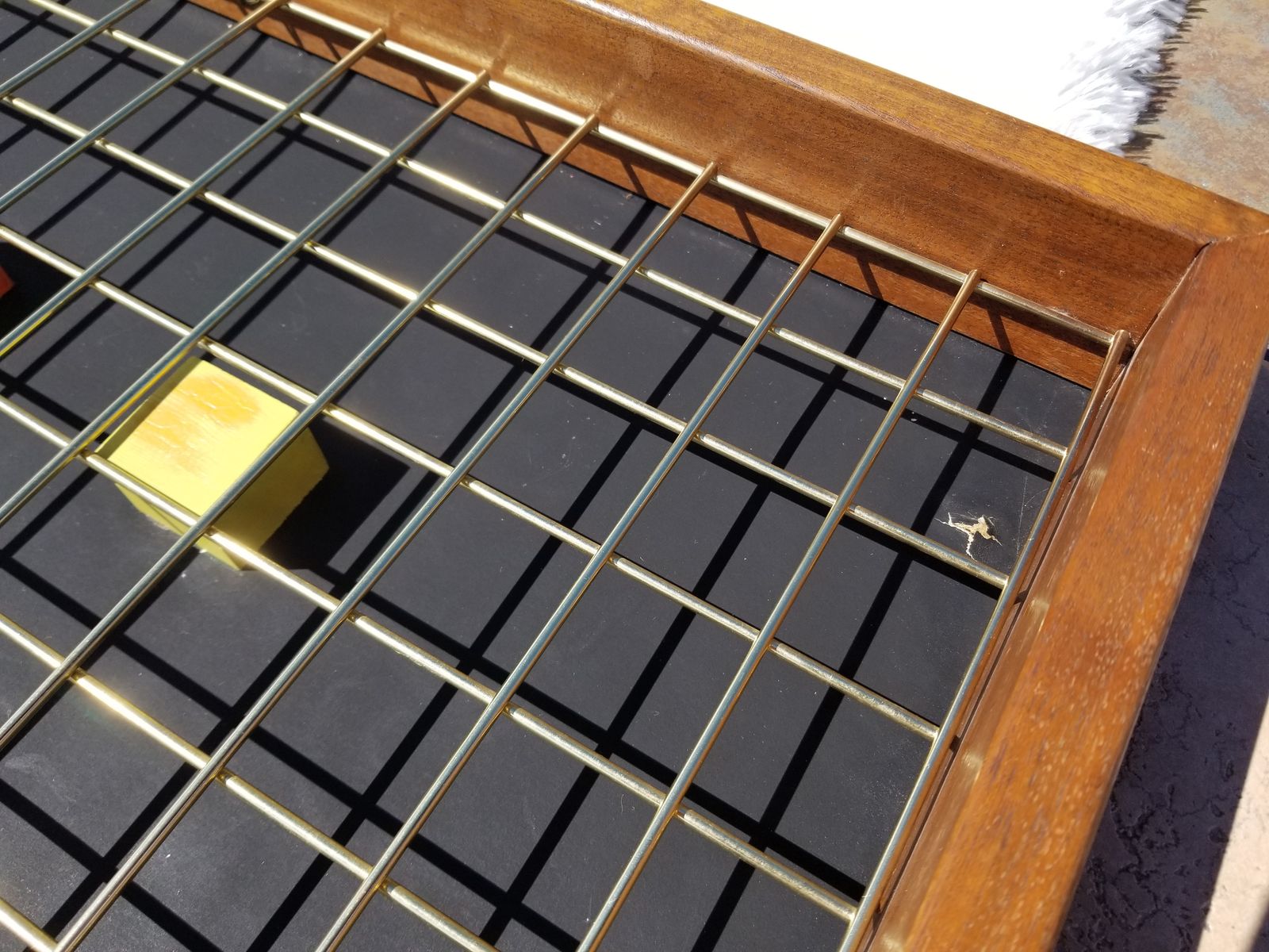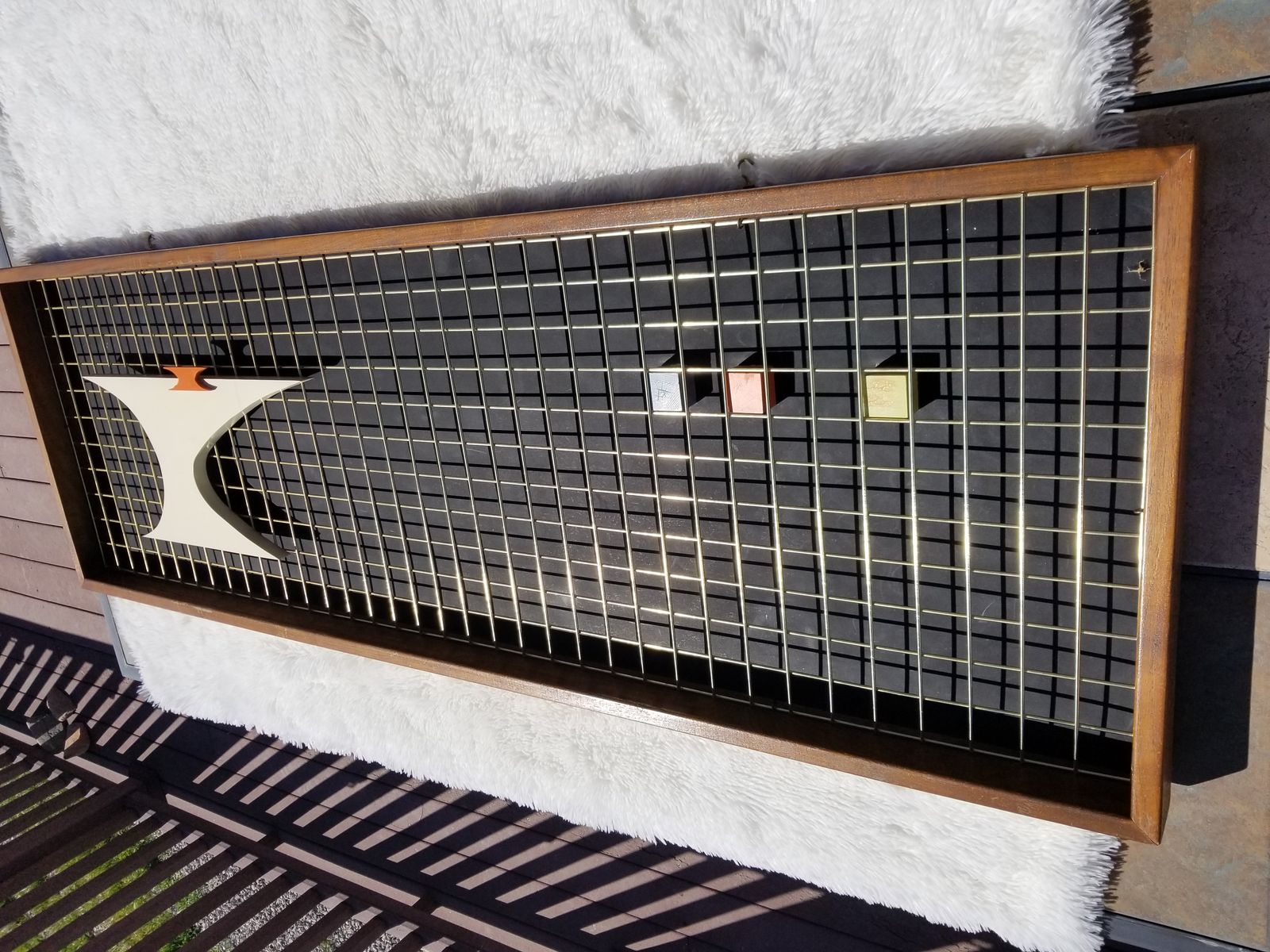 I've decided to sell my Pepper piece. It's been stored since our move and I don't think we'll hang it. Someone should enjoy this piece. This is true Mid Century art, approximately 70 years old. Very rare and collectable. Walnut frame with a brass colored metal grid and painted blocks. I believe I read once that the blocks were the color palette for Better Homes and Gardens the year they were released, 56-58. It's 18 x 56 inches. There is a smaller piece like it on ebay currently for $4500.