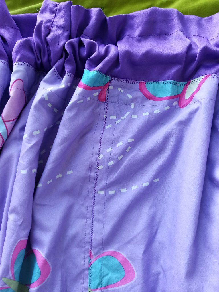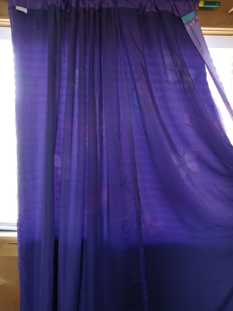 2 floor-length purple curtains with DIY sewn adaptation of room-darkening lining.