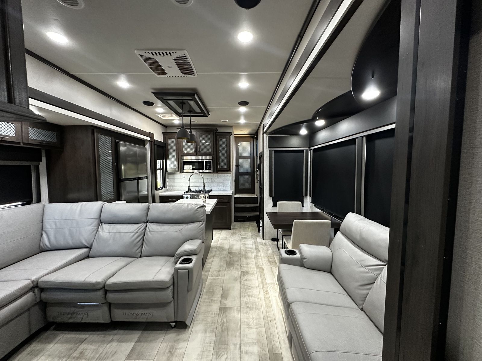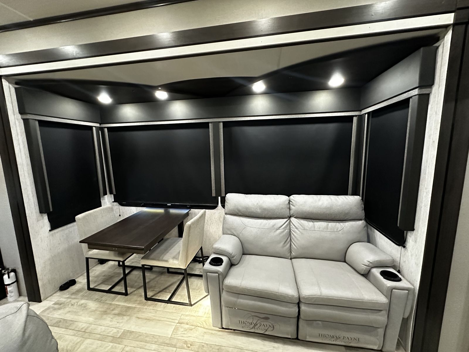 The living area features a dinette table with chairs, a reclining sectional, heated theater seating, a fireplace, and a large flat-screen TV.
