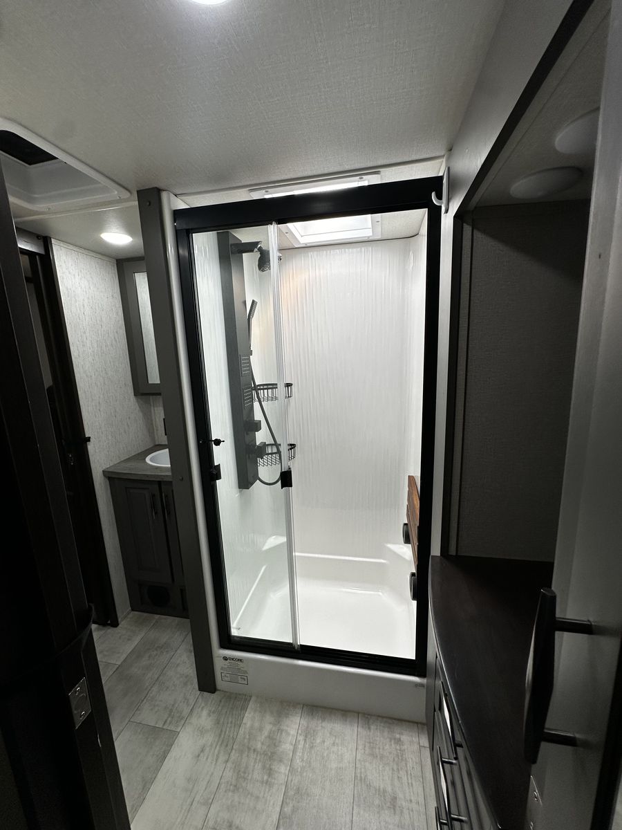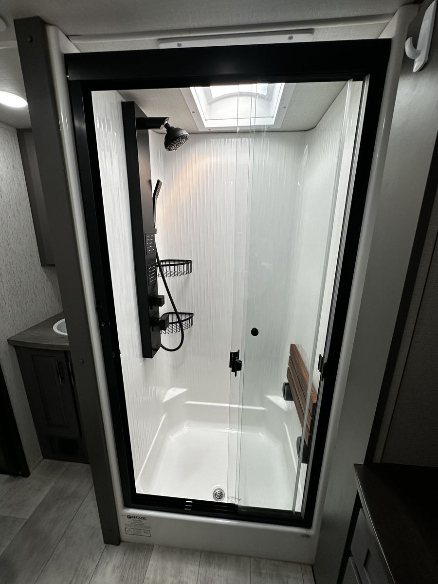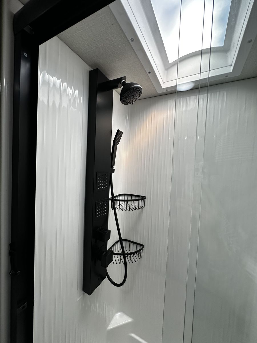 Outside you also have an outdoor shower and pressure washer for your toys. Has the full ramp deck with railing and sliding glass doors