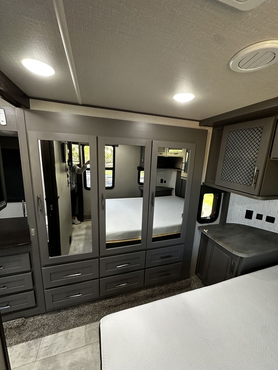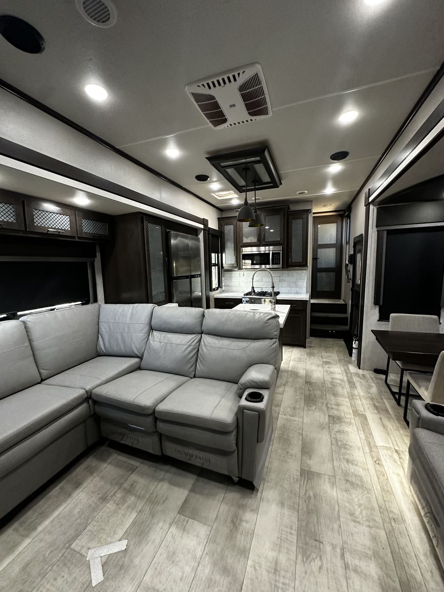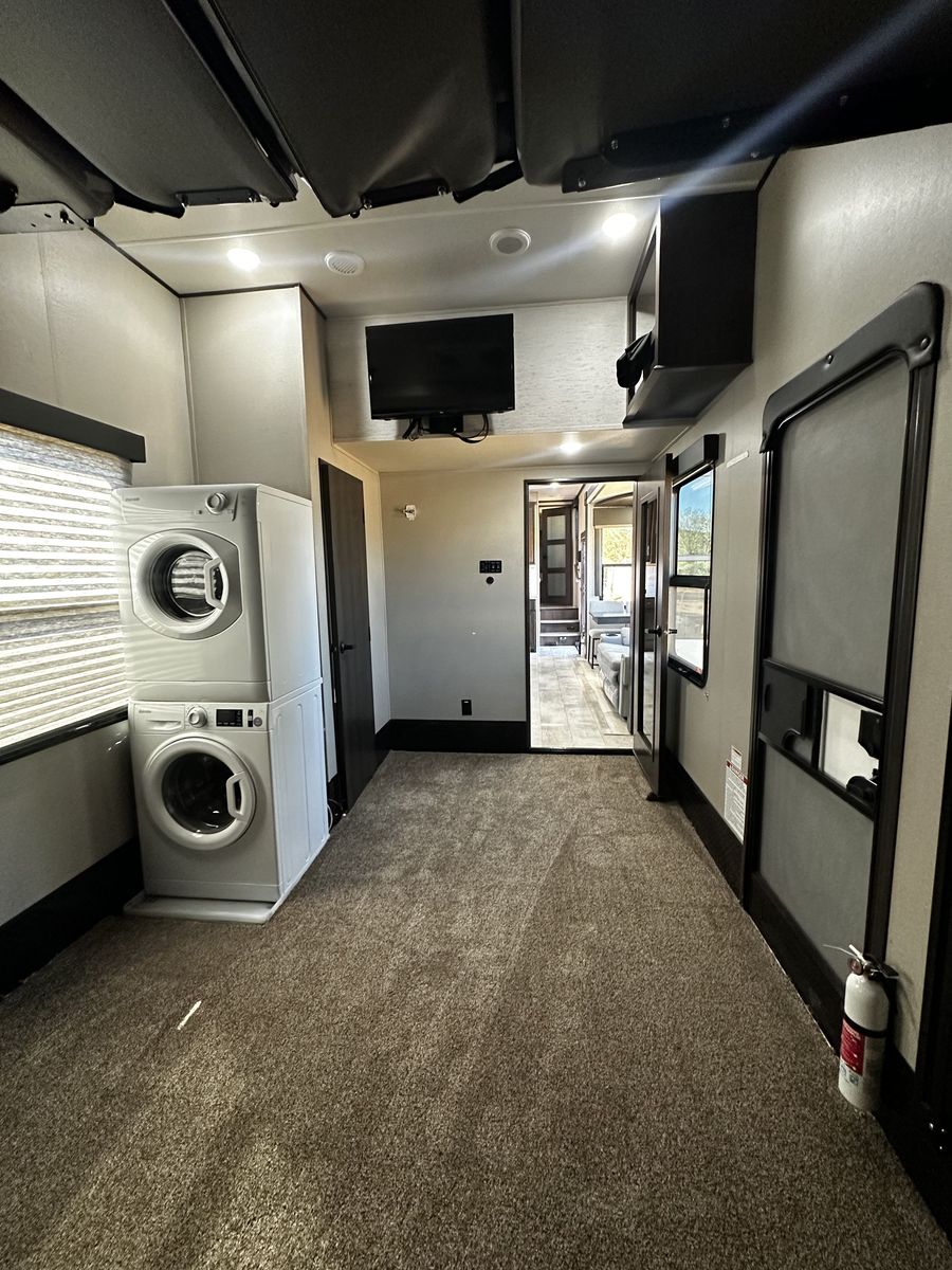 The 14-foot garage has a half bath, drop-down bunks, and sofa table combo. A washer and dryer work fantastic. The outdoor entertainment center are also included. You'll be prepared for any camping adventure with a 5500 Onan generator, a 60-gallon fuel station, and a roof top solar system. The trailer pulls amazing and has both side and rear towing cameras with monitor.