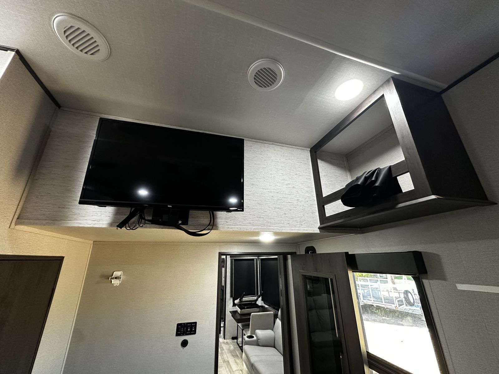 The master bedroom has a queen bed with tons of storage, flat screen TV, storage under the bed. The main bath includes a large residential shower with seating and a porcelain toilet.