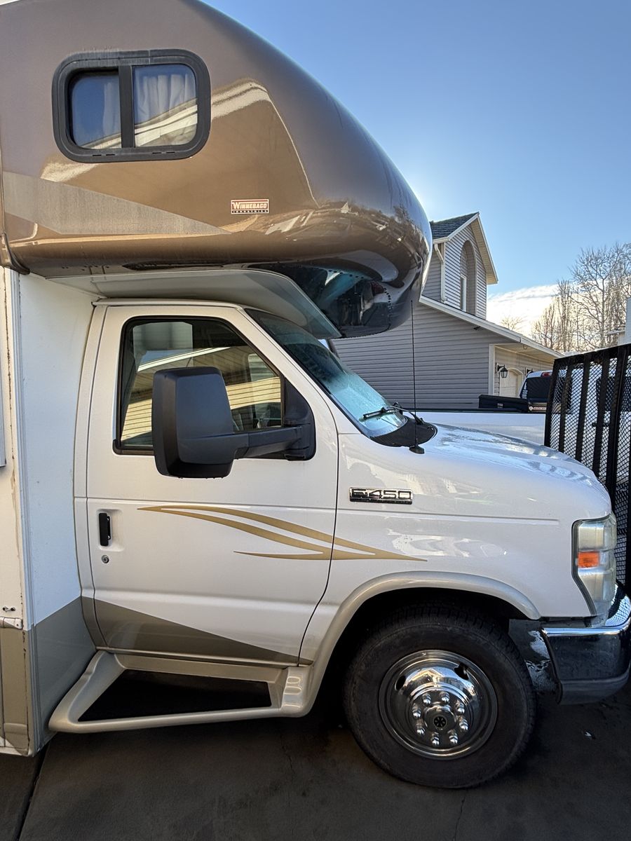 Towing capacity Ford 450 V10 gas engine. Roughly 360 horsepower.