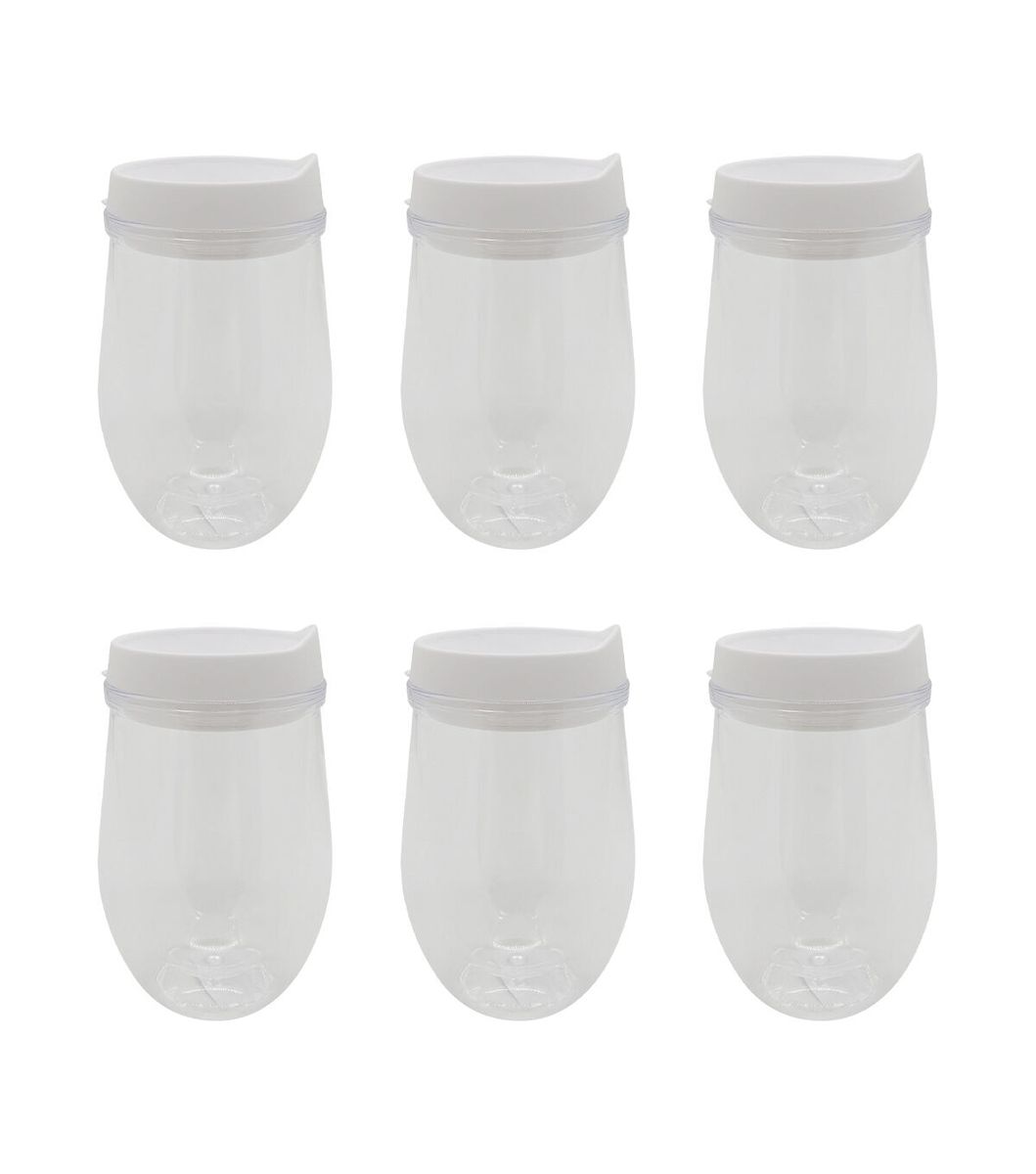 The Clear Plastic Wine Tumblers With Lids will make a great addition to your collection. This pack includes six clear wine tumblers, each with a lid. They will be perfect to drink juices or water while traveling. You can also use them to serve beverages and smoothies to little ones.Brand: HappyIncludes six tumblers & lidsDimensions: 13.27 x 9.06 x 6.02 inchesWeight: 12 ouncesContent: Plastic