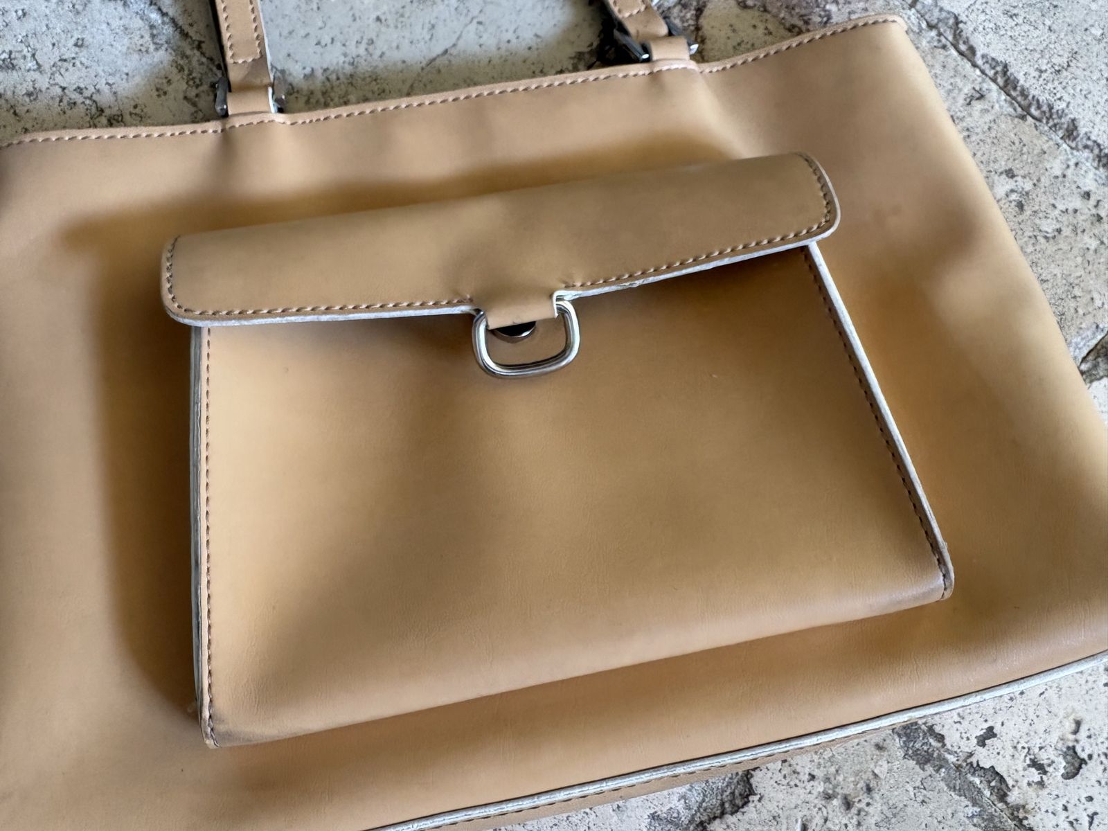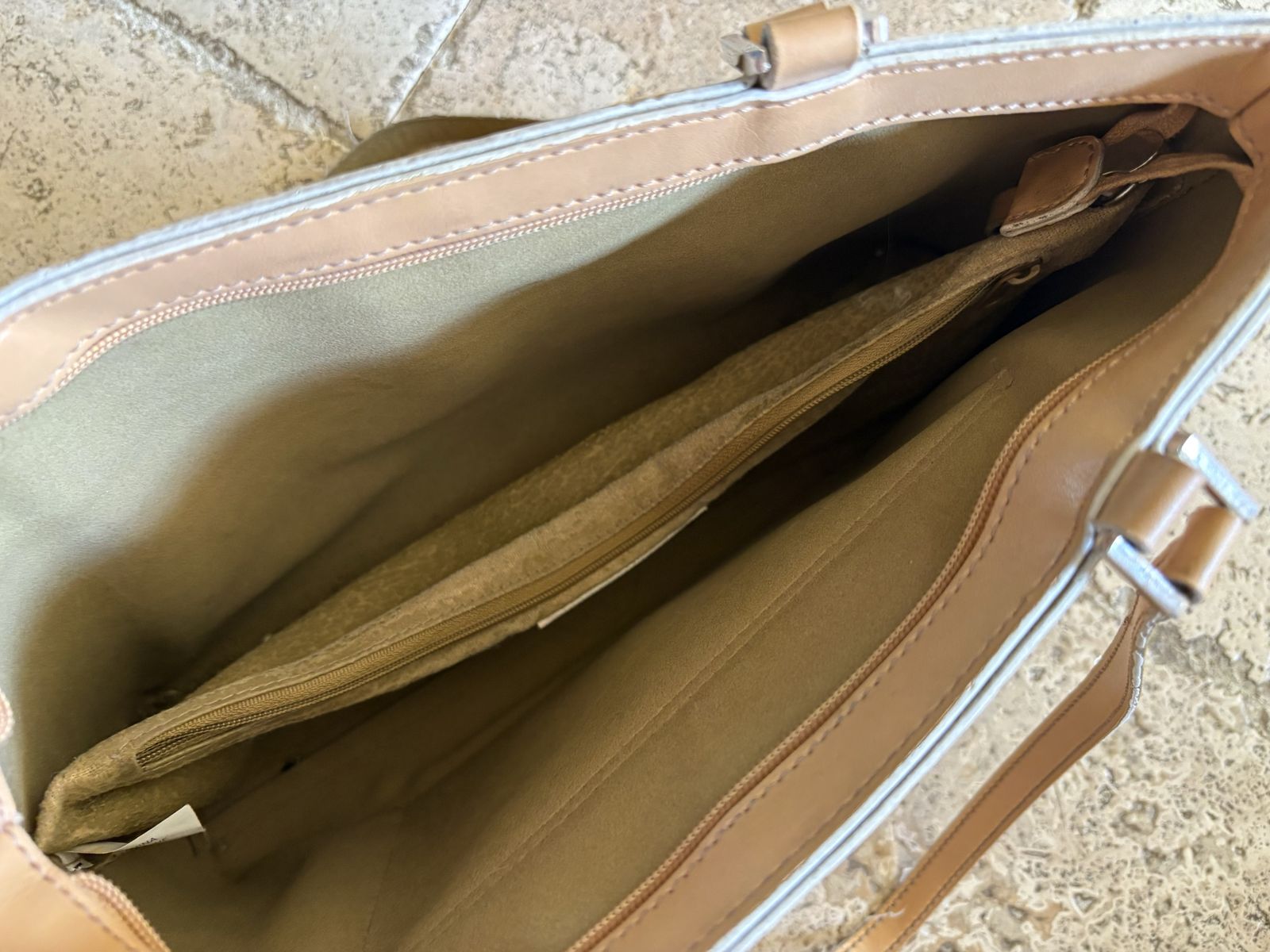 I have a yellowish light tan Mondani shoulder bag or purse. It feels like leather but is probably faux. It is 13 inches long and 8 1/2 inches tall. The handles add 11 1/2 inches. It has a zipper closure on top. There’s another large zipper pocket inside and an outside pocket. See my other ads for jewelry, artwork, home decor and more.