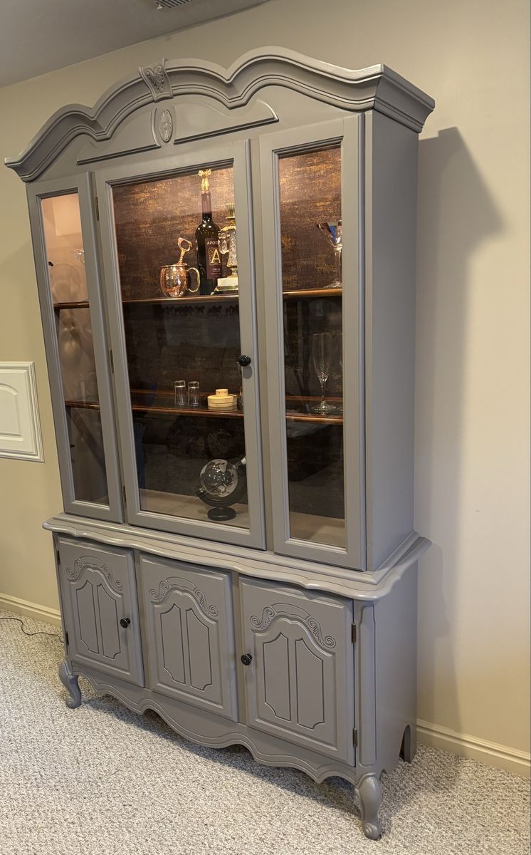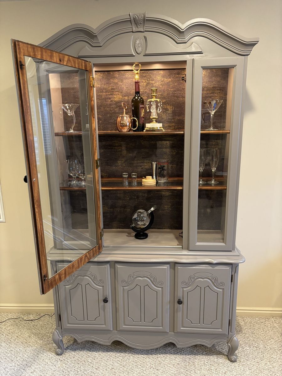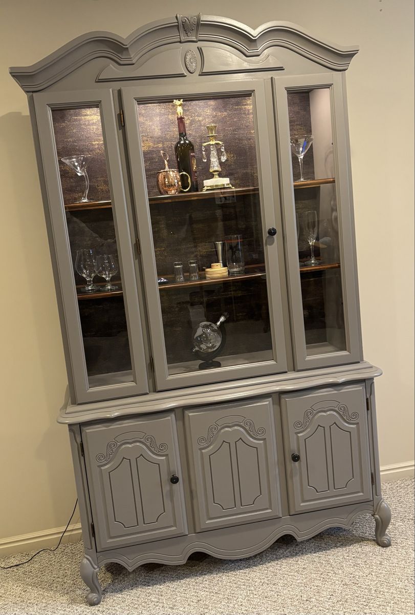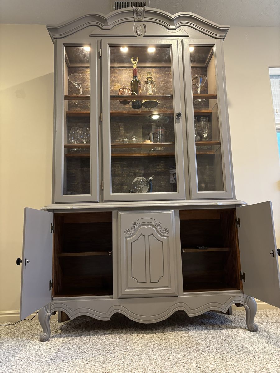 French hutch with gold flaked wallpaper back. Use as a liquor cabinet •extra pantry• linen closet• display your china or anything you would like. New puck lighting with controller. Hand painted •Mink by SW paint color New pulls . Two piece for transport Fairly light Glass shelving One corner does have a little piece missing but everything else in working order