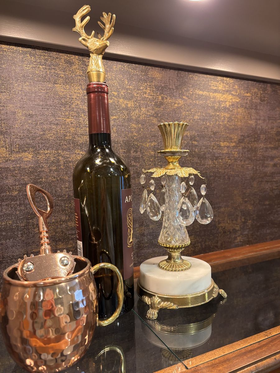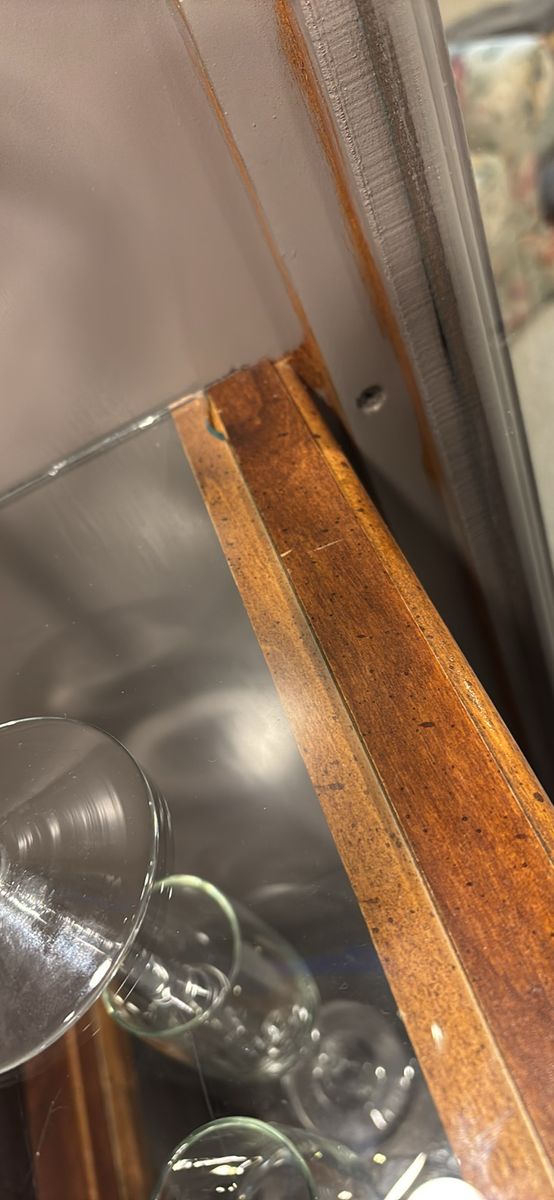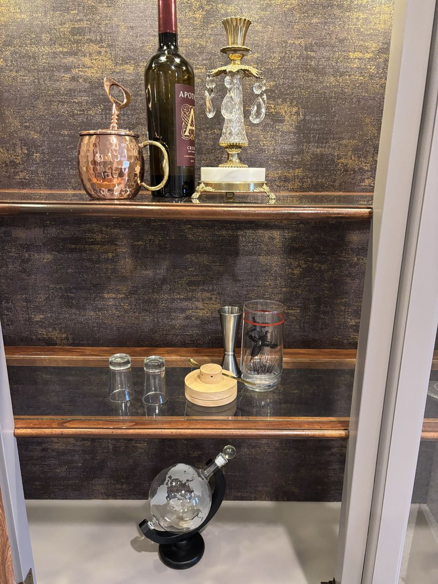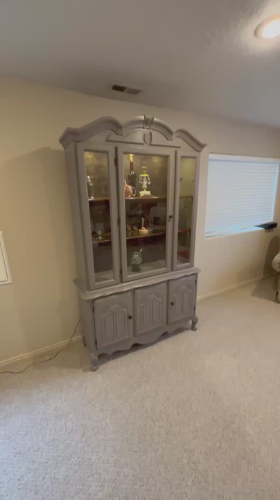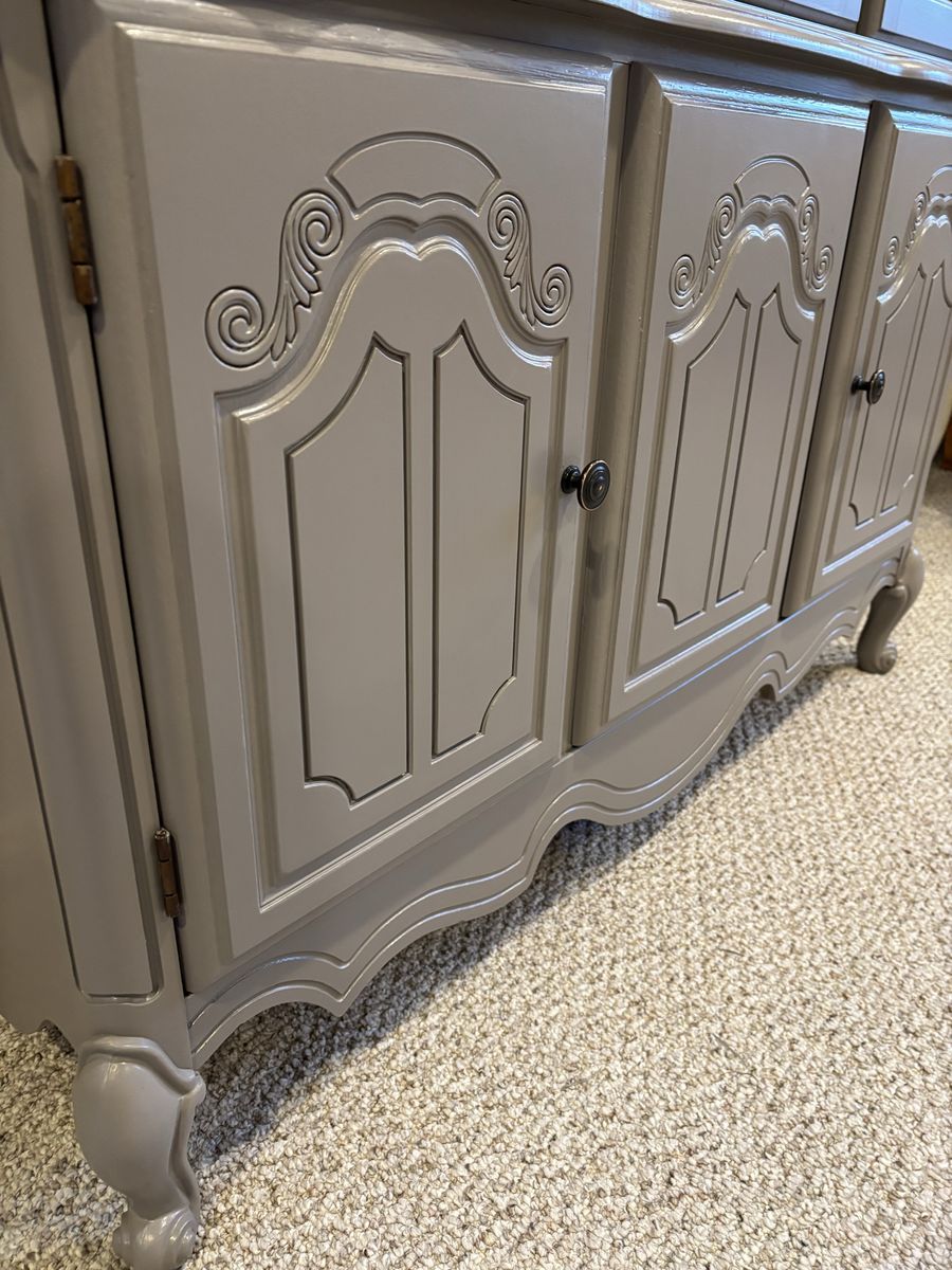French hutch with gold flaked wallpaper back. Use as a liquor cabinet •extra pantry• linen closet• display your china or anything you would like. New puck lighting with controller. Hand painted •Mink by SW paint color New pulls . Two piece for transport Fairly light Glass shelving One corner does have a little piece missing but everything else in working order