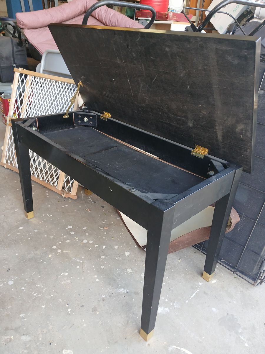 Black dual size wood piano bench with inside storage and piano tuners.. come with bench cover.