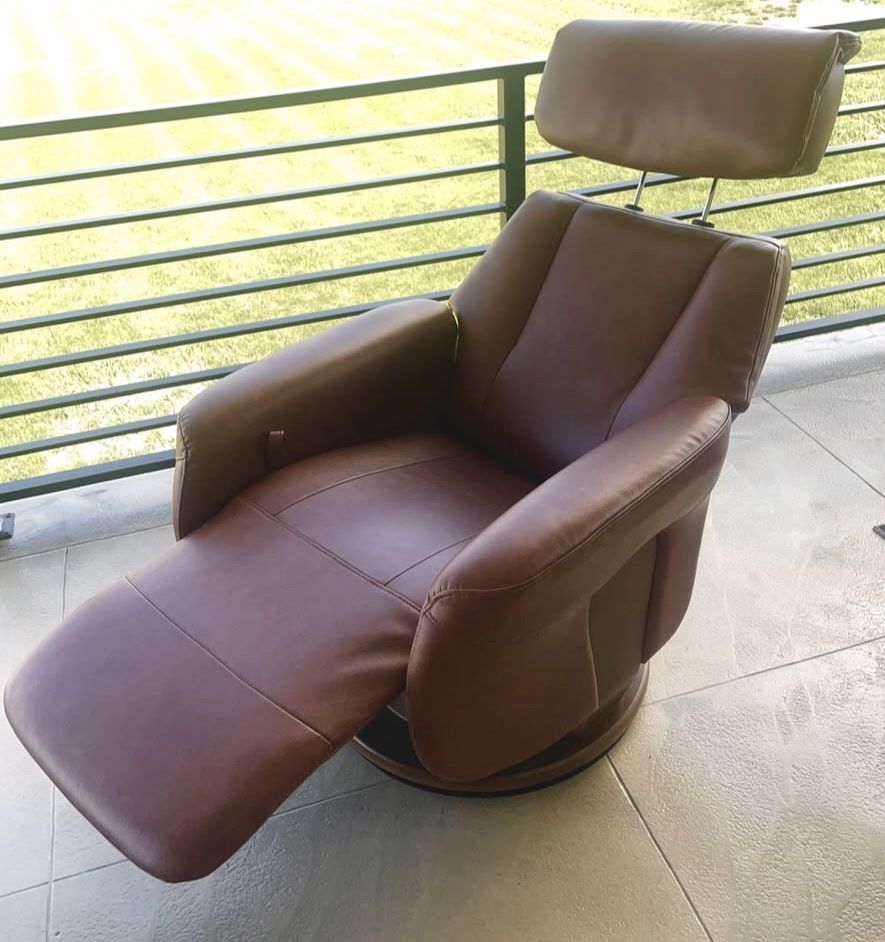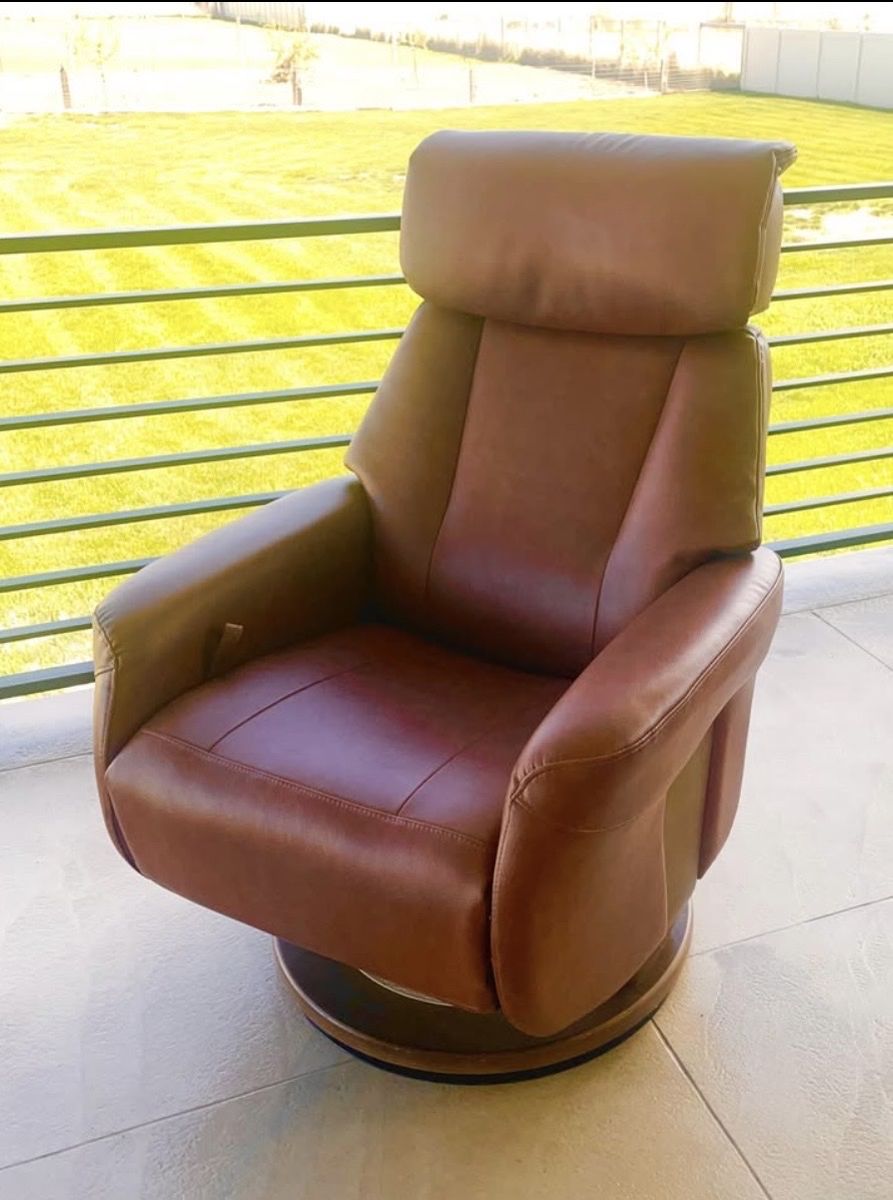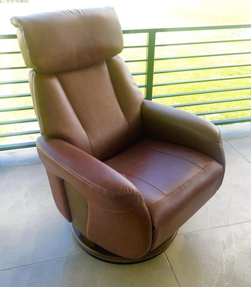 VenmoUp for sale is stunning, very well taken care of Stressless Style Chair & Ottoman made by Benchmaster - high end US furniture maker. This is a high quality chair with beautiful Caramel Brown genuine leather upholstery and stained Oak wood base & frame.