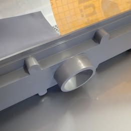 These are heavy duty drains with tile in tray. Glues directly to ABS or PVC pipe. Use with all Schluter, Red-Gard, rubber composeal, and paint-on rubber.