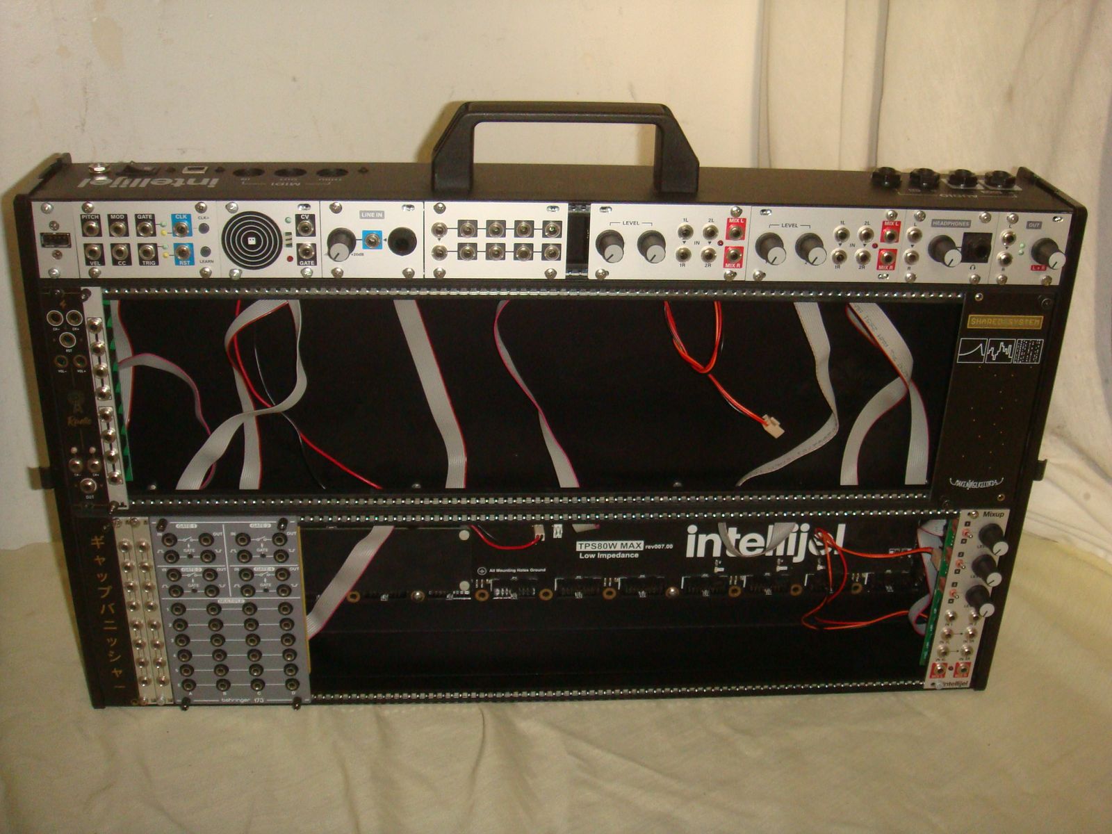 ONE INTELLIJEL 7U PERFORMANCE CASE WITH INTELLIJEL TPS80W MAX TRIPLE POWER SUPPLY EURORACK BUSBOARD, BEHRINGER 173 QUAD GATEMULTIPLES EURORACK MODULE, MIDI 1U MIDI Voice/Clock/Sync Interface 1U Module, 1 FSR 1U Force Sensitive Pad, 1 USB Power 1U3, 1 line in 1U, 1 Intellijel Buff Mult Eurorack Buffered Multiple Module, 2 Stereo Mixer 1U Chainable Mono/Stereo Audio Utility Mixer Eurorack Modules, 1 Phones1U Headphone and Stereo Output module, 1 Stereo Line Out 1U Eurorack Module, 1 Make Noise Shared Blank Panel 10HP Modular circuit, & INTELLIJEL MIXUP CHAINABLE MONO/STEREO AUDIO UTILITY MIXER AND EVERYTHING ELSE SHOWN. This is a lightly used unit that's in great overall condition! It comes with everything shown in the photos! The individual components of this system add up to around $1600! This is your chance to save big-time so don't miss out!!