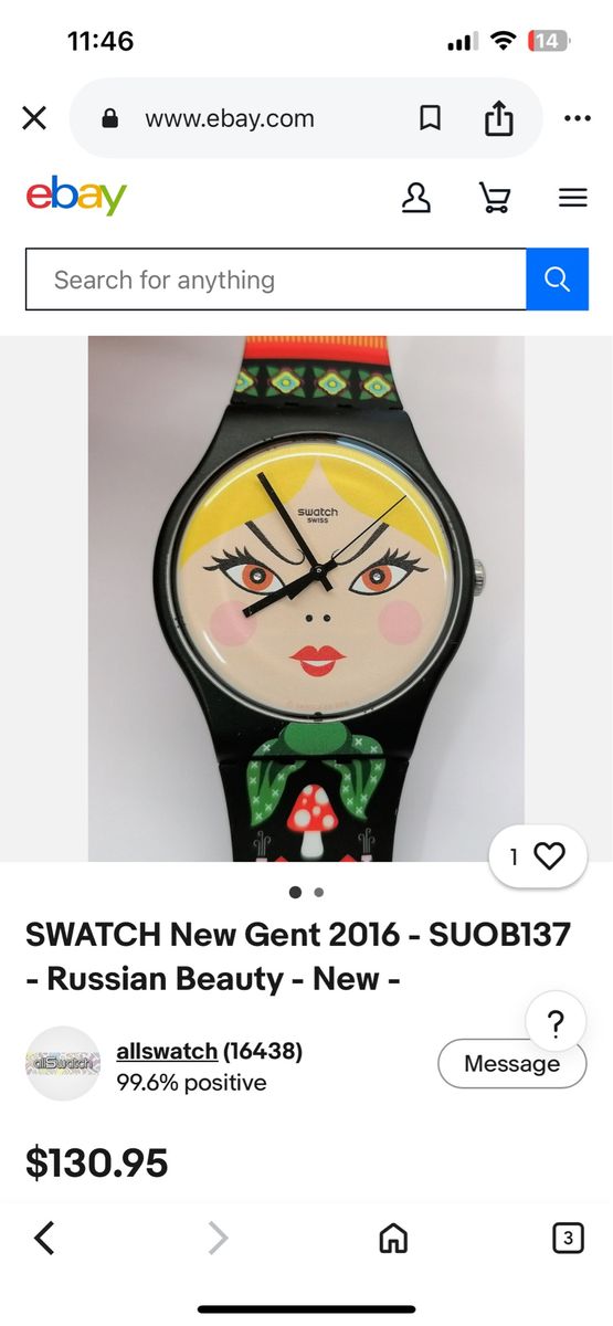 VenmoRussian Beauty Swatch Watch My husband loved this watch, but only wears his Garmin now for running. Needs a new battery. No longer sold on Swatch Cash or Venmo Will hold with Venmo payment