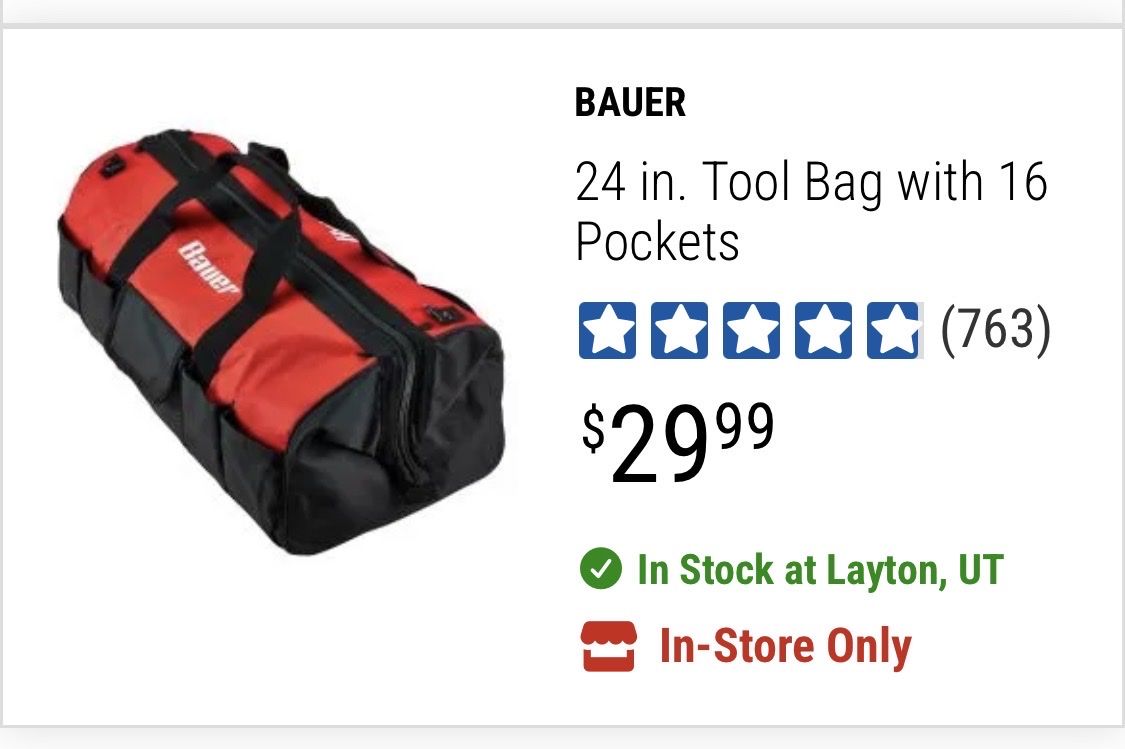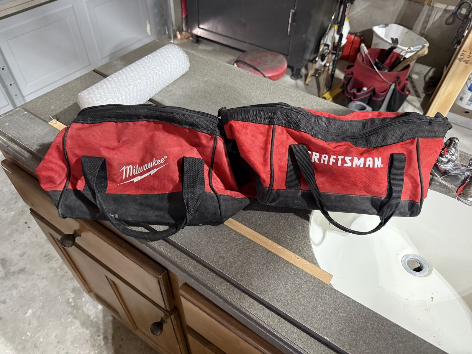 I have four different tool bags for sale, one is a 24” Bauer tool bag that’s in good condition. Another is a Husky 18” tool bag in excellent condition, the other two are small tool totes one is a Craftsman and one is a Milwaukee. The two smaller ones are $5 each, the Bauer tool bag and Husky tool bag are $15 each. Or take all four of them for $30. Text is best at 801-200-9035.