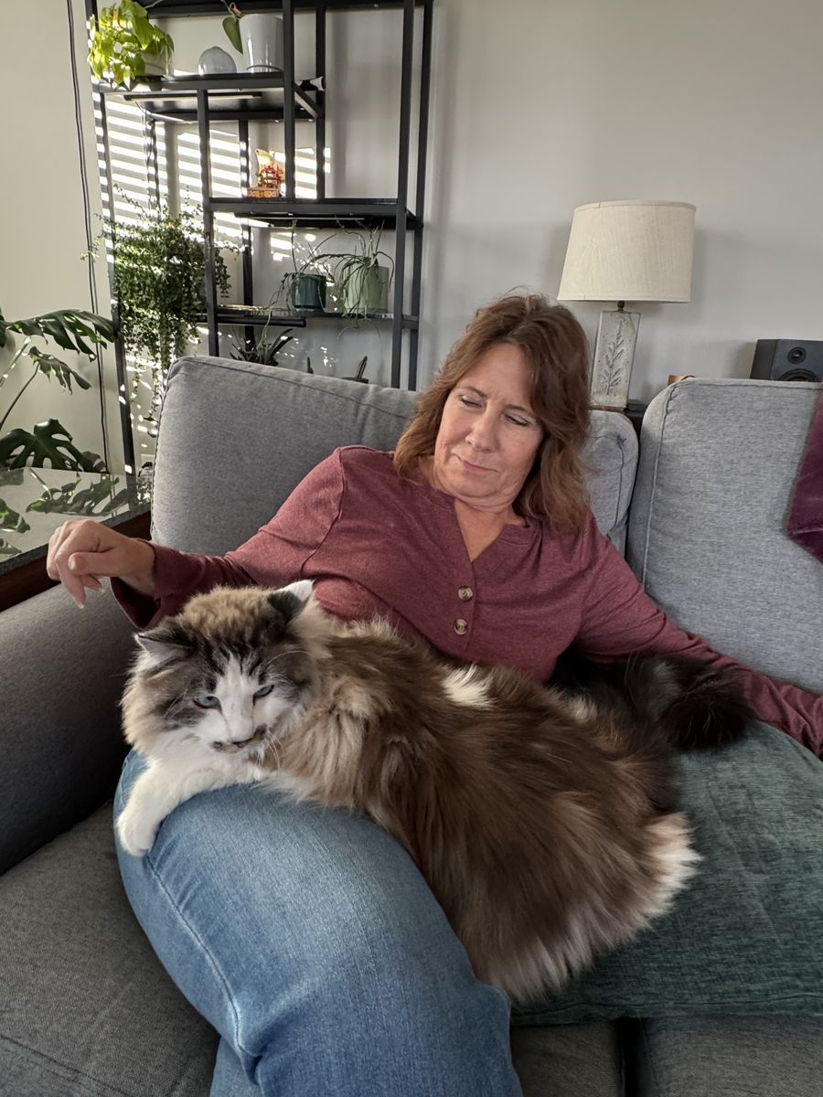 Miles is currently about 13-14 pounds and extremeeeeely fluffy, which is highly typical of his winter habitus. During summer months when he is off roaming most of the day, he drops a ton of weight and his coat thins out. He absolutely needs regular grooming to avoid matting. I typically brush him and then shave down his belly and mane to more manageable lengths. His nails are not clipped for his safety as he spends a significant amount of time outdoors. Miles is micro-chipped, vaccinated, and neutered.