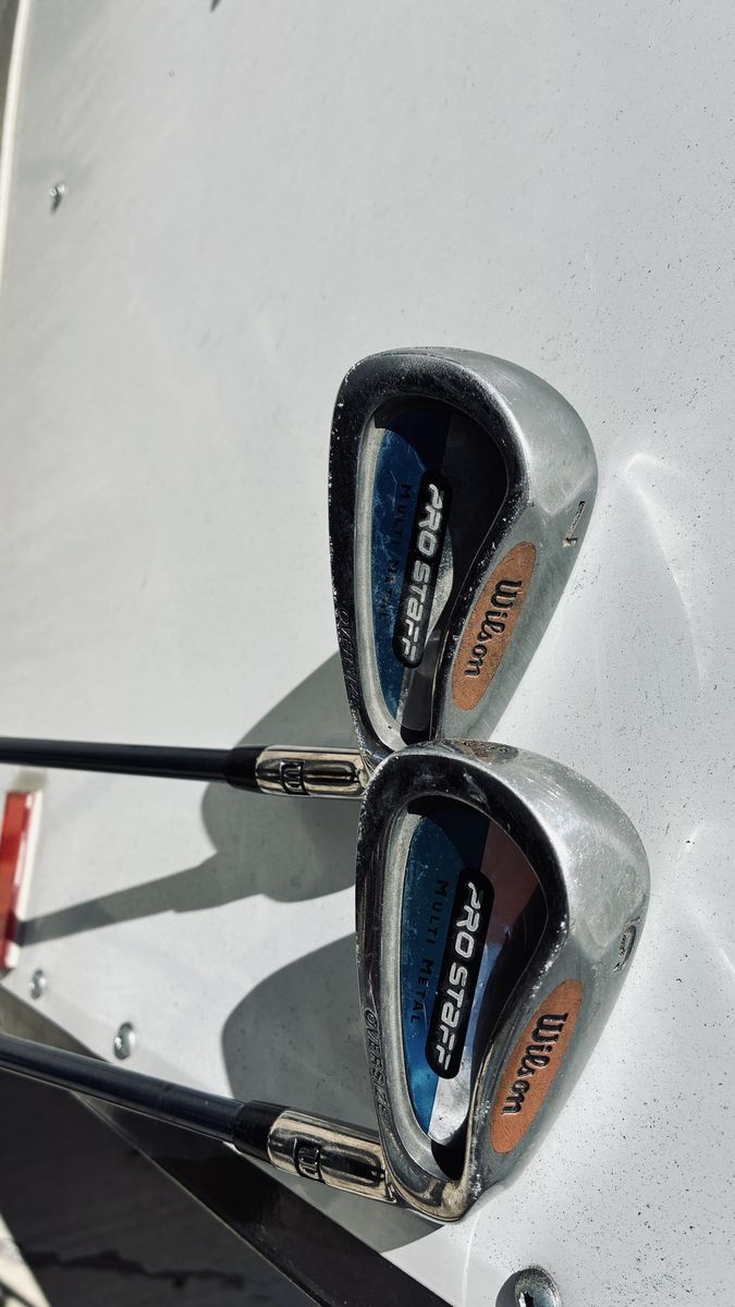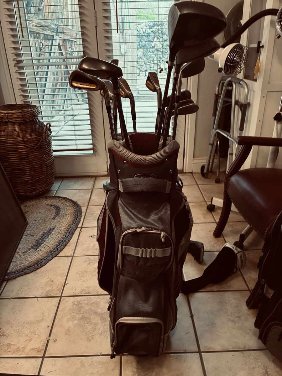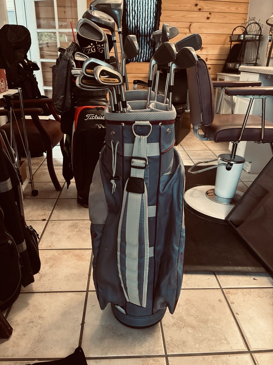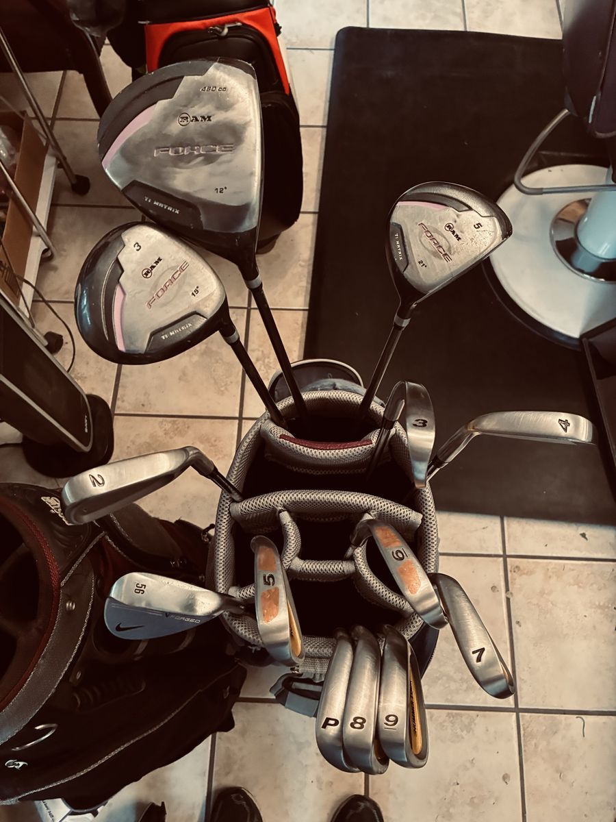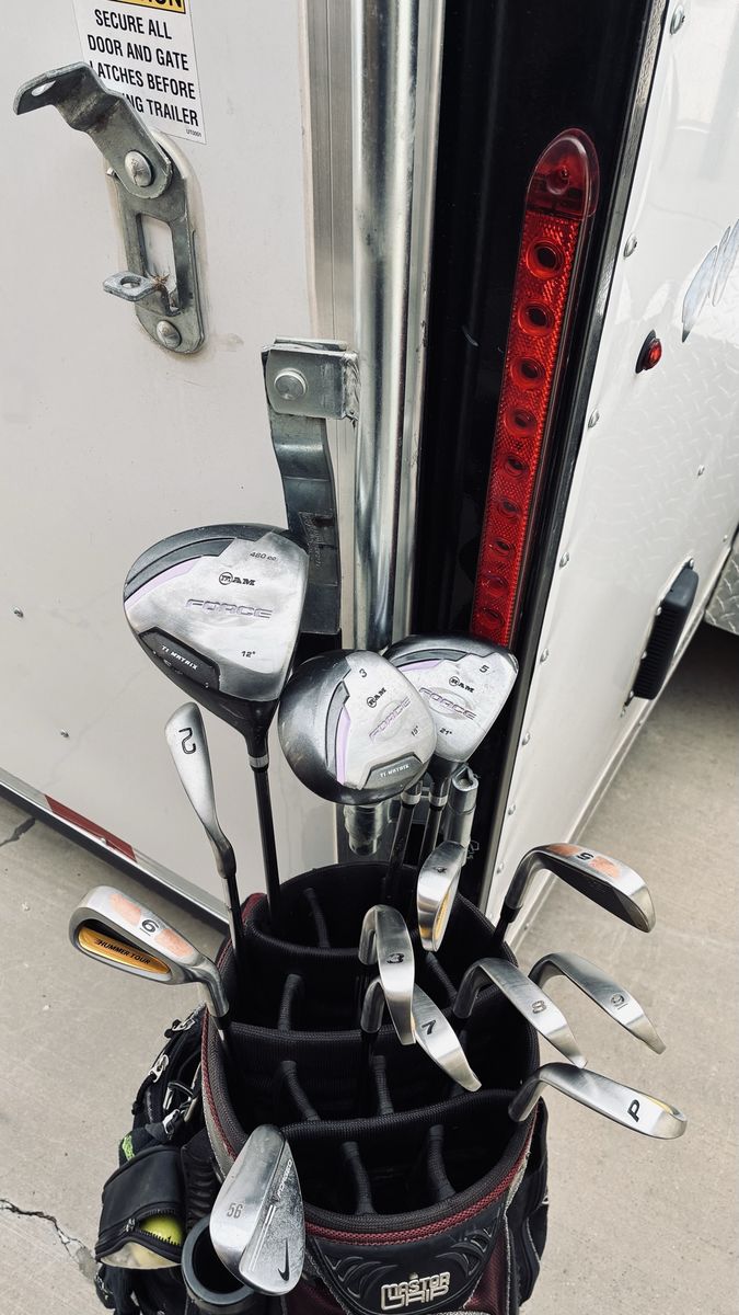 Nice set up! Hummer Tour 2-PW Irons Ram Force 1,3,5, drivers. I included a Gap wedge too. Hardly been used! The Master Grip Bag has alot of room and pockets and Dividers! 150 Firm. Have a couple of irons with blue Graphite Shafts Wilson Pro Staff 6-7 for 10 each and a Maga Force 1 Driver for 15... Let me know if you have questions.