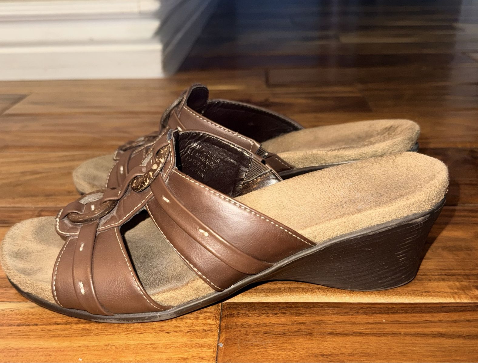 VenmoThese are a pair of women’s size 8 (they say 8 1/2 but run a little small). They are brown sandals. They are in decent condition beside the dark mark on the right foot. It has a size sticker on it and was hard to get off. Cash or Venmo.
