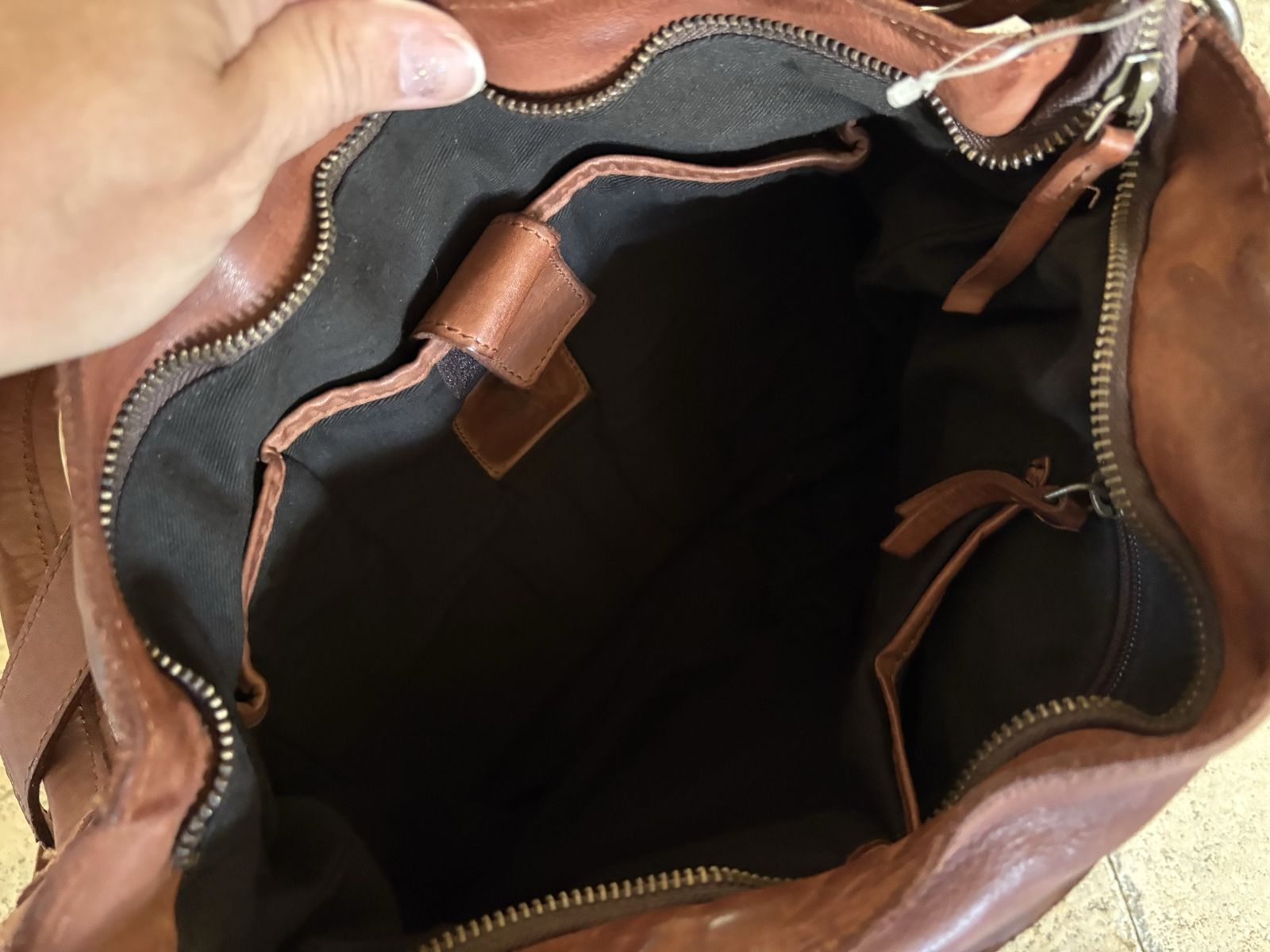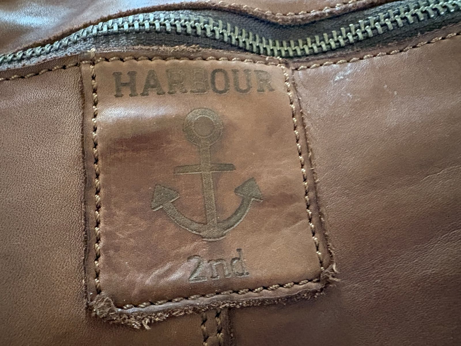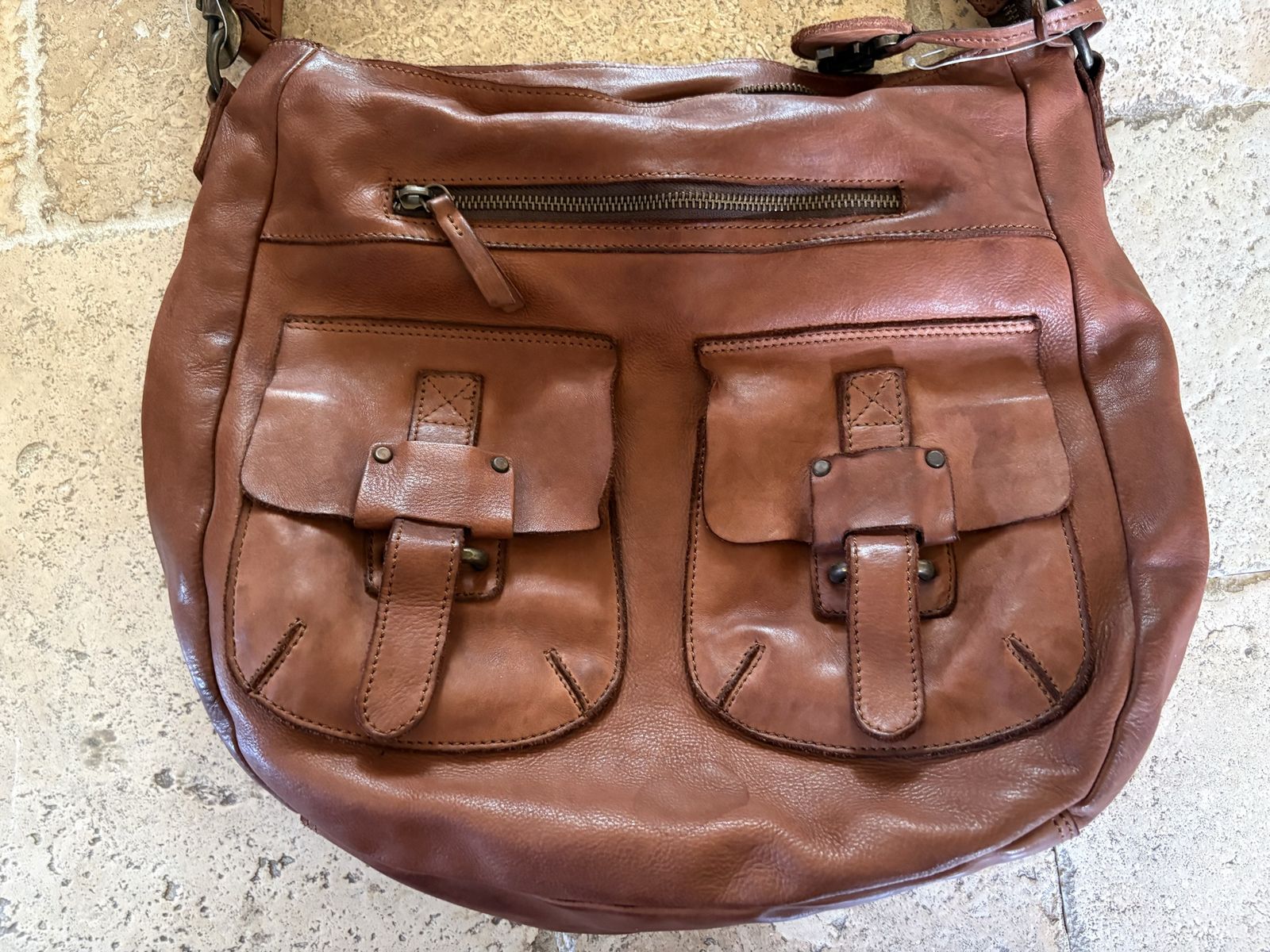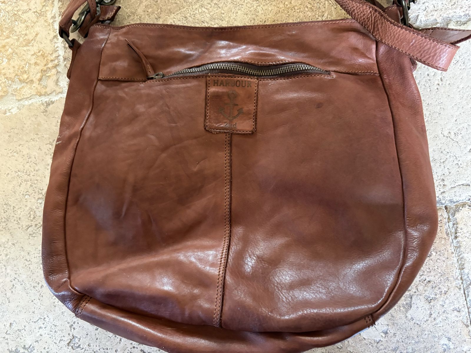 I have a beautiful soft brown leather bag by Harbour 2nd. It has a shoulder strap and a longer detachable crossbody strap. It has 2 outside pockets with buckles and a small zipper pocket on both sides. The main part of the purse has a zipper closure. The inside has a small zipper pocket and a large Velcro pocket. The bag is 15 inches wide and 13 1/2 inches tall. The shorter strap adds 8 inches. See my other ads for jewelry, artwork, home decor and more.