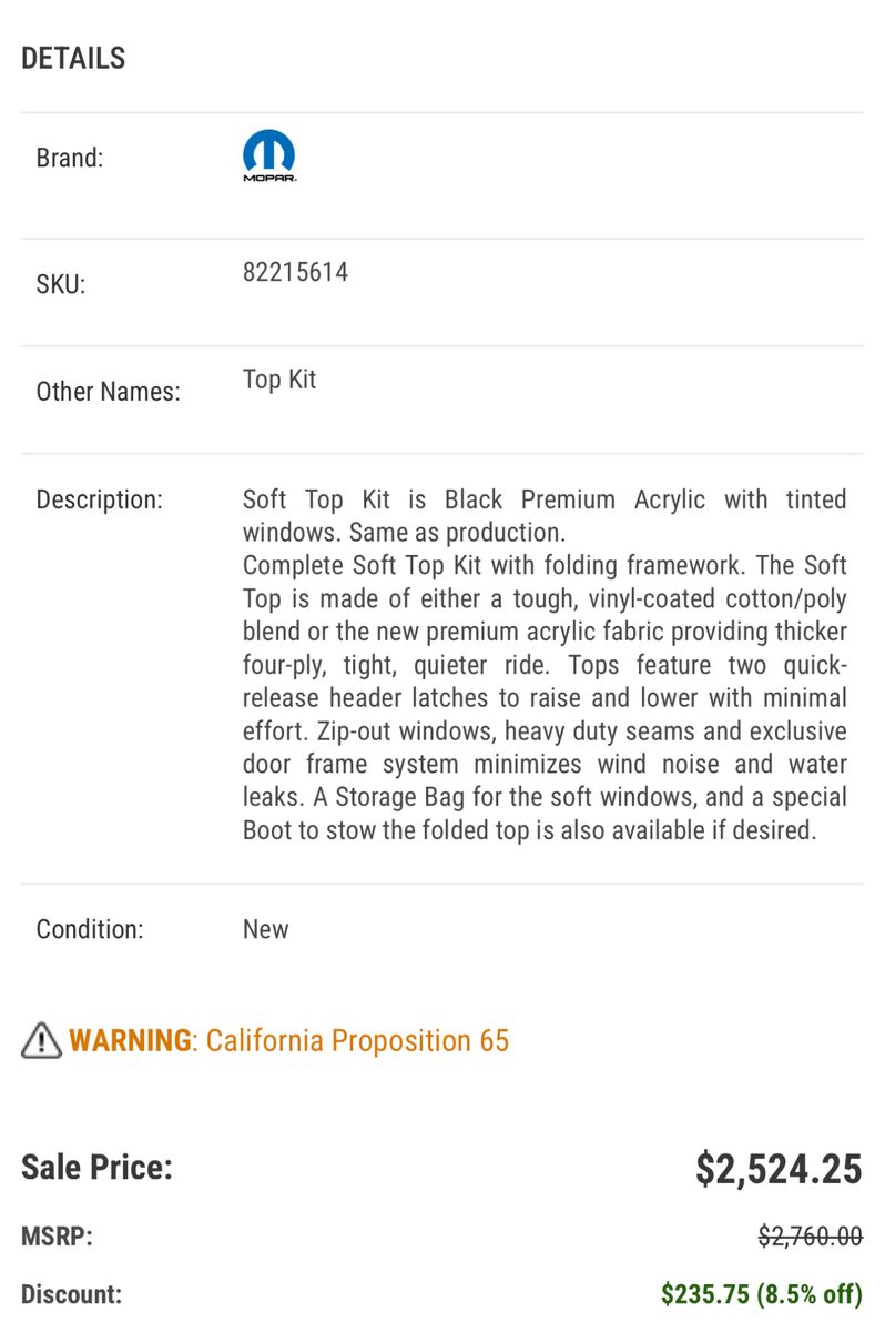 Soft Top Kit is Black Premium Acrylic with tinted windows. Same as production.