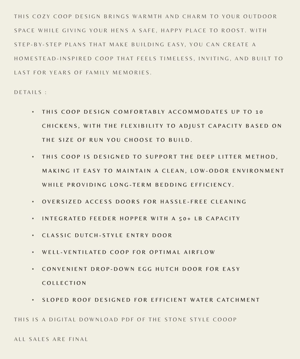 ApplePayThese plans give step by step instructions on how to build this coop along with a cut/materials list. Total cost was $800 but it can be built for less. All materials were bought from Home Depot. Digital download from this link. https://www.desireejasmin.com/chicken-coop Let me know if you have any questions.