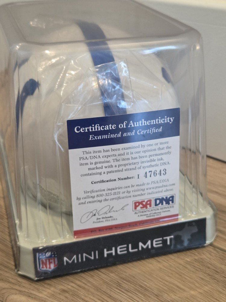 Peyton Manning Indianapolis Colts Autographed Riddell Mini Helmet with original COA from PSA/DNA authentication services inside. Also has NFL hologram sticker on the side. Date code: February 2012 Brand new, unopened.