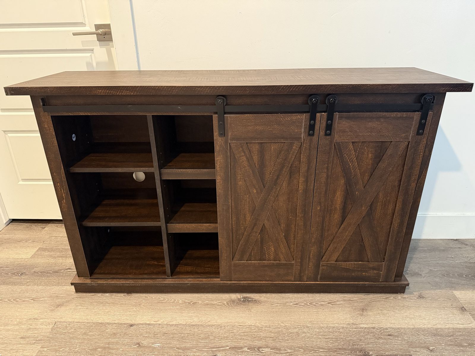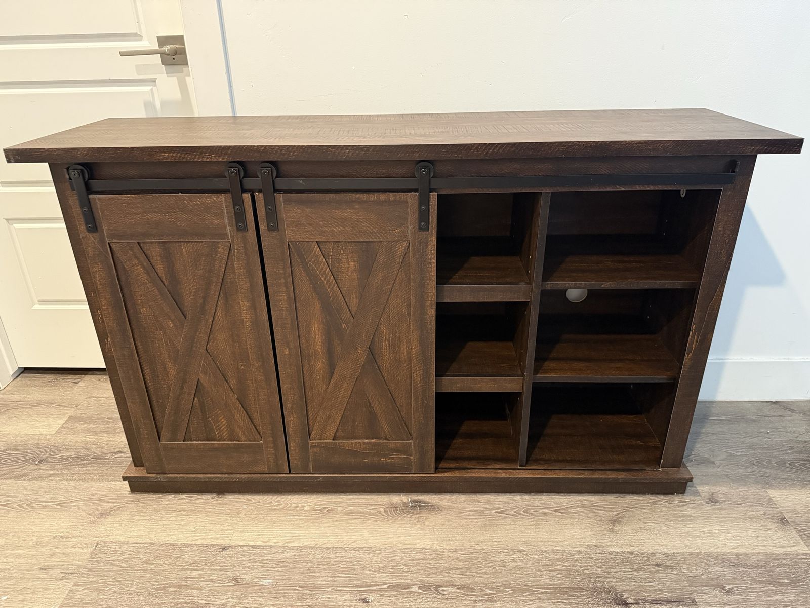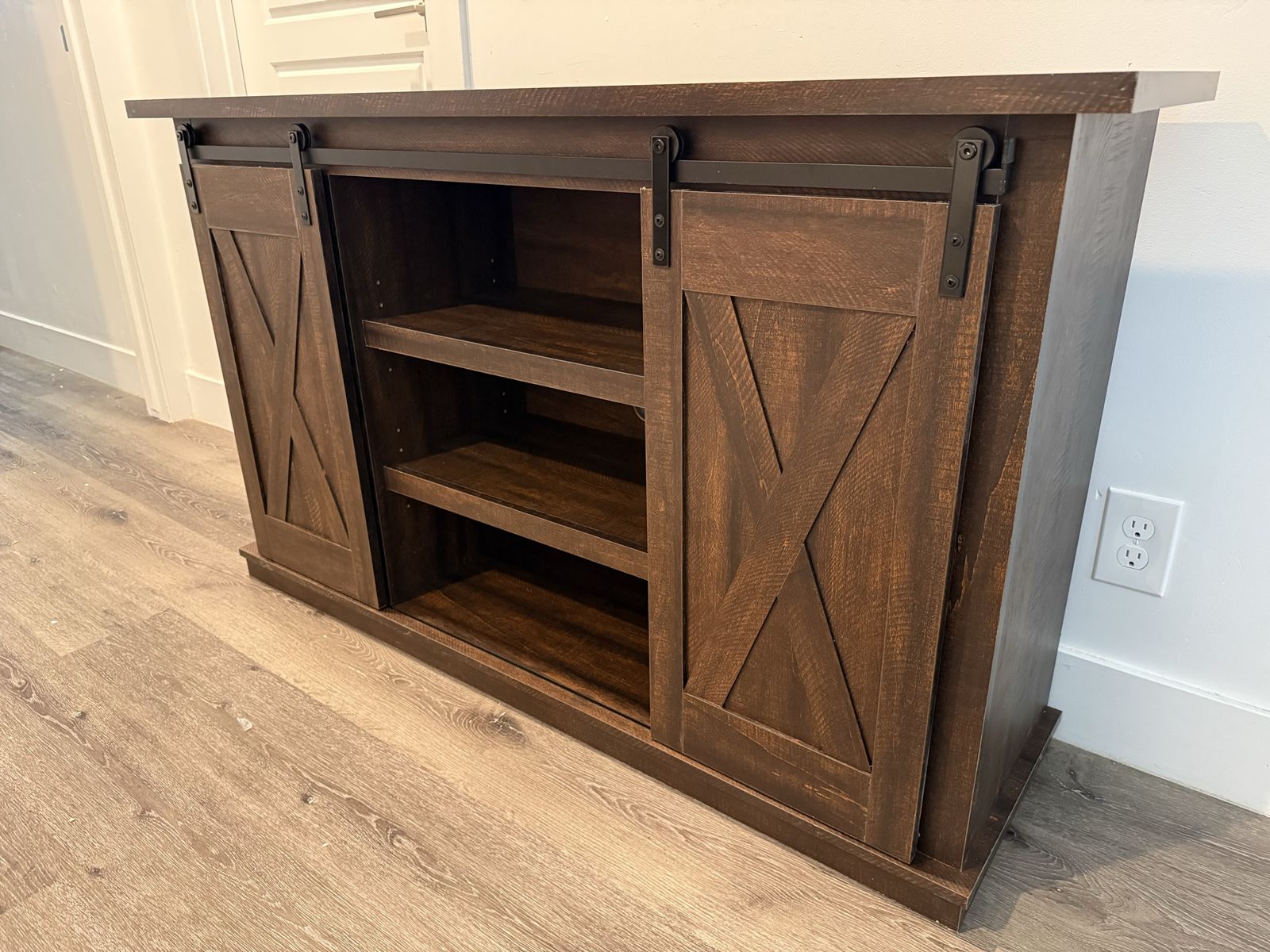 With its two-tone finish, crossbuck details and authentic charm, the Dorrinson TV stand is right in tune with your relaxed approach to high style. Beautifully made to accommodate your media equipment, it’s well equipped with adjustable shelving, cutouts for wire management and, of course, a pair of sliding barn doors you can center or place to the side. What a mastery in modern farmhouse living.