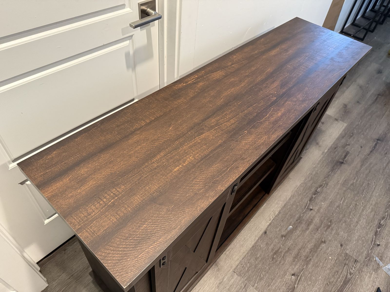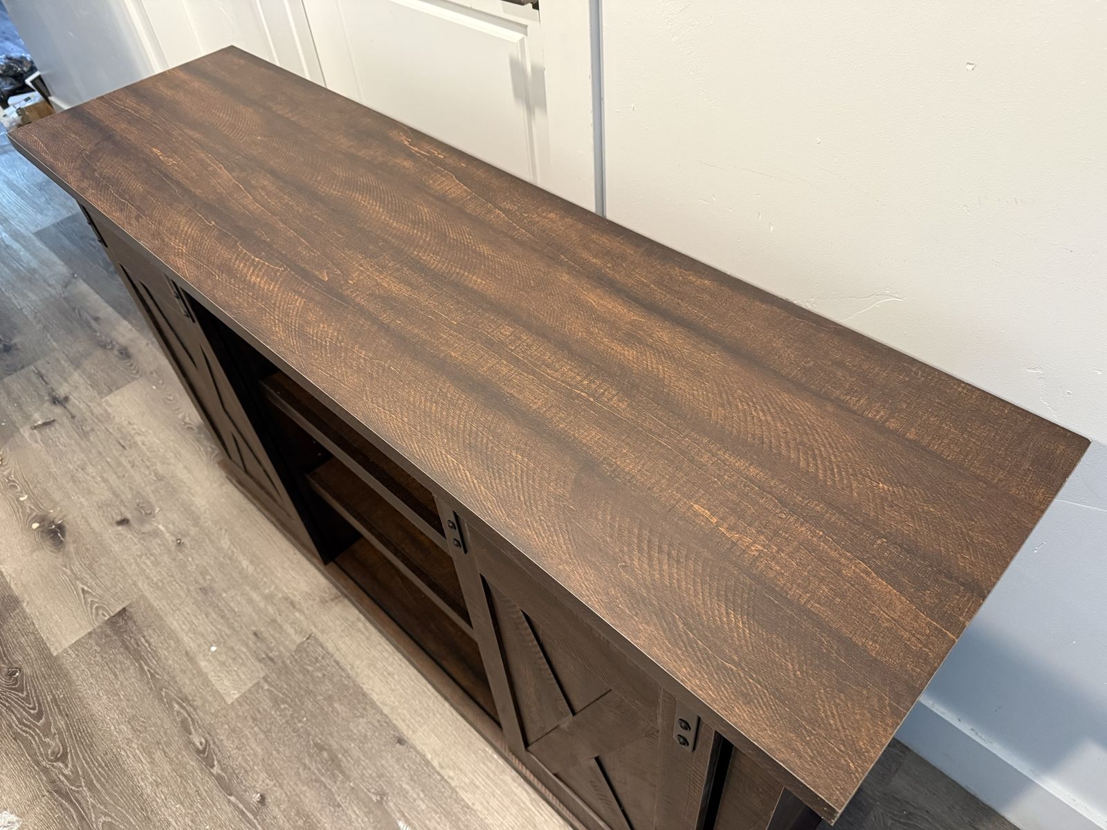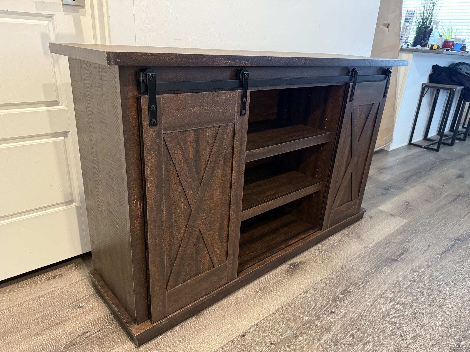 With its two-tone finish, crossbuck details and authentic charm, the Dorrinson TV stand is right in tune with your relaxed approach to high style. Beautifully made to accommodate your media equipment, it’s well equipped with adjustable shelving, cutouts for wire management and, of course, a pair of sliding barn doors you can center or place to the side. What a mastery in modern farmhouse living.