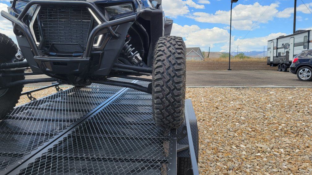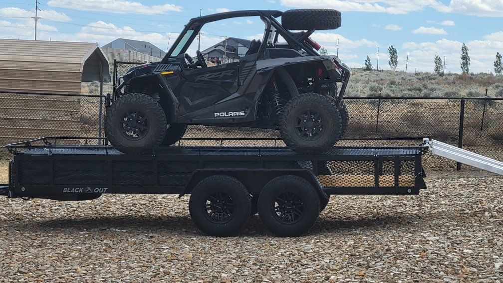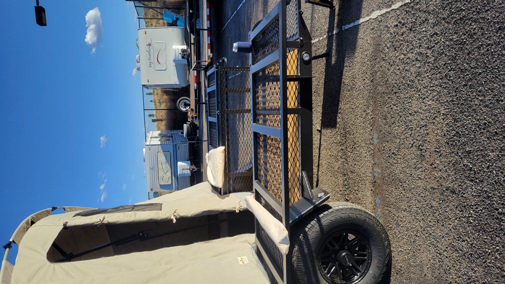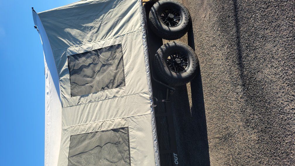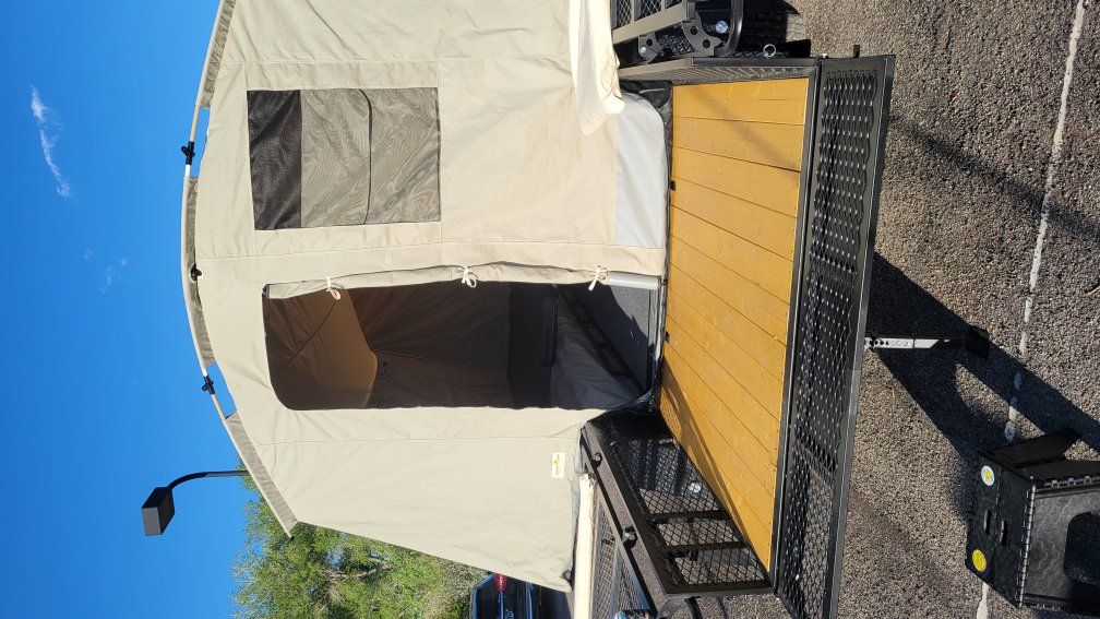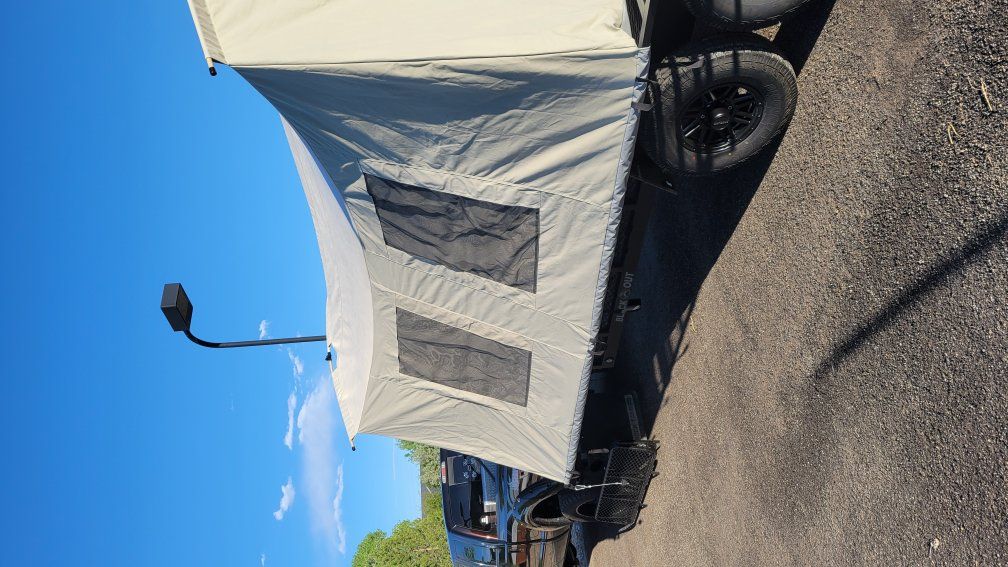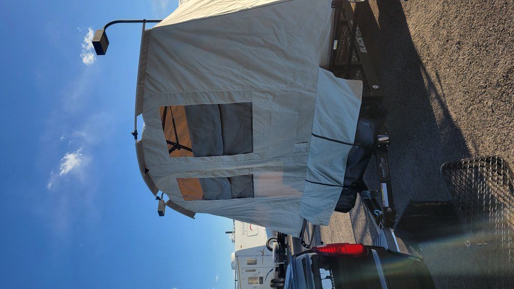 Jumbo Jumping Jack tent trailer. Blackout edition. comes with never been used porta potty. 2- 5 gallon water jugs, aluminum ramps to load utv or atv. used around 10 times