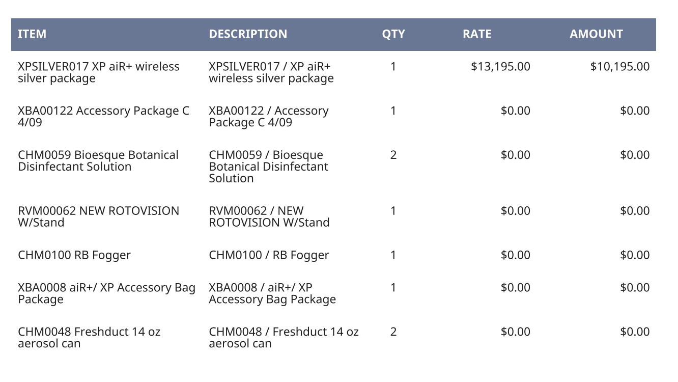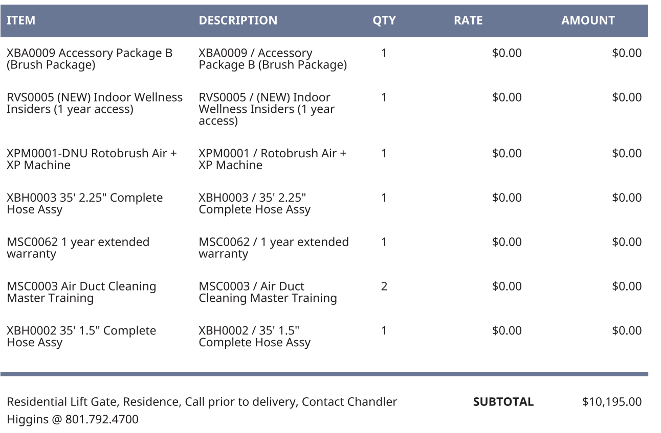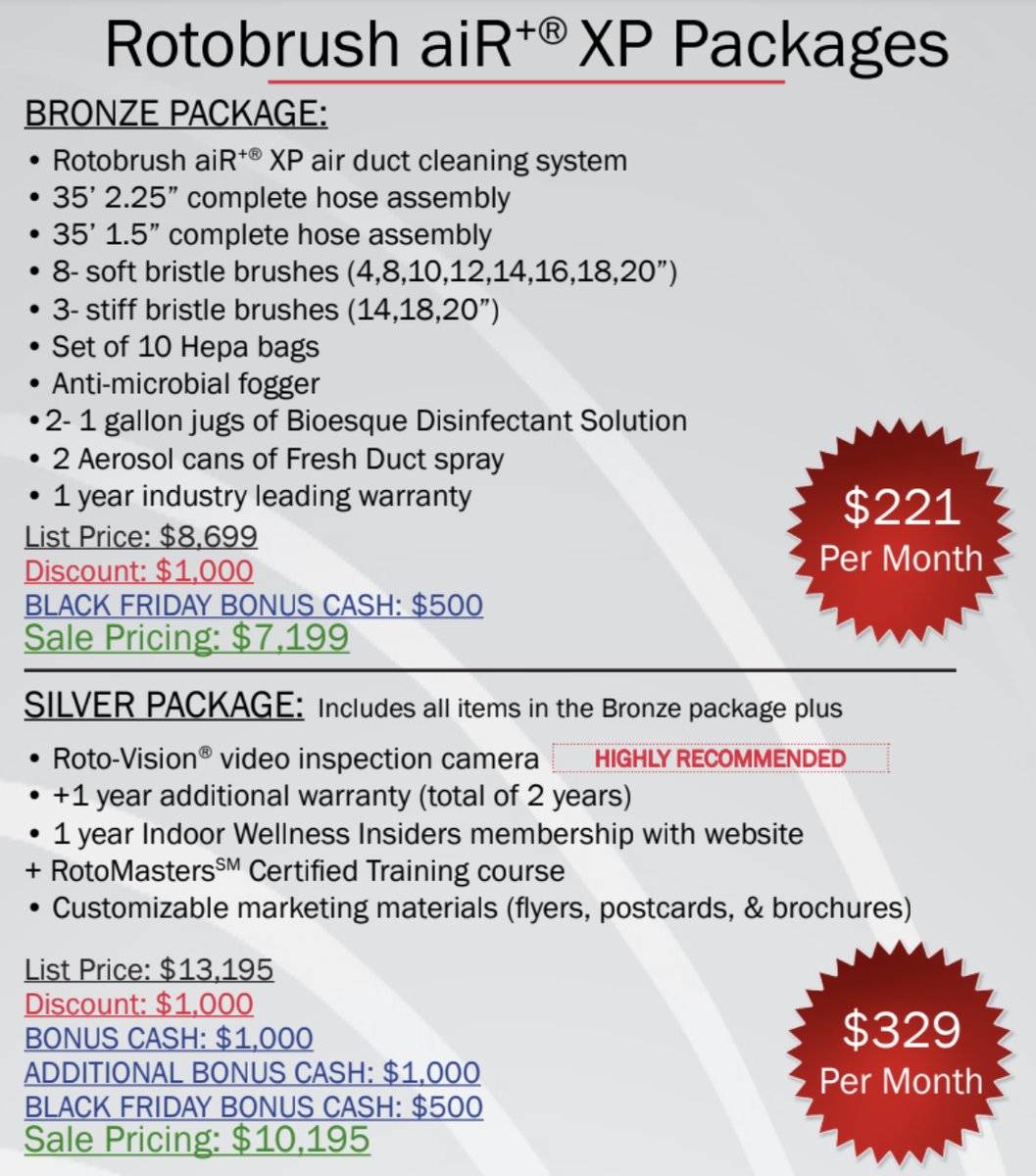 • Rotobrush aiR+® XP air duct cleaning system • 35’ 2.25” complete hose assembly • 35’ 1.5” complete hose assembly • 8- soft bristle brushes (4,8,10,12,14,16,18,20”) • 3- stiff bristle brushes (14,18,20”) • Set of 10 Hepa bags • Anti-microbial fogger •2- 1 gallon jugs of Bioesque Disinfectant Solution • 2 Aerosol cans of Fresh Duct spray • 1 year industry leading warranty