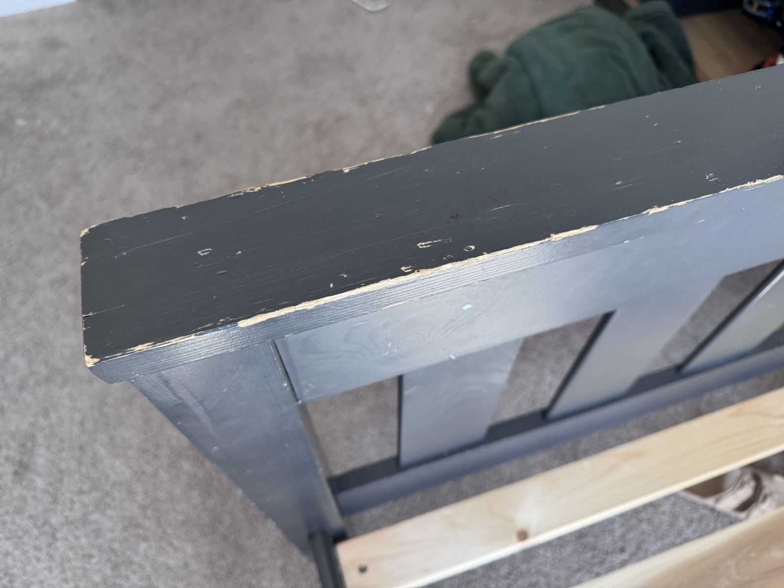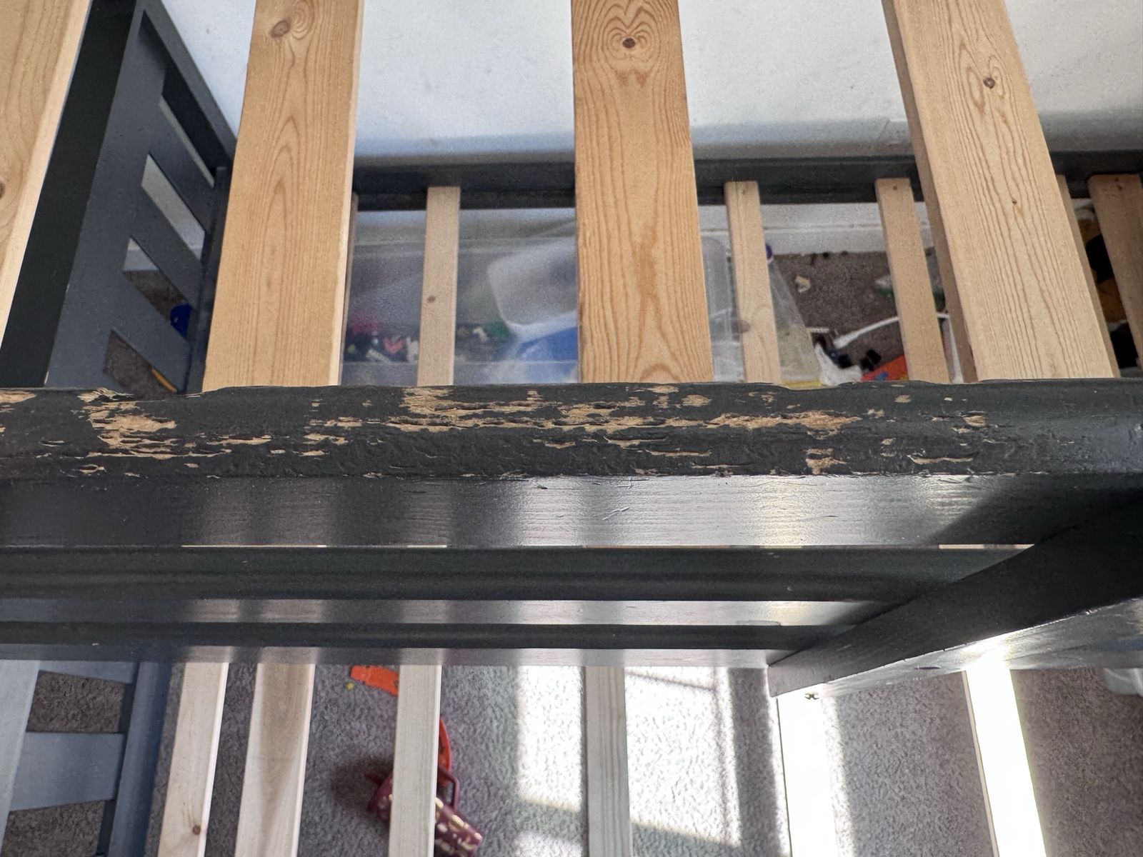 It’s about 5 years old, but has been great. There’s some normal wear and tear on the footboard and the safety guard on the top bunk 🤷️