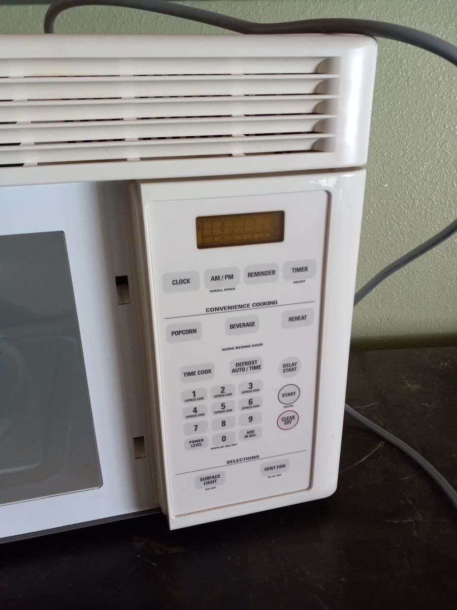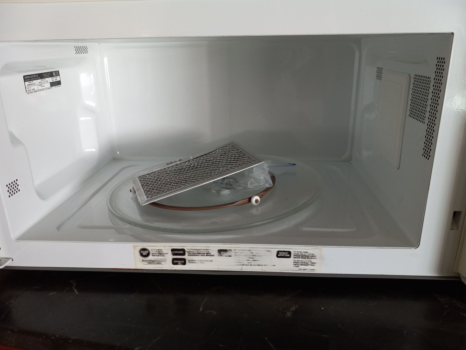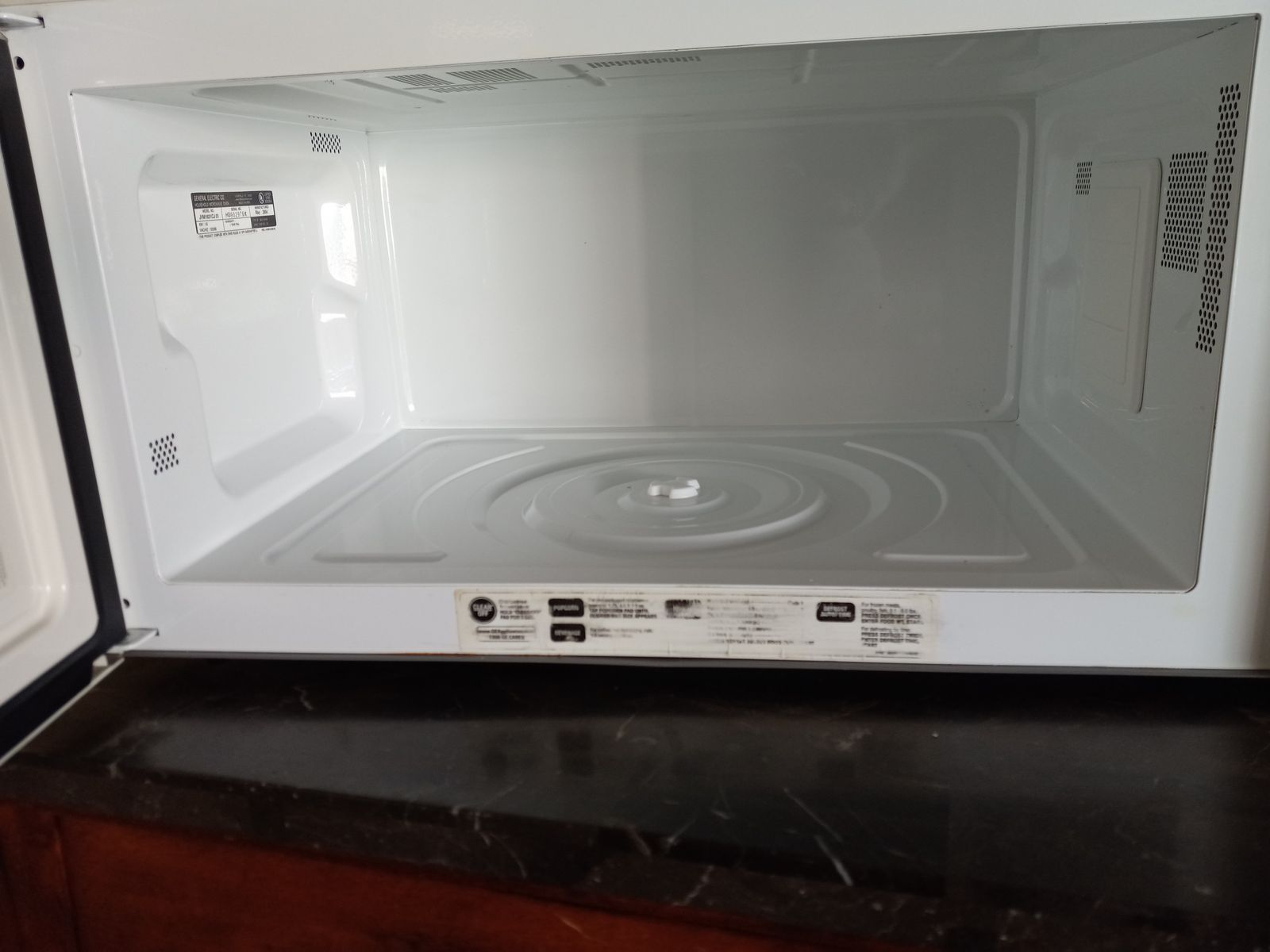 Clean, barely used above stove/range microwave. General Electric, in a white/bisque color. Includes mounting plate, new filter and inside plate. $35 obo
