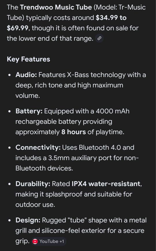 Trendwoo tr music tube bt speaker excellent new condition. clear sound with great bass. xbass asking 20 cash only.