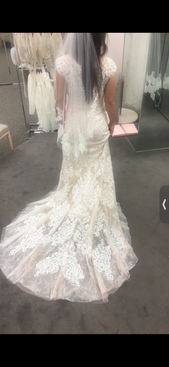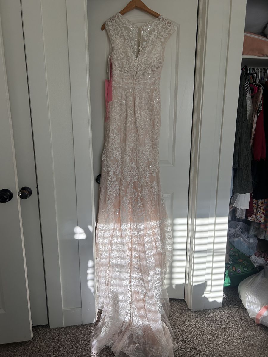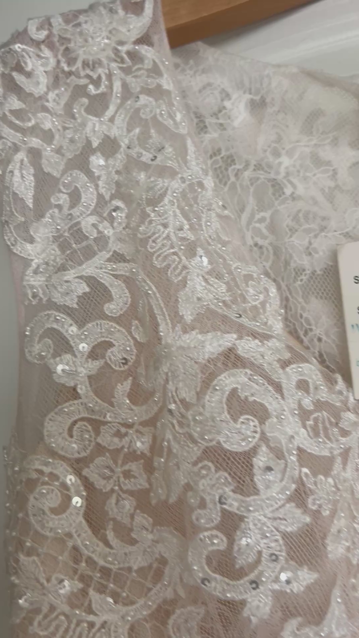 This dress offers incredible value for a high-end designer piece — over 40% off retail! The delicate lace, soft blush tones, and flowing train create a timeless and sophisticated look that photographs beautifully.