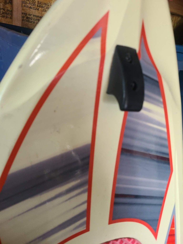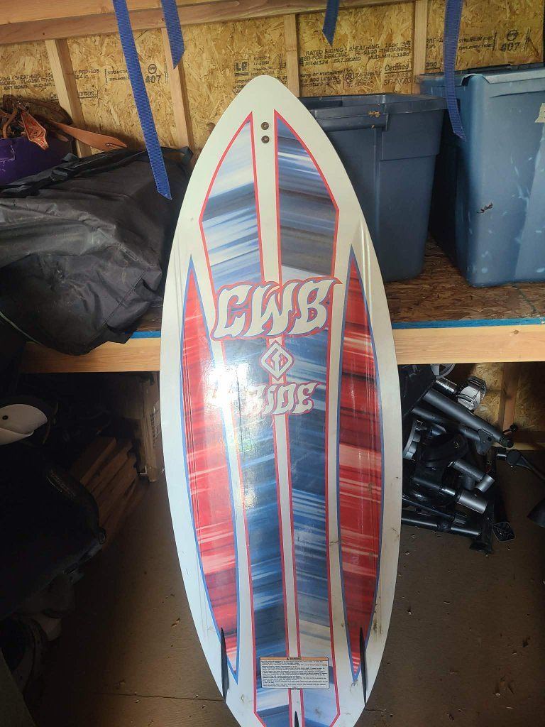 Tall and wide lake surf board, skurfer board. Has a tow rope holder so you can get up easier if wanting to start in a tow behind position like a kneeboard, get balance and learn to stand (perfect for learning). Has fins, very padded and grippy. Great shape 63.5" tall