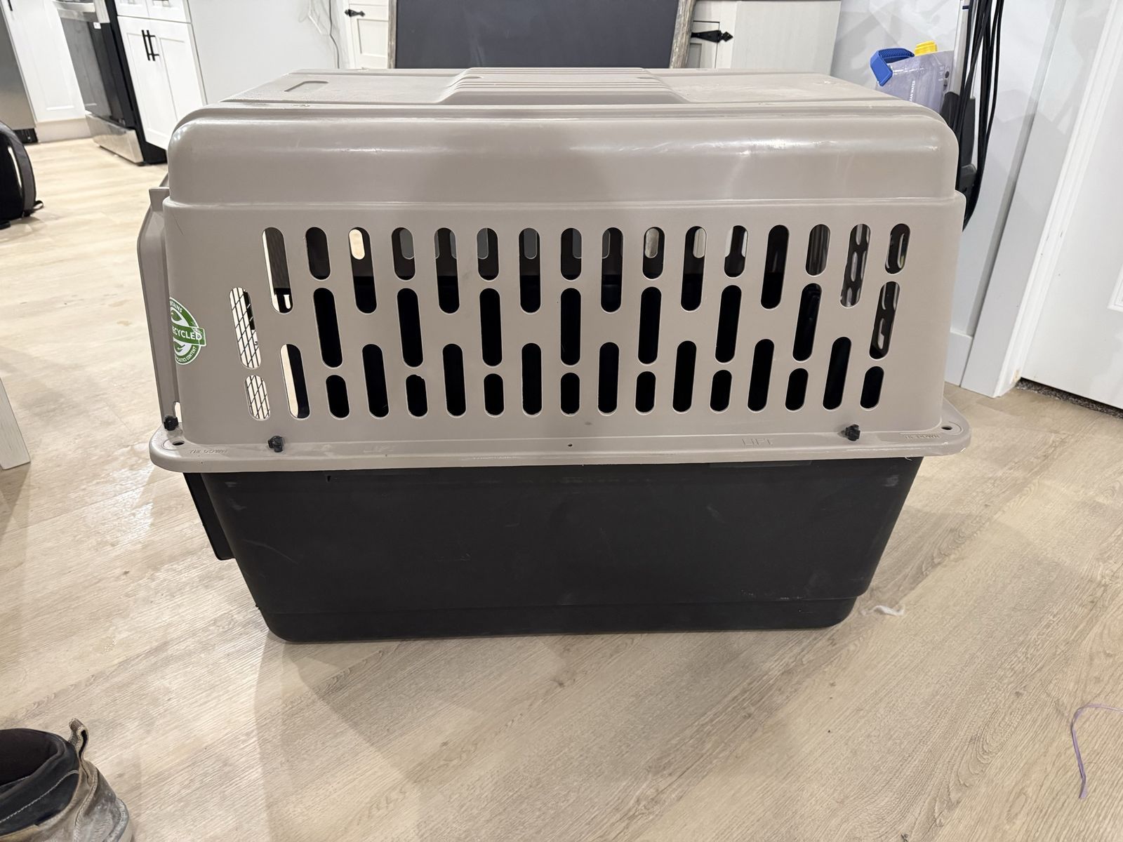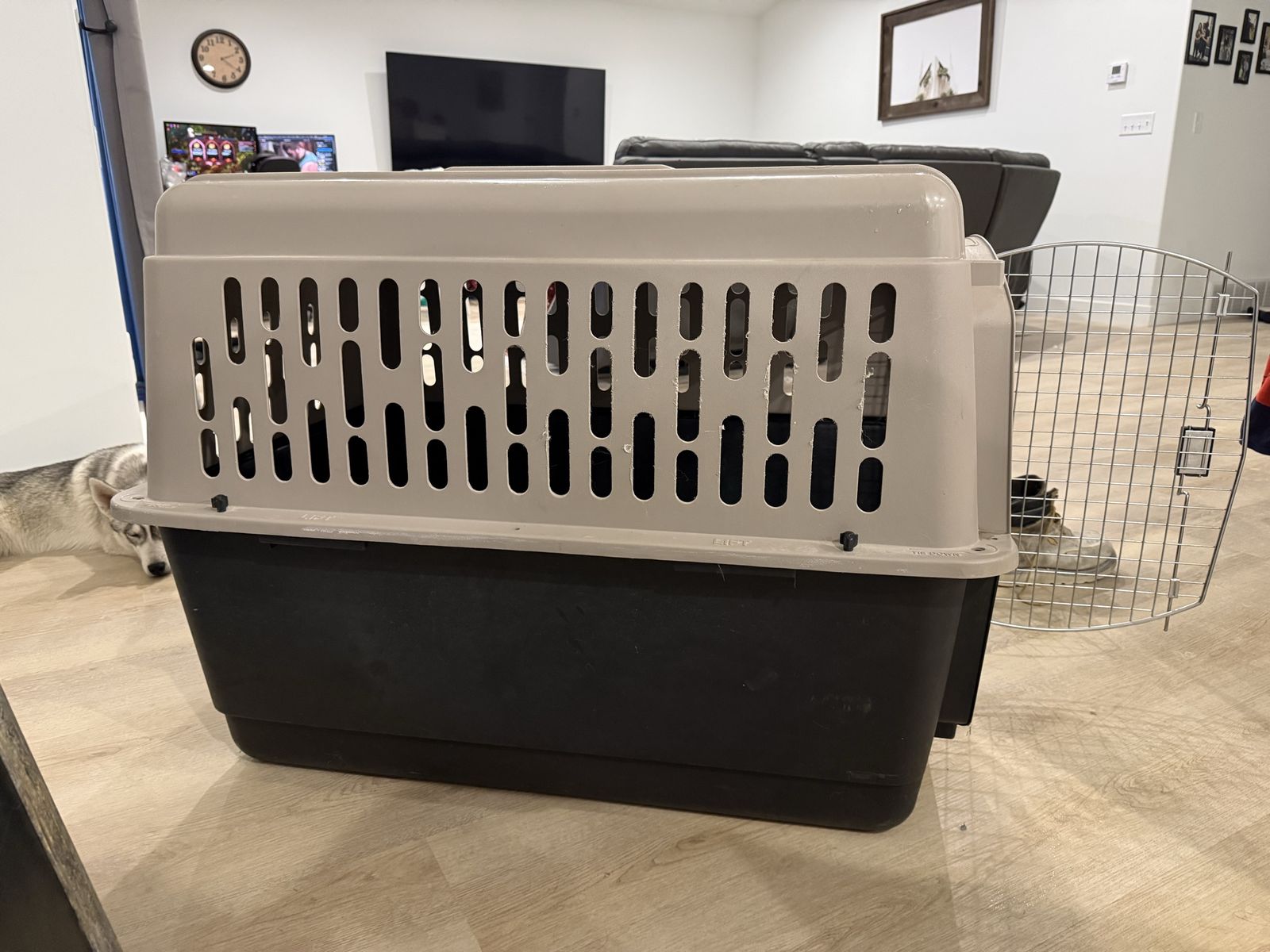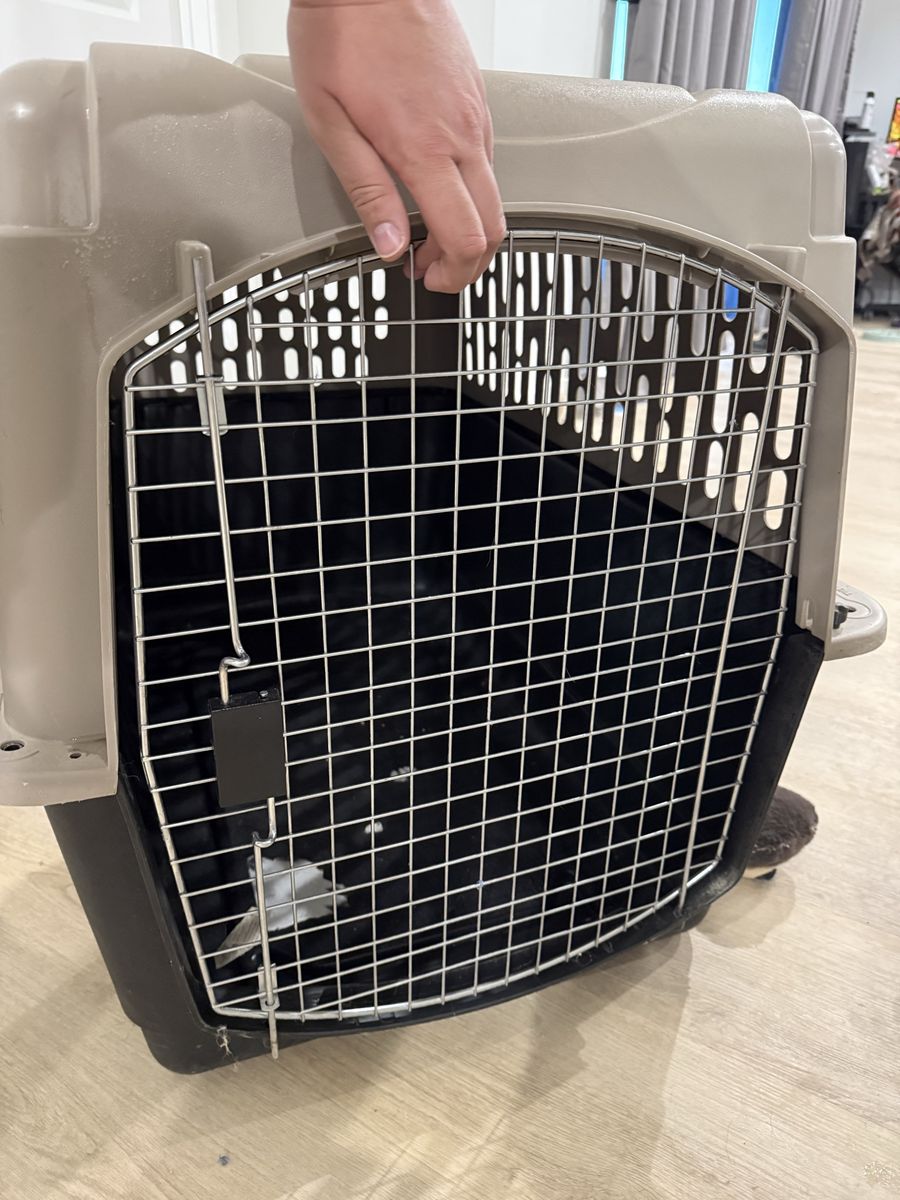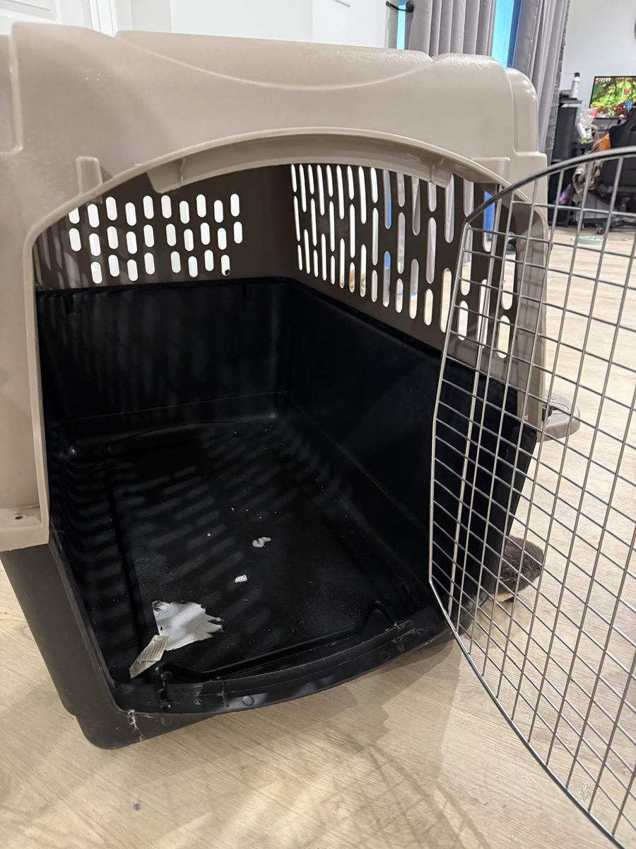 VenmoThis is a large plastic dog kennel. It’s in good shape, just needs a good inside cleaning :). Nothing is wrong with it, our dog is just an escape artist so we had to get something that was heavier duty. I believe it breaks down! But is currently in one piece.