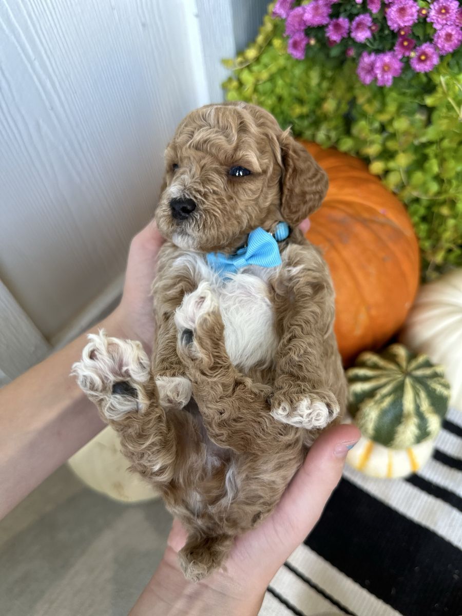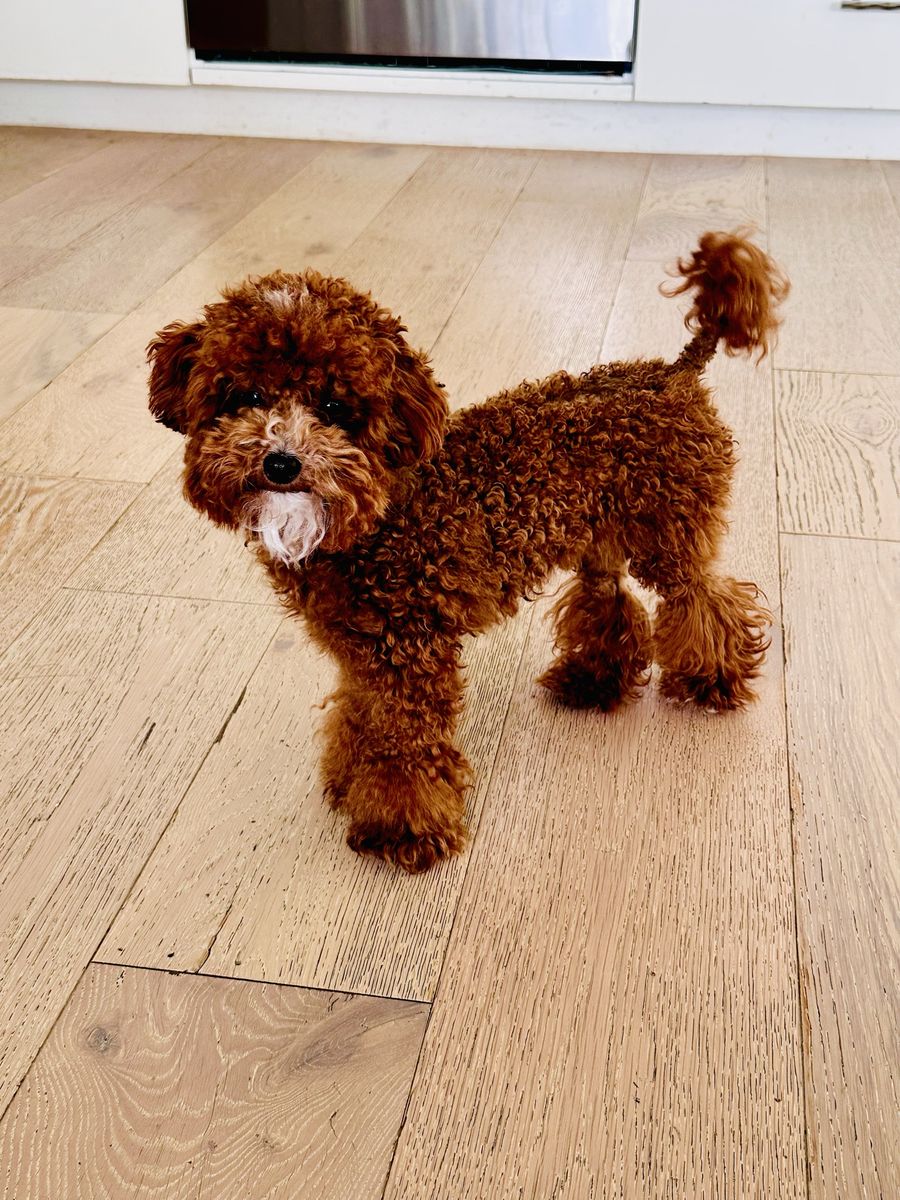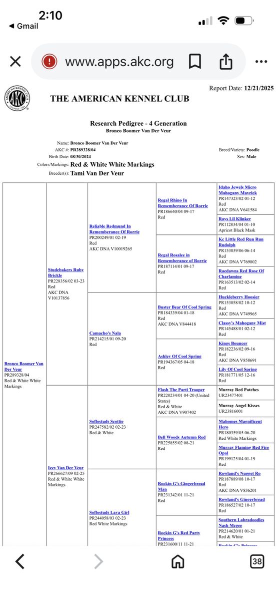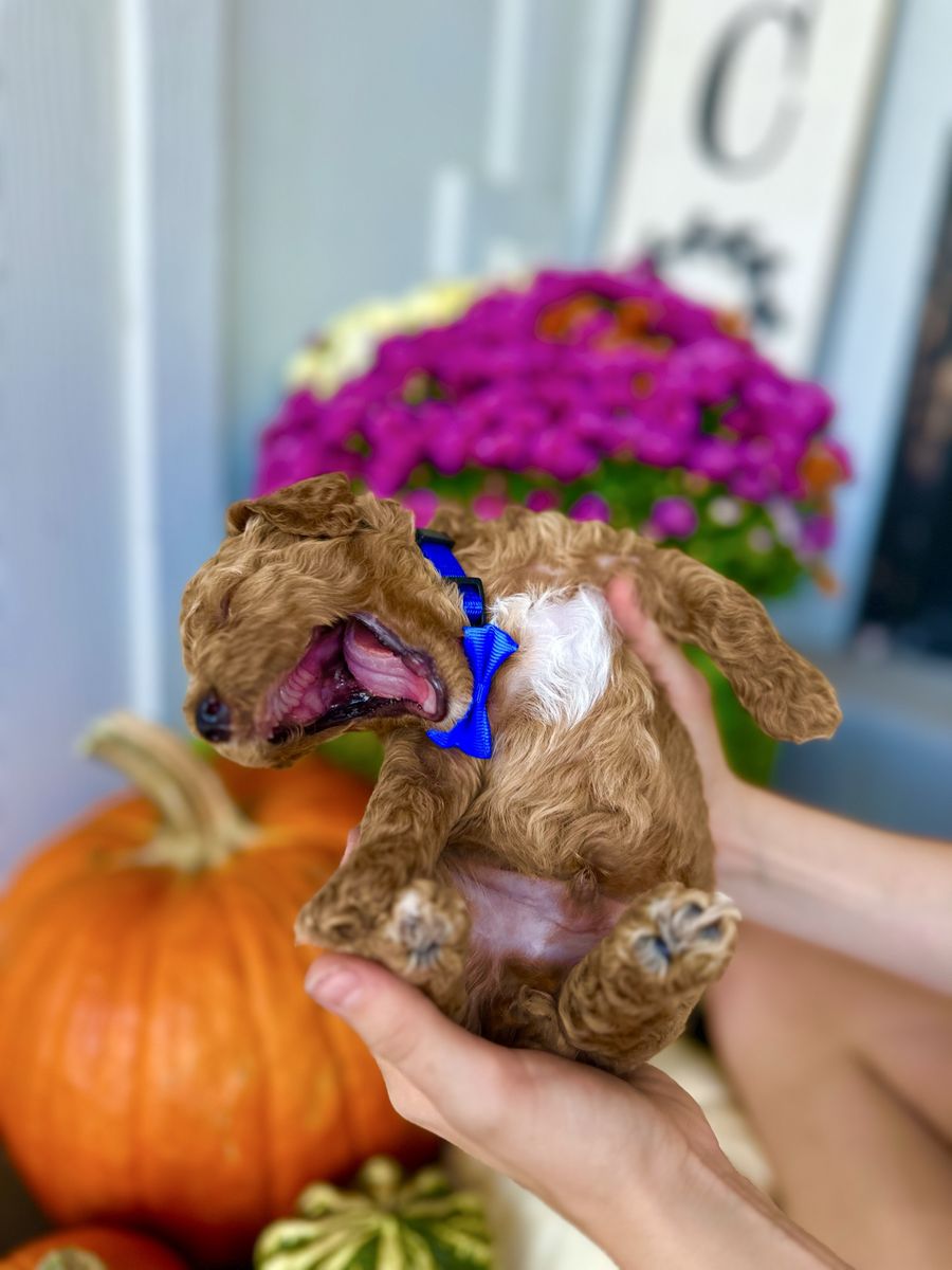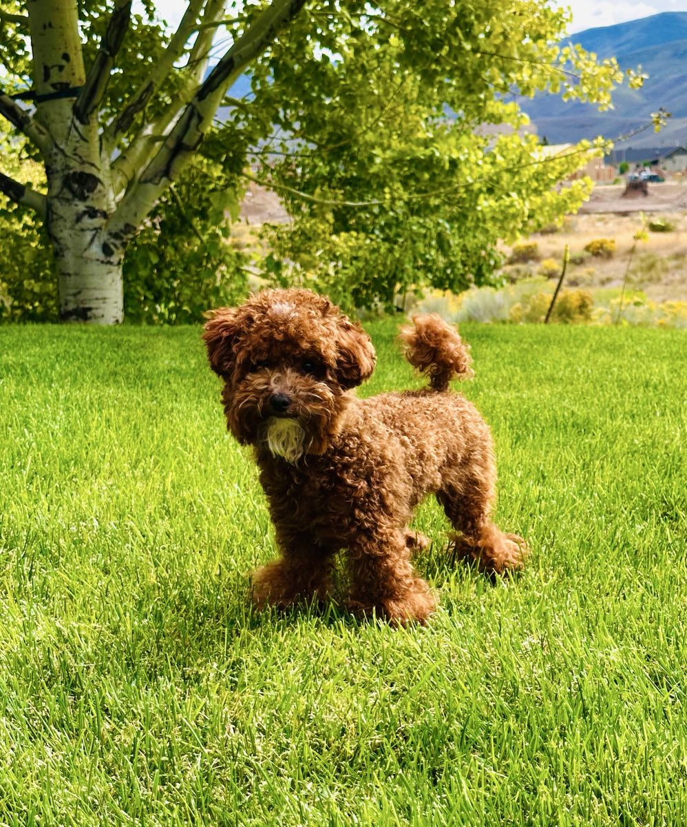 Bronco produces the most beautiful, tiny, fluffy puppies with abstract markings and deep red coloring. If you are breeding a mini or larger dog and want much smaller pups, he’s definitely the stud for you. He carries the Ssp trait and also piebald (white markings) trait which produces a special coat patterns that are just beautiful. He carries 2 copies of dominant red. He also carries the hidden phantom gene which offers more cost color varieties in your litter. Bronco is fully furnished and produces pups with gorgeous coats. He carry’s 2 copies of curly coat which produces a full fluffy teddy bear coat and 2 copies of full, long hair. Bronco carrie’s 1 copy of IVDD and is clear of all poodle specific diseases.