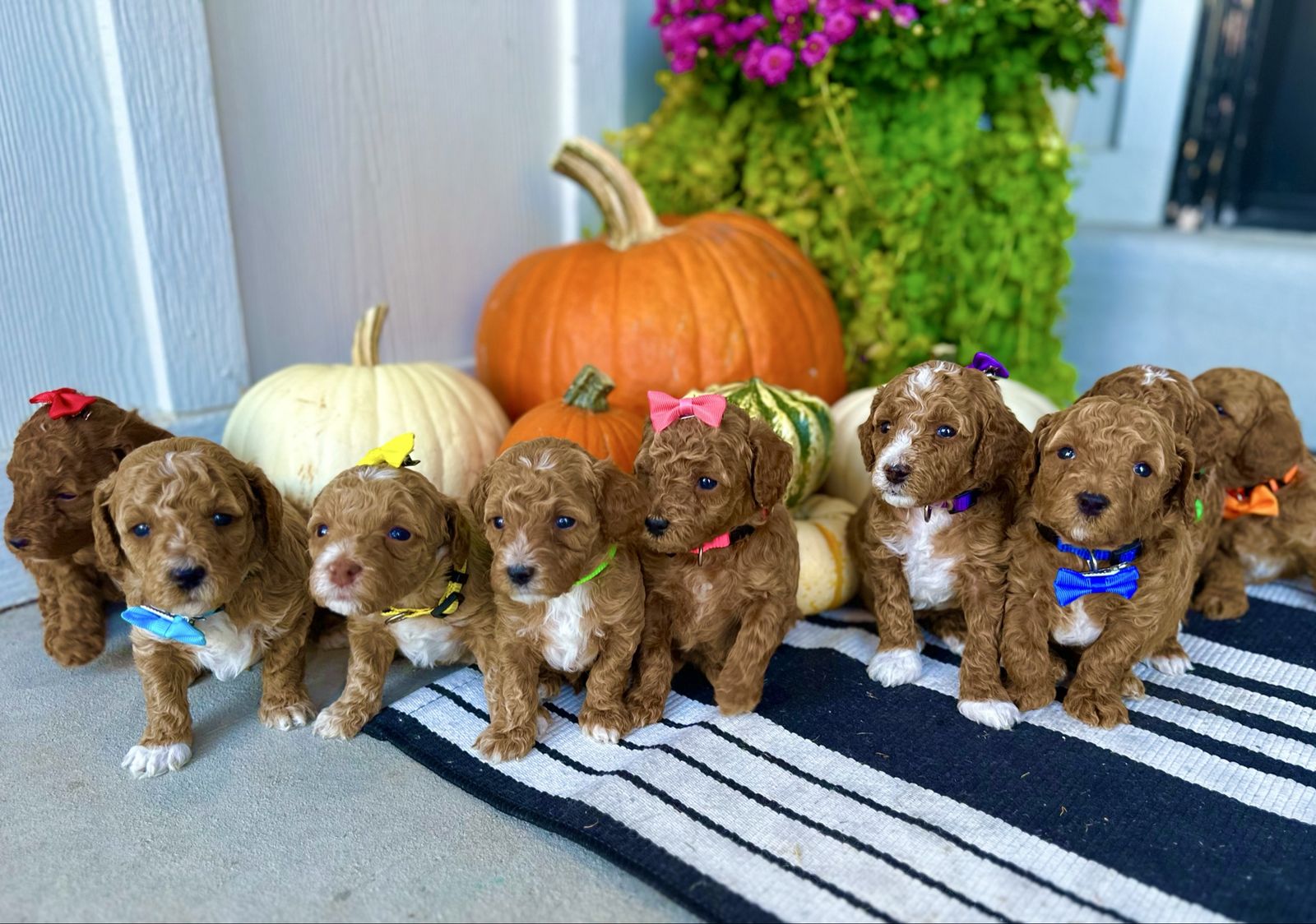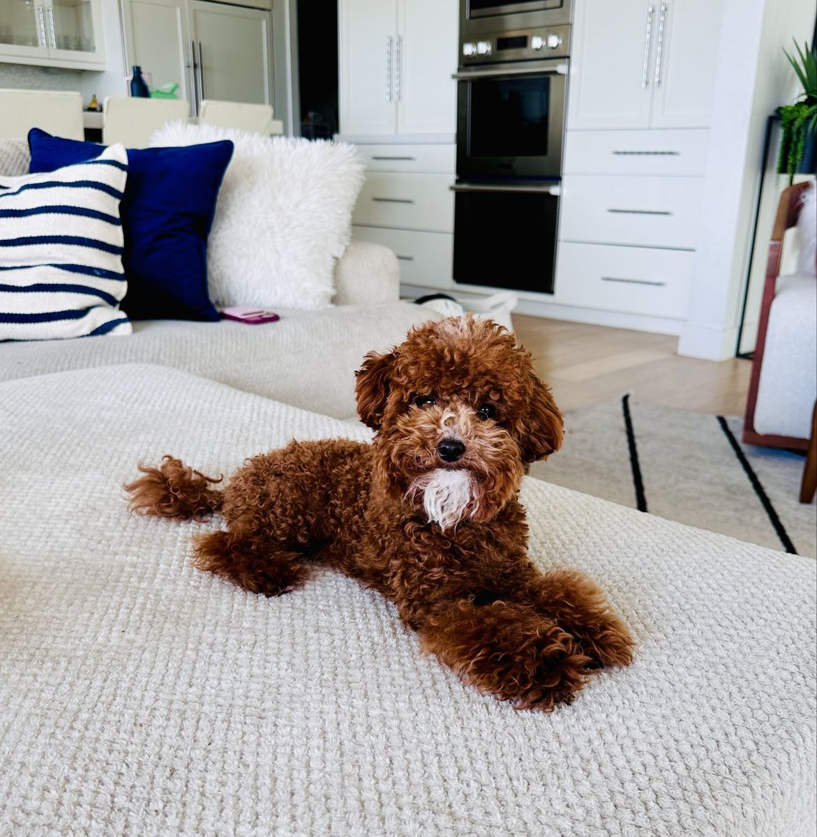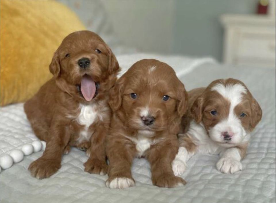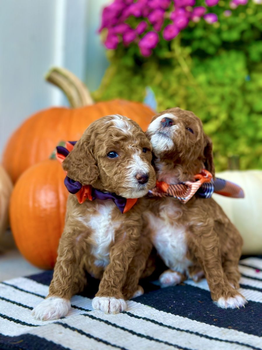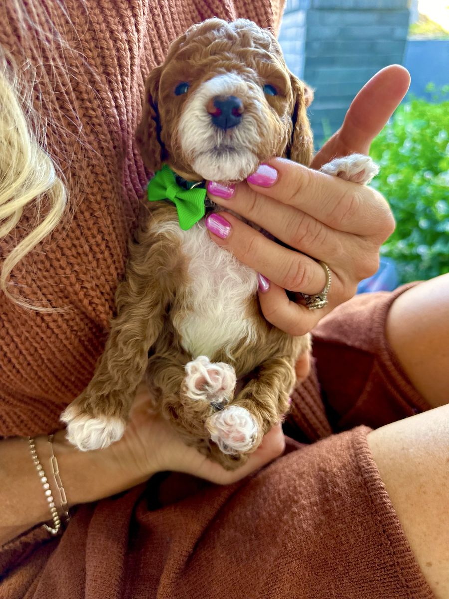 Bronco produces the most beautiful, tiny, fluffy puppies with abstract markings and deep red coloring. If you are breeding a mini or larger dog and want much smaller pups, he’s definitely the stud for you. He carries the Ssp trait and also piebald (white markings) trait which produces a special coat patterns that are just beautiful. He carries 2 copies of dominant red. He also carries the hidden phantom gene which offers more cost color varieties in your litter. Bronco is fully furnished and produces pups with gorgeous coats. He carry’s 2 copies of curly coat which produces a full fluffy teddy bear coat and 2 copies of full, long hair. Bronco carrie’s 1 copy of IVDD and is clear of all poodle specific diseases.