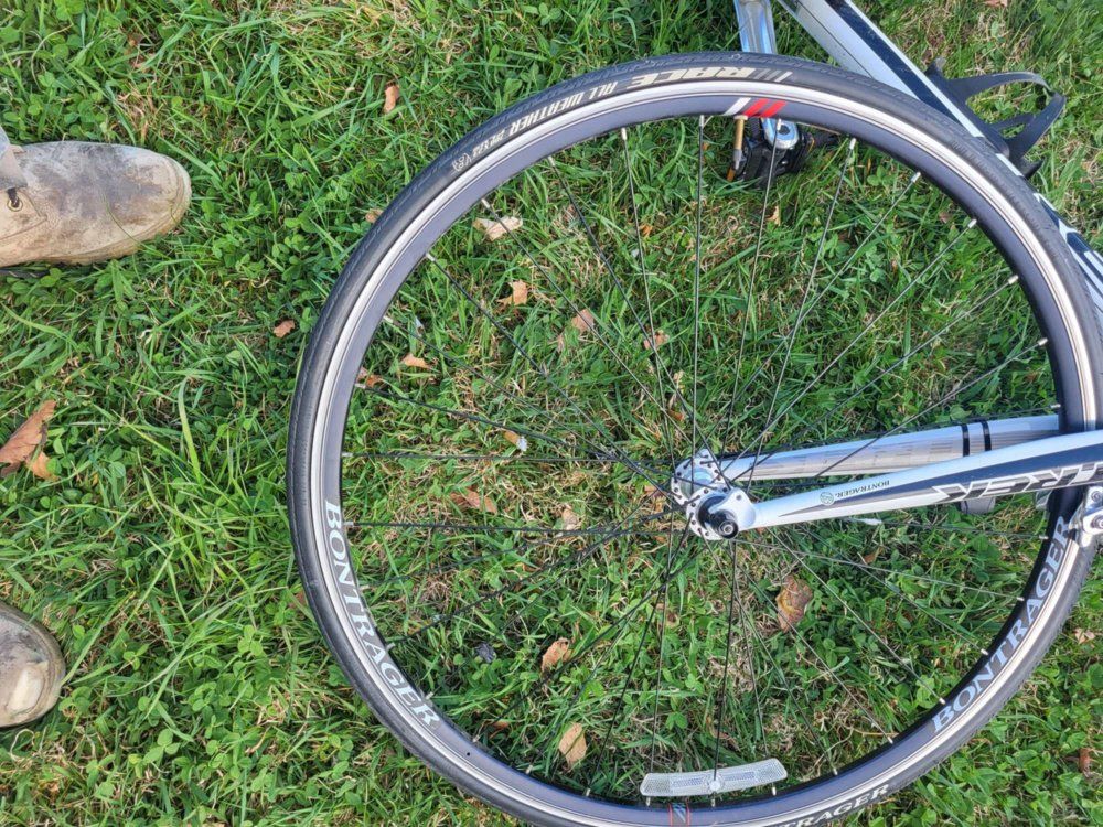 The bike has a flat on the back. Tire should have lifetime warranties on rims and frame.