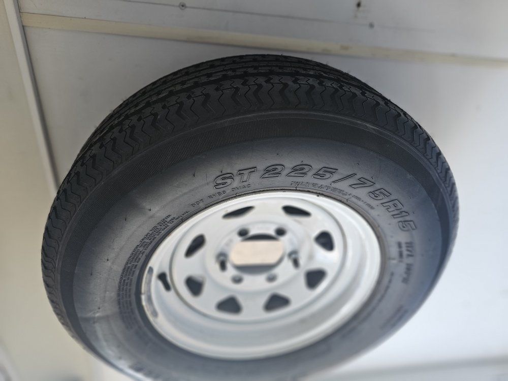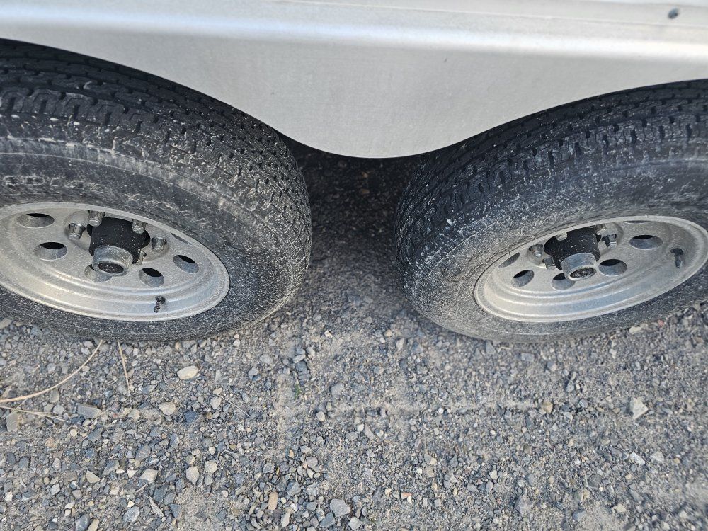 LARGE MAN DOOR WITH REAR RAMP. 6-LUG 5000 LB. AXLES WITH NEW TIRES AND NEW SPARE.