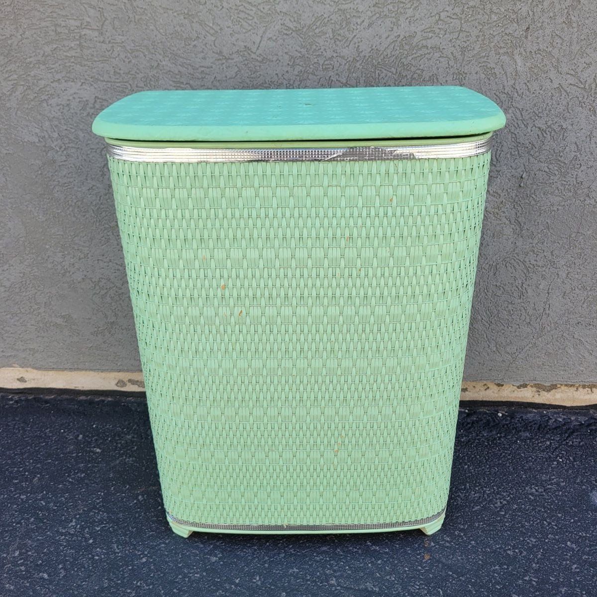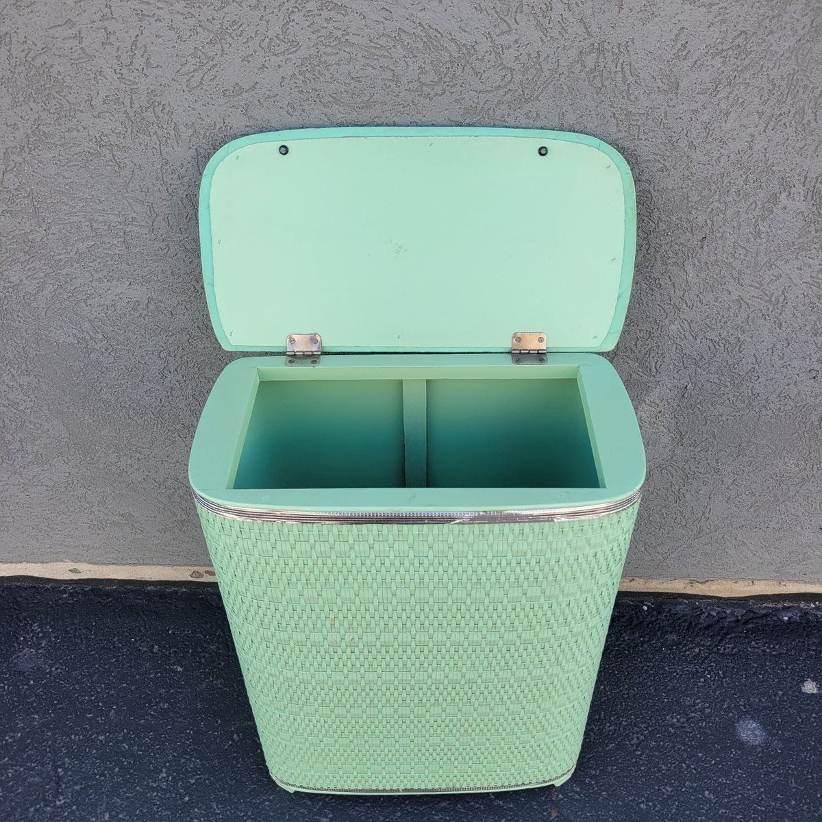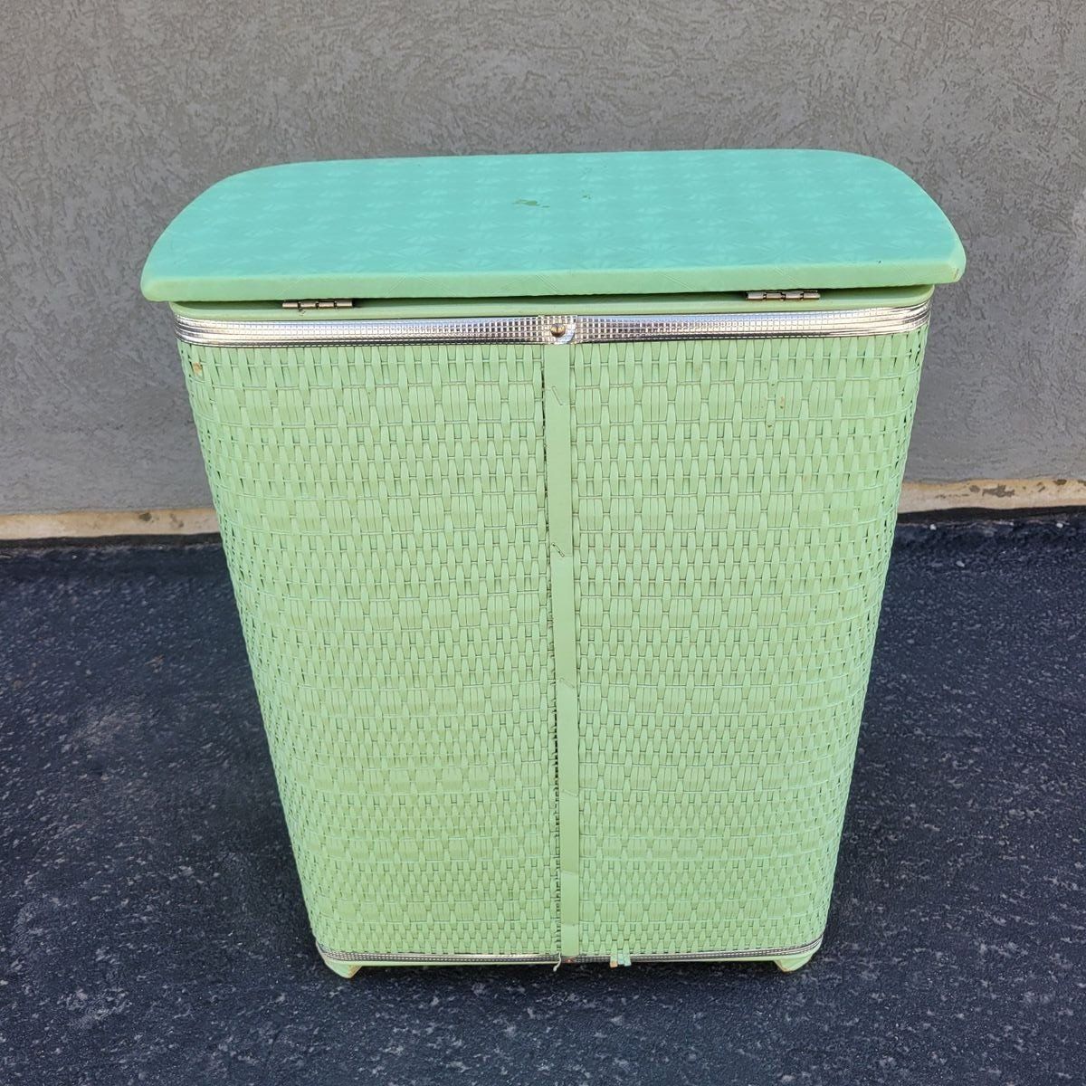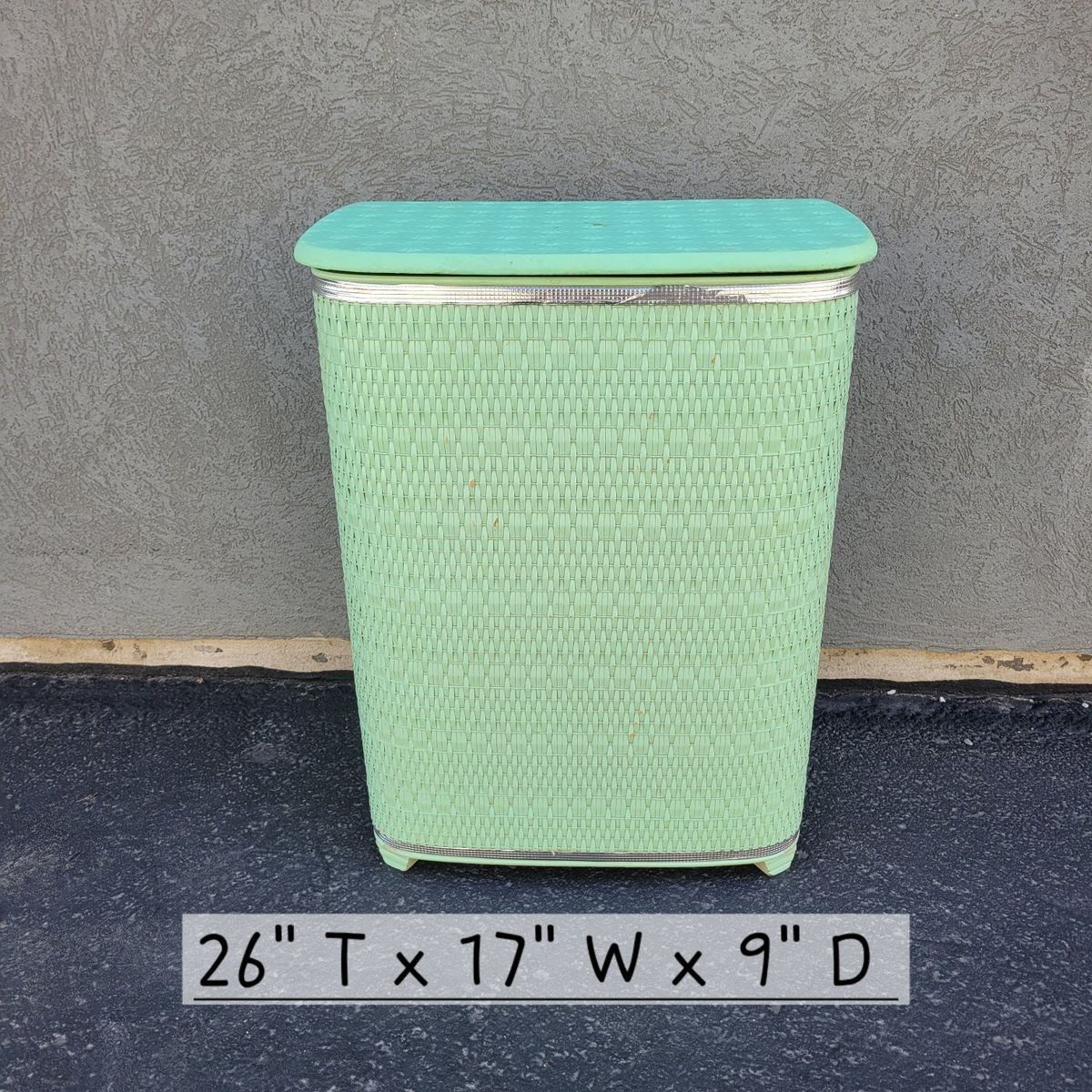 Such a fun vintage storage piece in the prettiest soft mint green. This wicker-look hamper has amazing texture and a classic retro shape that works beautifully in so many spaces. Perfect for use as a laundry hamper, toy storage, blanket bin, or even styled in a bathroom or bedroom for that cozy vintage feel. Lightweight but sturdy with a hinged lid and interior divider for easy organization. Shows some wear consistent with age, including minor scuffs and wear along the top trim, but overall displays beautifully. See photo for measurements.