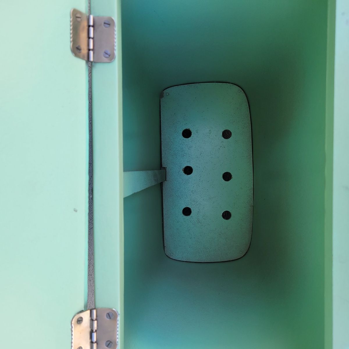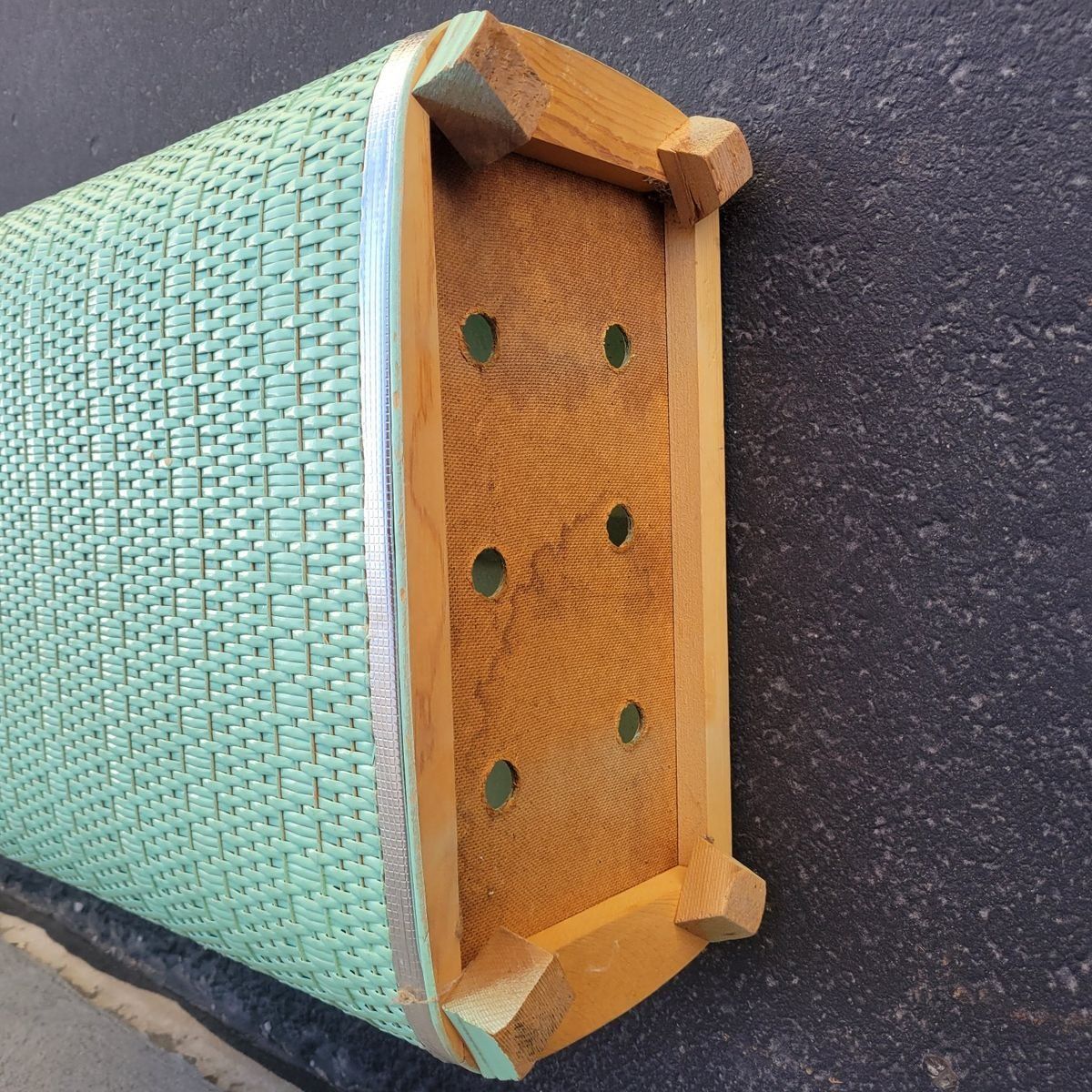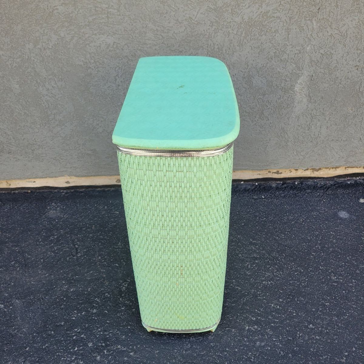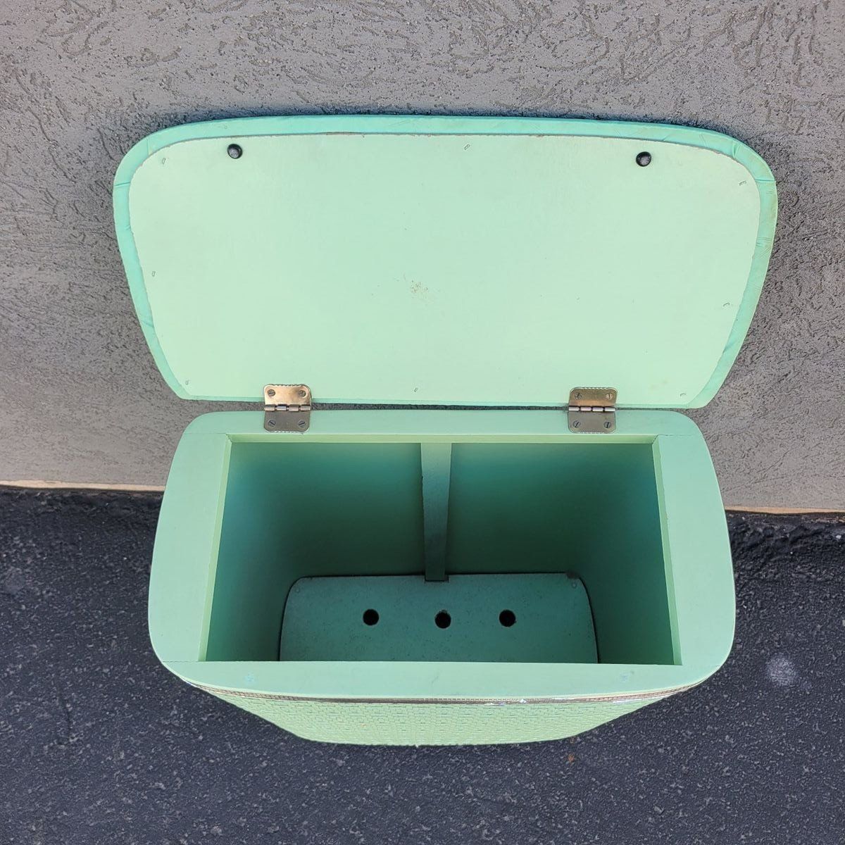 Such a fun vintage storage piece in the prettiest soft mint green. This wicker-look hamper has amazing texture and a classic retro shape that works beautifully in so many spaces. Perfect for use as a laundry hamper, toy storage, blanket bin, or even styled in a bathroom or bedroom for that cozy vintage feel. Lightweight but sturdy with a hinged lid and interior divider for easy organization. Shows some wear consistent with age, including minor scuffs and wear along the top trim, but overall displays beautifully. See photo for measurements.