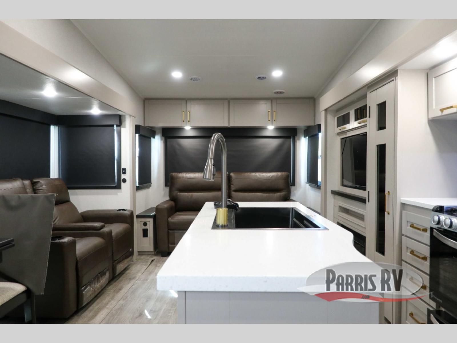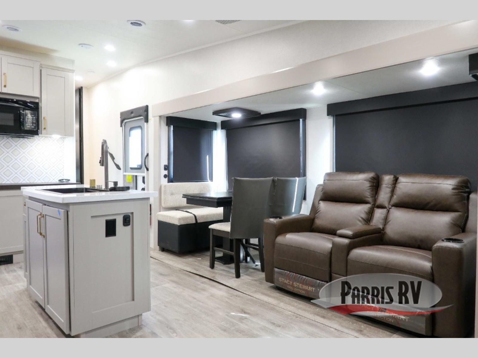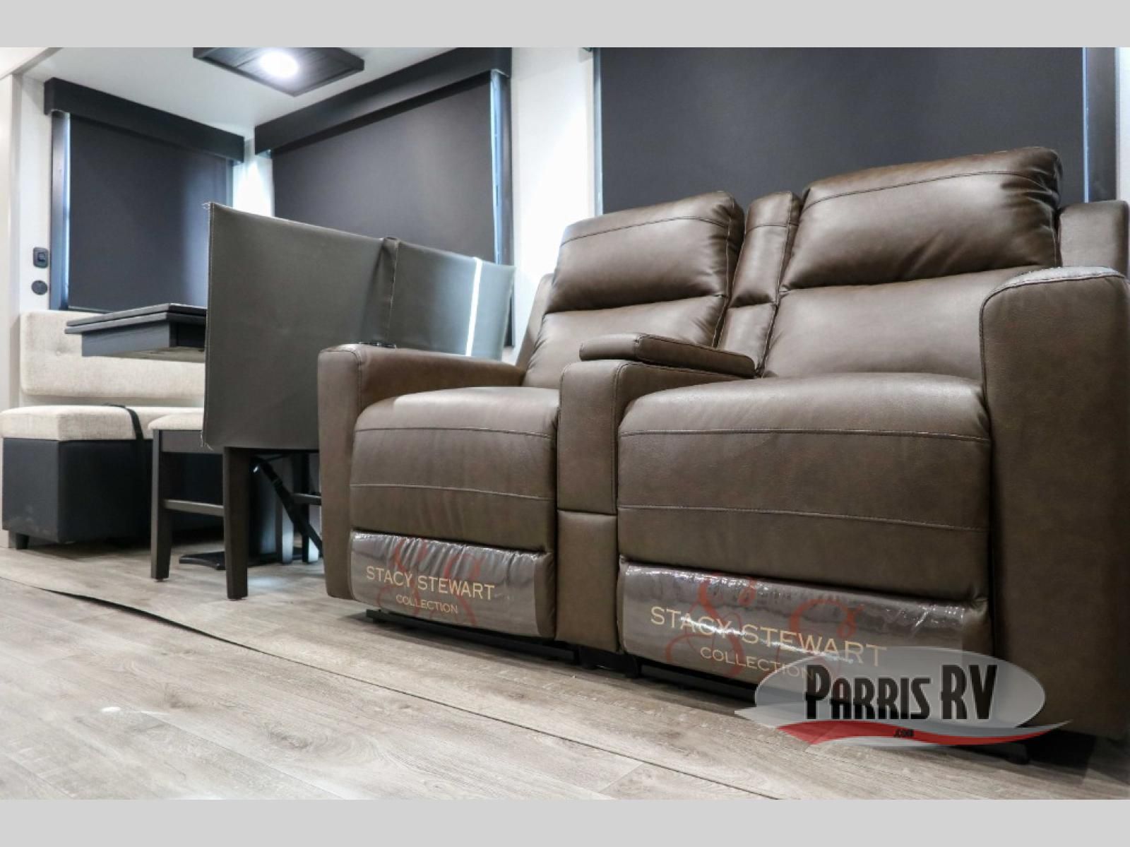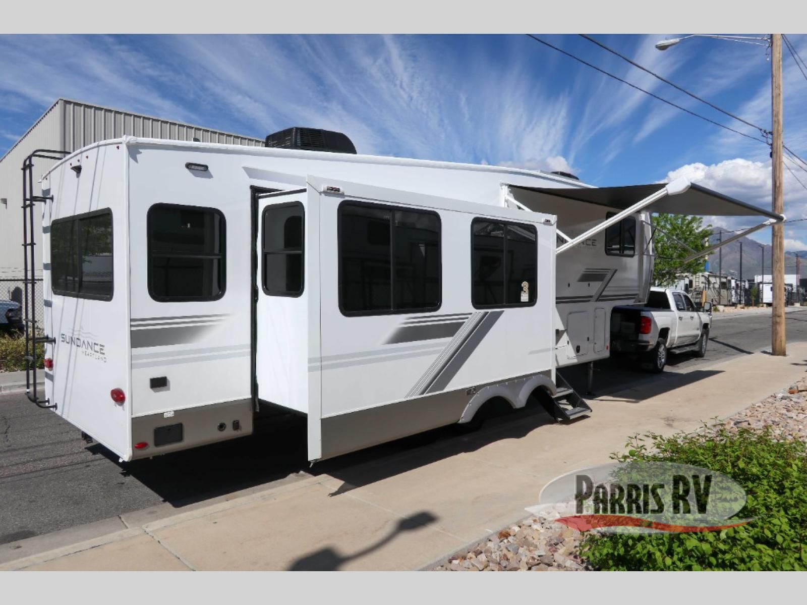 This Sundance Fifth Wheel offers a luxurious living experience on the road! The rear living area is the heart of the RV, featuring a tri-fold sofa that's perfect for relaxation and entertainment. The theater seating provides ample seating for family and friends, while the entertainment center offers endless entertainment options. The kitchen is equipped with a pantry, a kitchen island that offers additional counter space and storage, a refrigerator, a sink that's conveniently located for food preparation and cleanup, and a microwave. Plus, a table with chairs and a bench seat offers a comfortable dining space. The full bathroom is designed for comfort and convenience, providing a private space for personal care. The serene front bedroom features an Olympic bed that provides a comfortable sleeping space