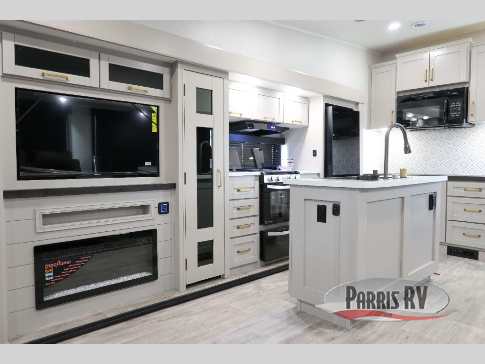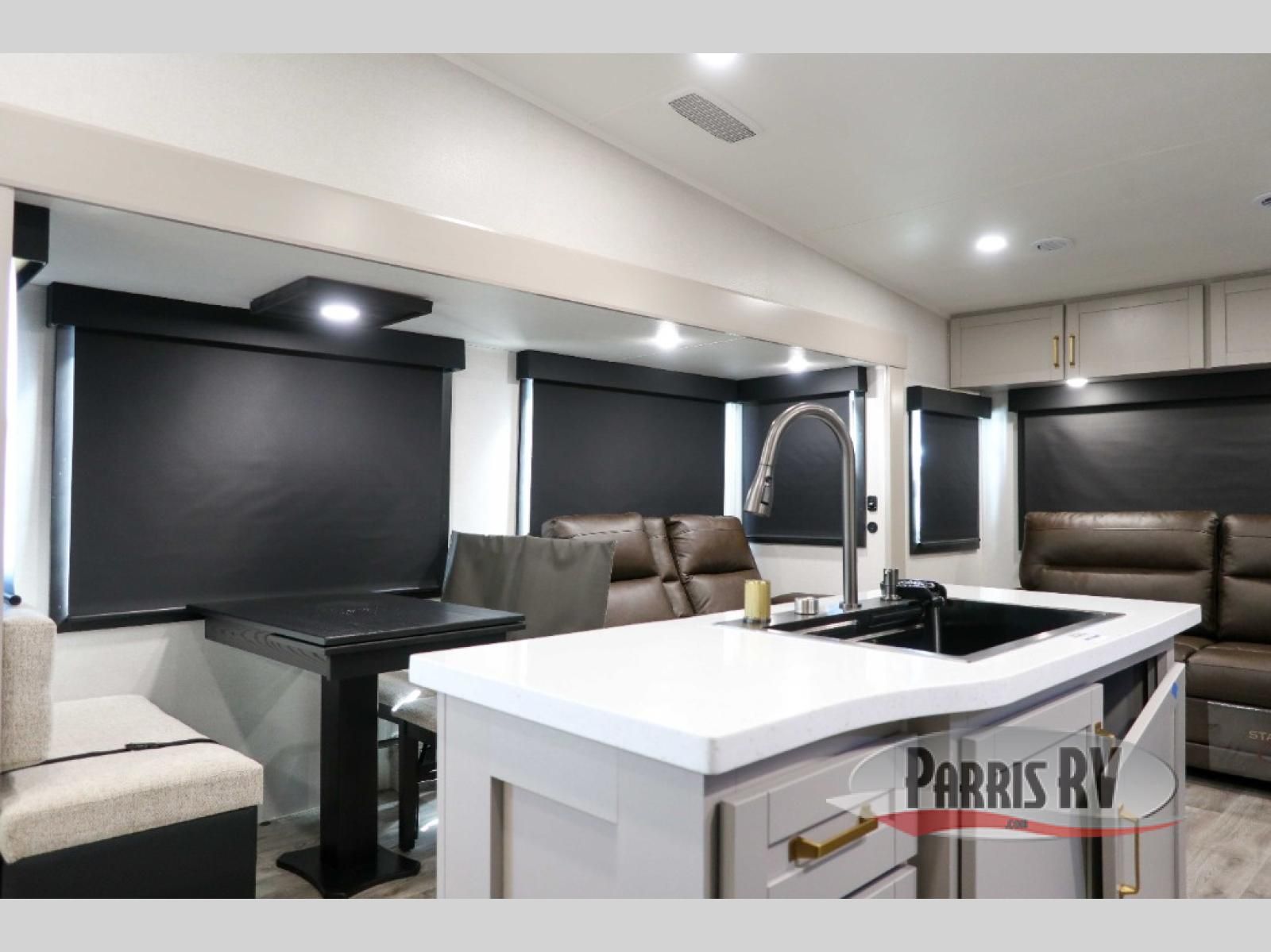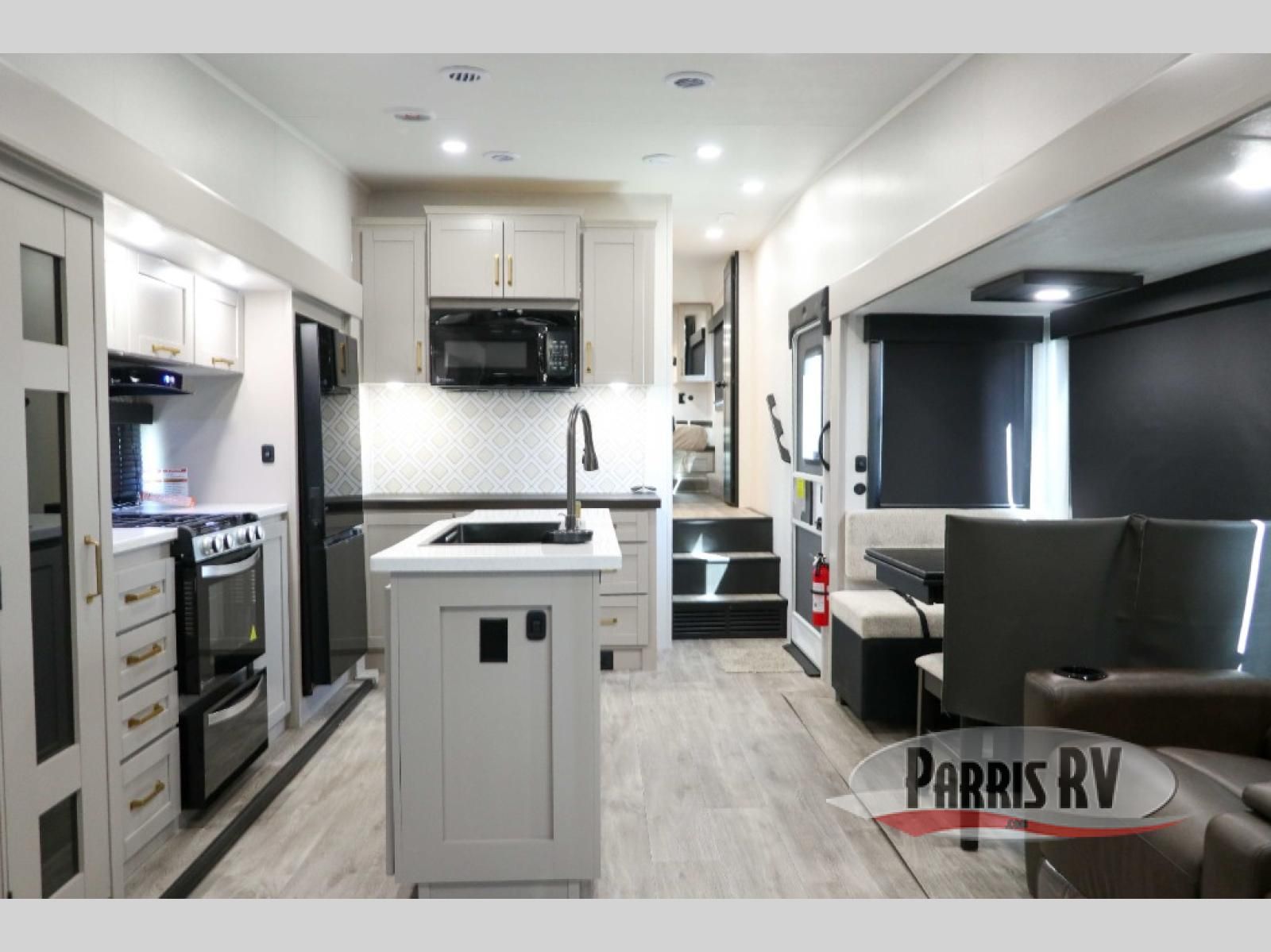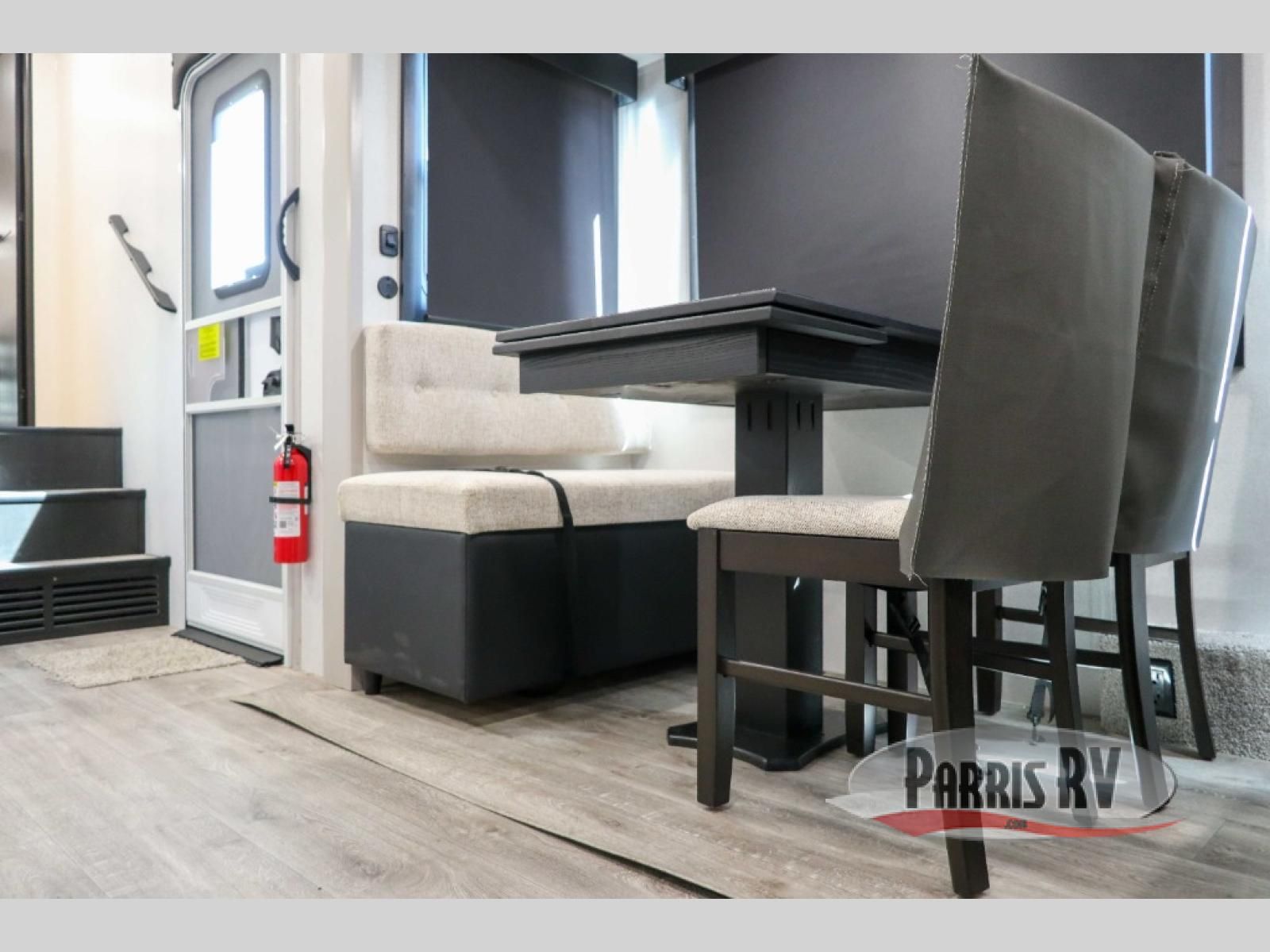 This Sundance Fifth Wheel offers a luxurious living experience on the road! The rear living area is the heart of the RV, featuring a tri-fold sofa that's perfect for relaxation and entertainment. The theater seating provides ample seating for family and friends, while the entertainment center offers endless entertainment options. The kitchen is equipped with a pantry, a kitchen island that offers additional counter space and storage, a refrigerator, a sink that's conveniently located for food preparation and cleanup, and a microwave. Plus, a table with chairs and a bench seat offers a comfortable dining space. The full bathroom is designed for comfort and convenience, providing a private space for personal care. The serene front bedroom features an Olympic bed that provides a comfortable sleeping space
