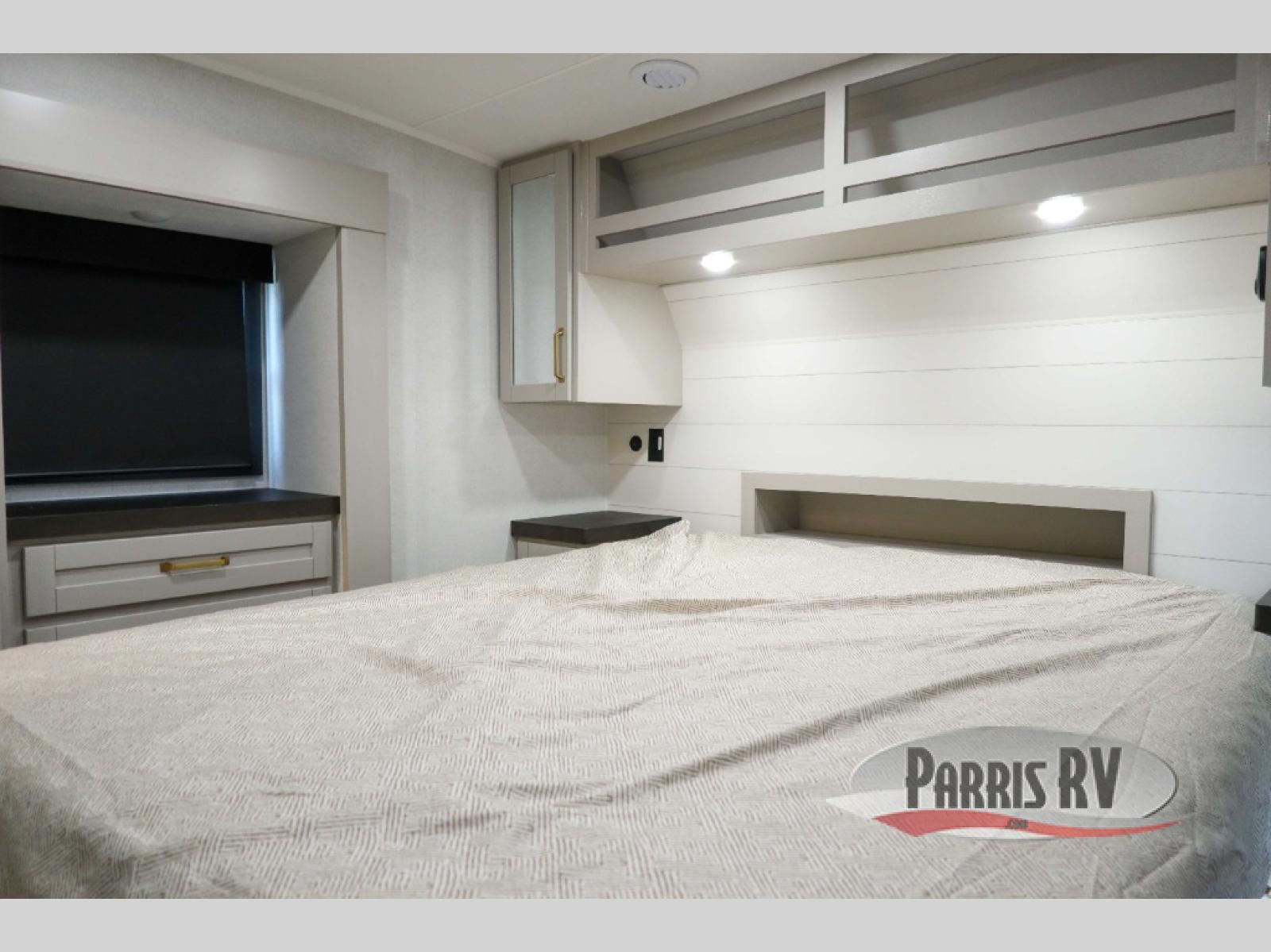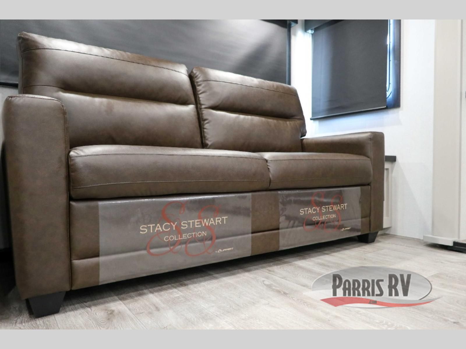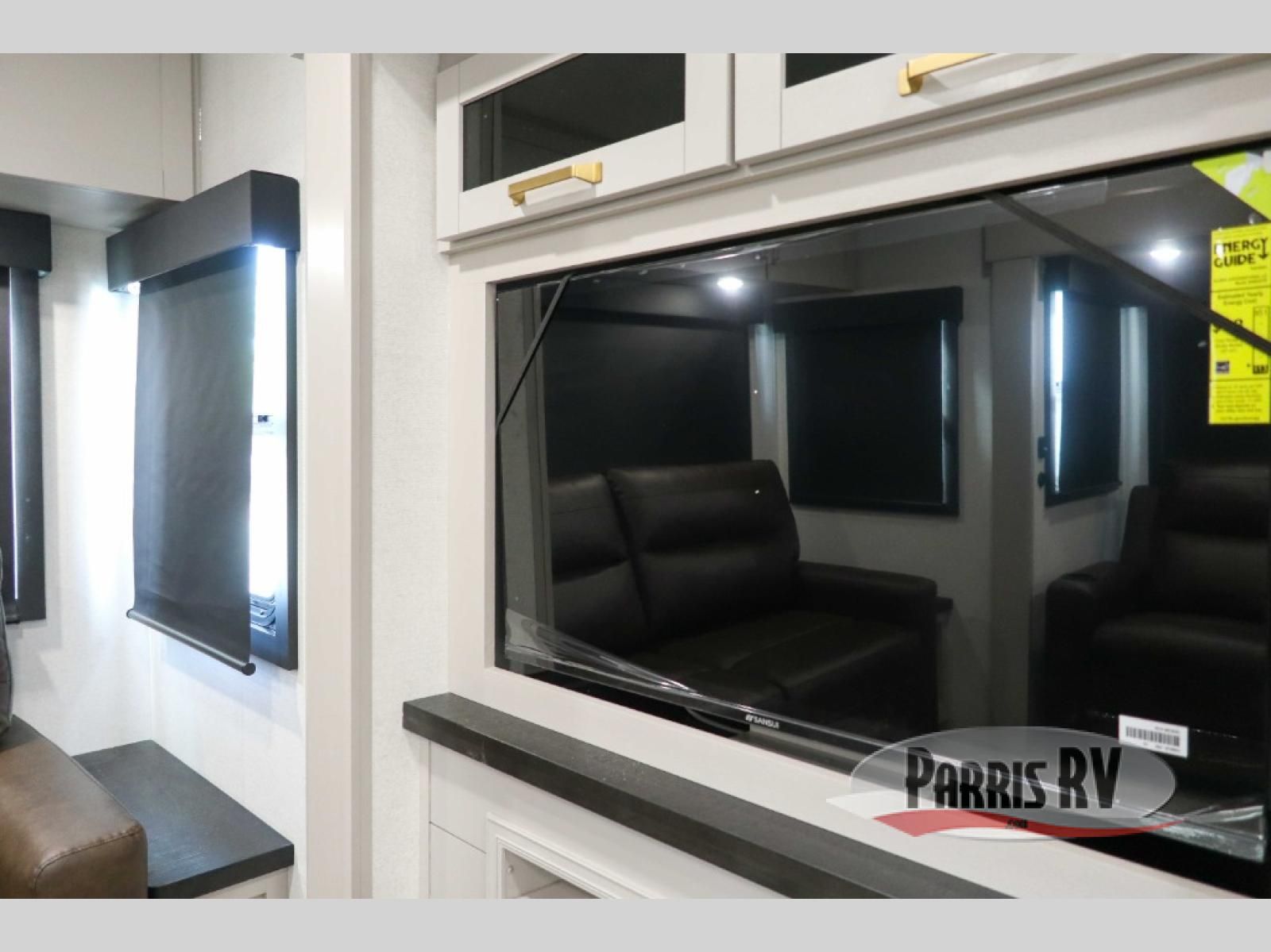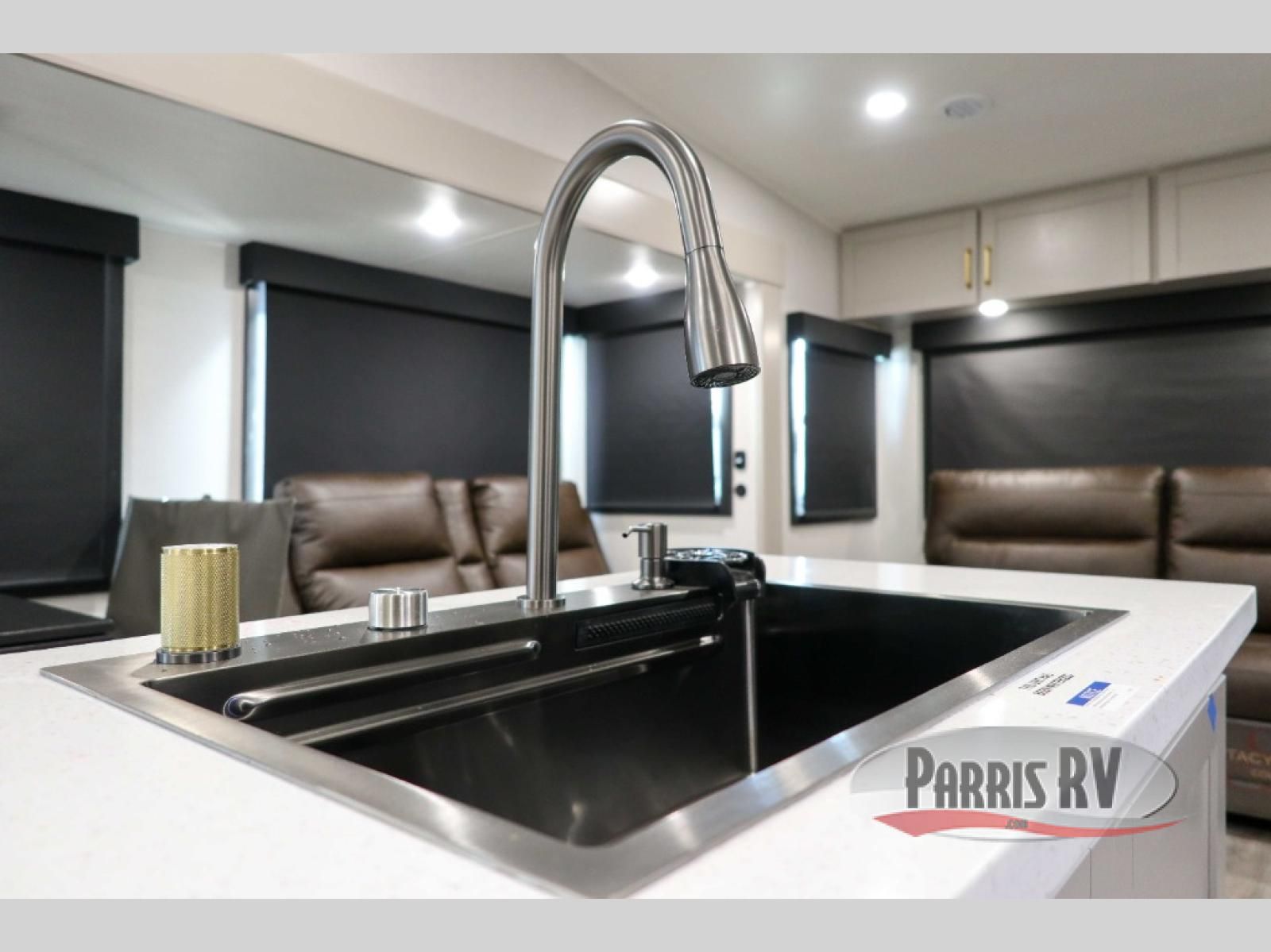 This Sundance Fifth Wheel offers a luxurious living experience on the road! The rear living area is the heart of the RV, featuring a tri-fold sofa that's perfect for relaxation and entertainment. The theater seating provides ample seating for family and friends, while the entertainment center offers endless entertainment options. The kitchen is equipped with a pantry, a kitchen island that offers additional counter space and storage, a refrigerator, a sink that's conveniently located for food preparation and cleanup, and a microwave. Plus, a table with chairs and a bench seat offers a comfortable dining space. The full bathroom is designed for comfort and convenience, providing a private space for personal care. The serene front bedroom features an Olympic bed that provides a comfortable sleeping space