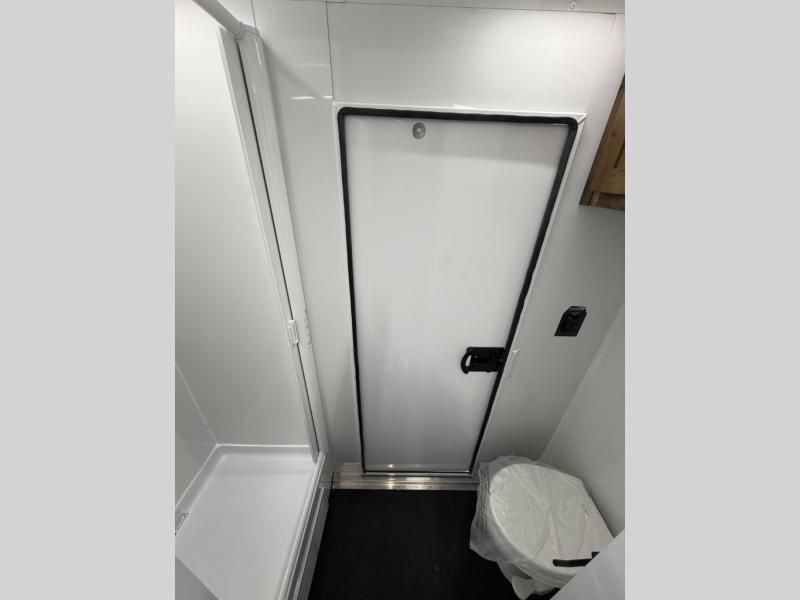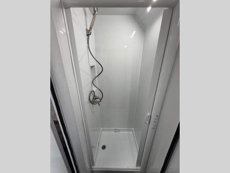 Bathroom: Full shower and porcelain toilet with dedicated exterior man door access