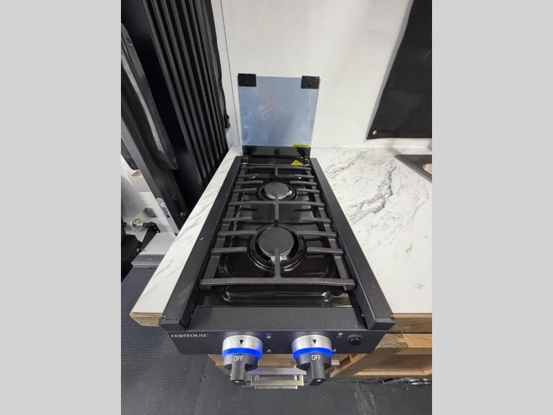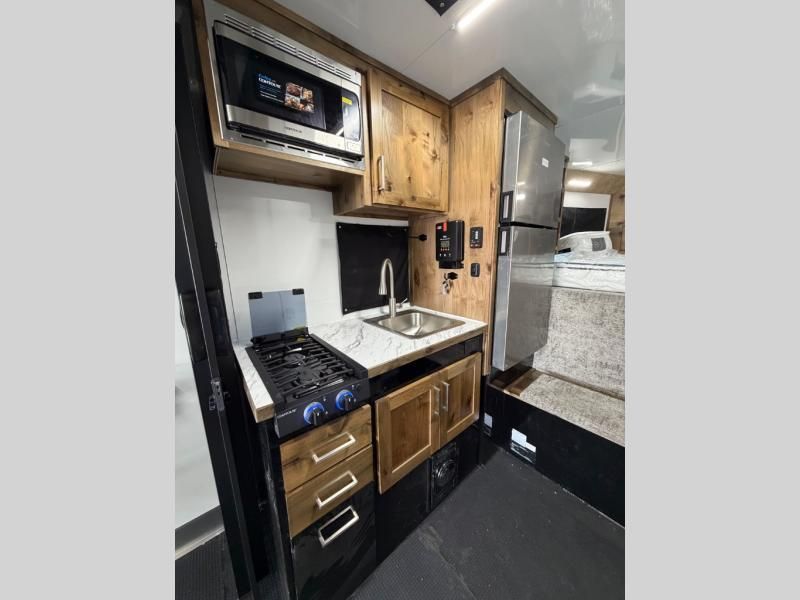 Kitchen: Large 12V refrigerator, multi-burner cooktop, microwave, and deep-basin sink