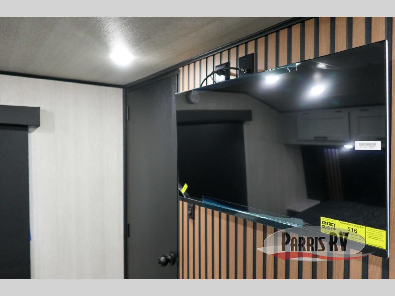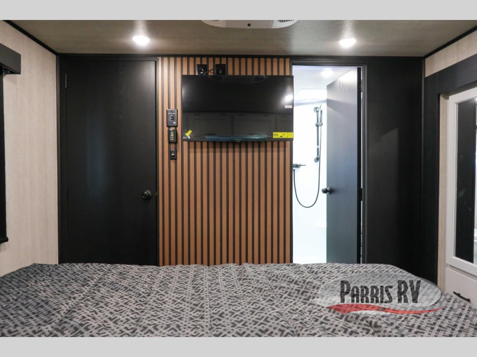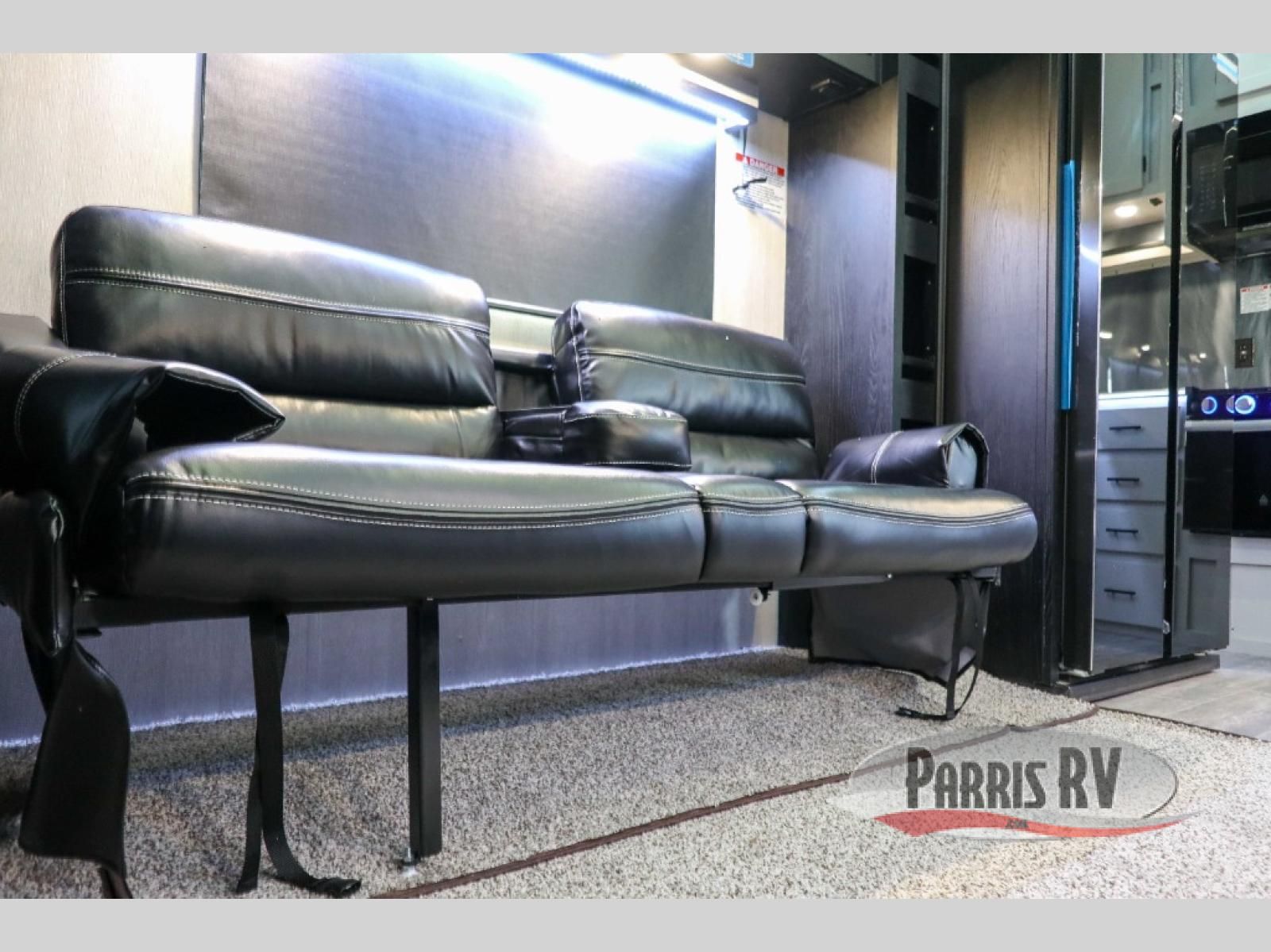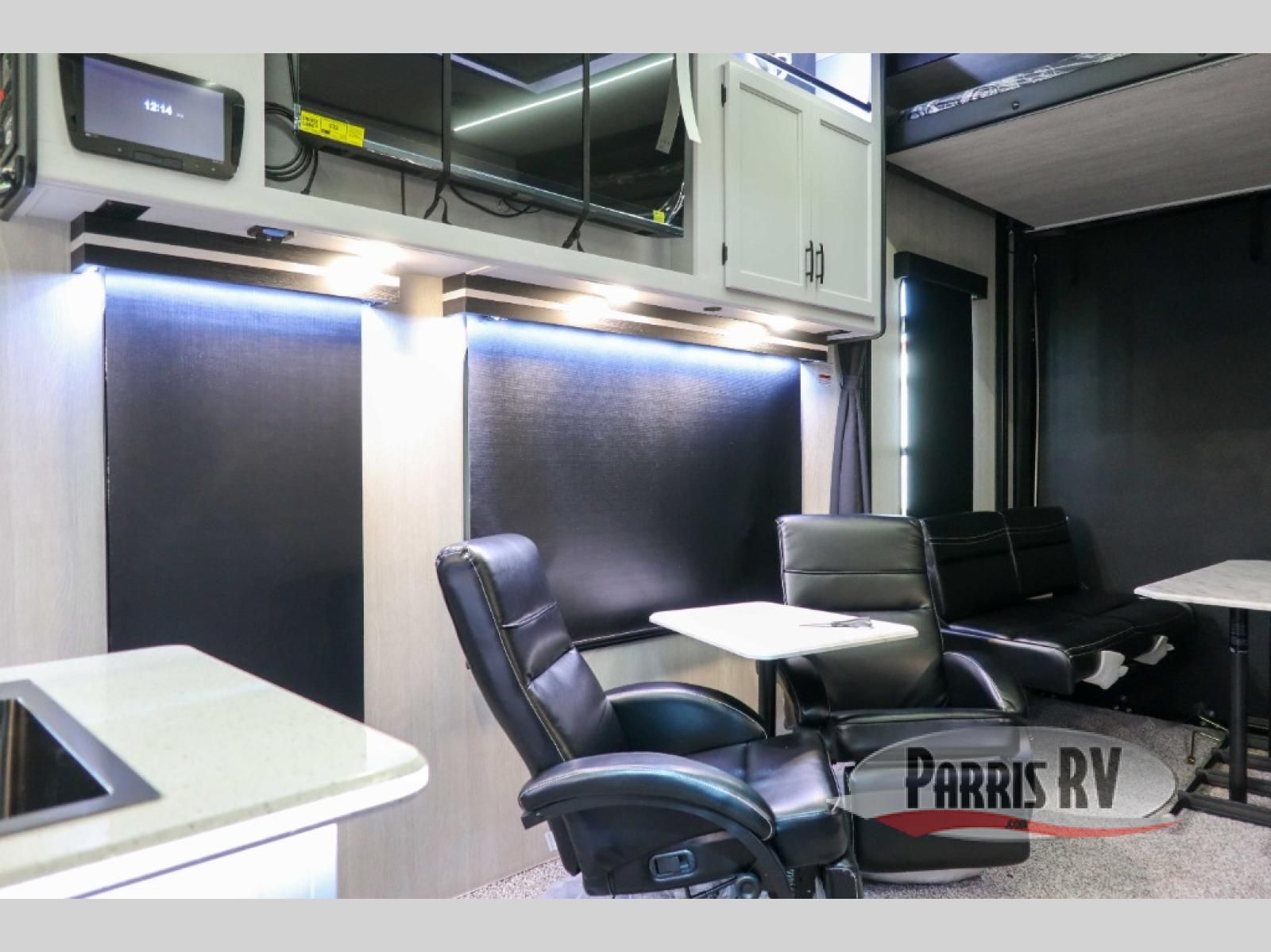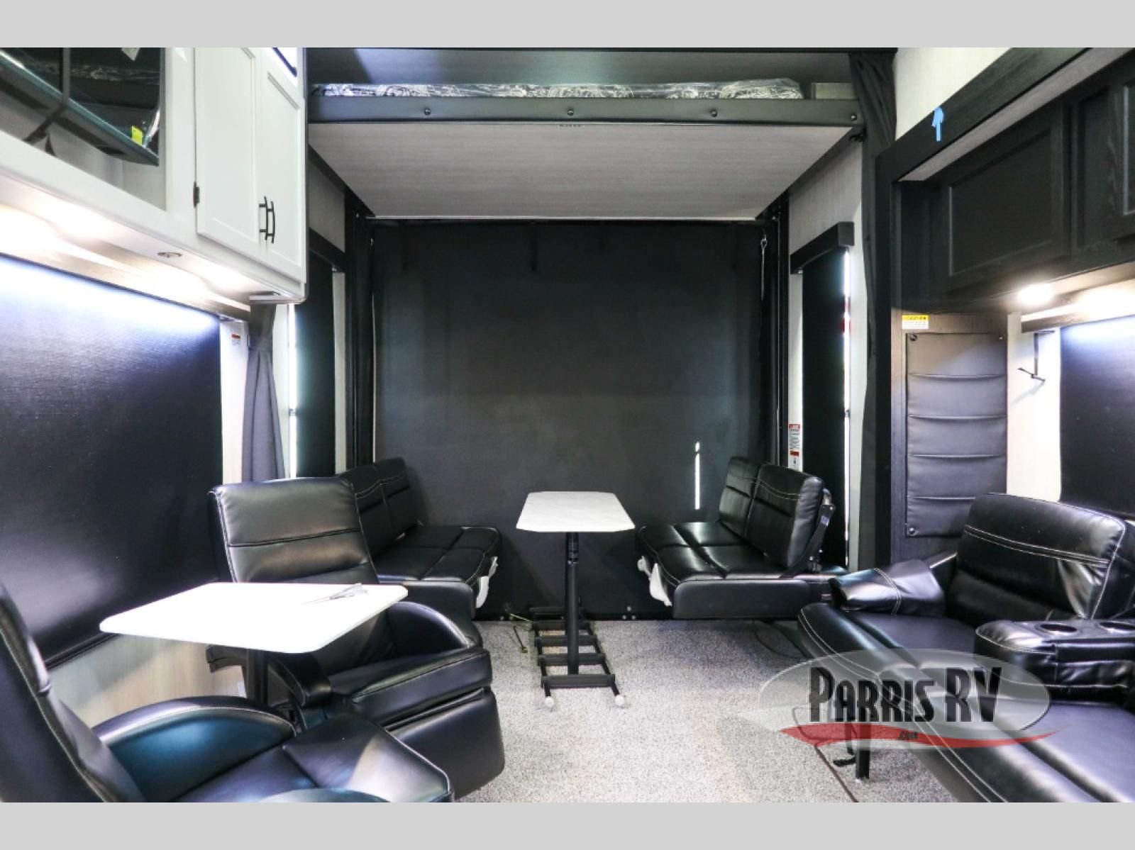Stand out from the crowd with this Vortex toy hauler! You can enjoy a comfortable night of rest on your very own king-size bed in the front master suite. This space has a wardrobe slide for storing your sweaters, a nightstand to place your alarm clock on, and a countertop on the other side of the bed that you can place décor on. The kitchen is equipped with great tools, like the three-burner range that you can use to fry up some eggs and bacon, and you'll also be able to take a load off in the two lounge chairs.