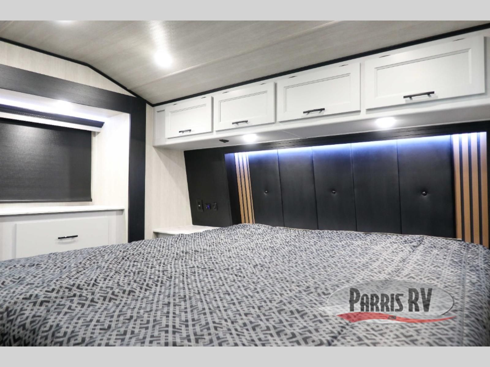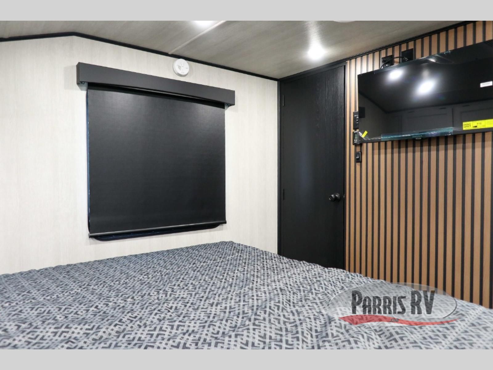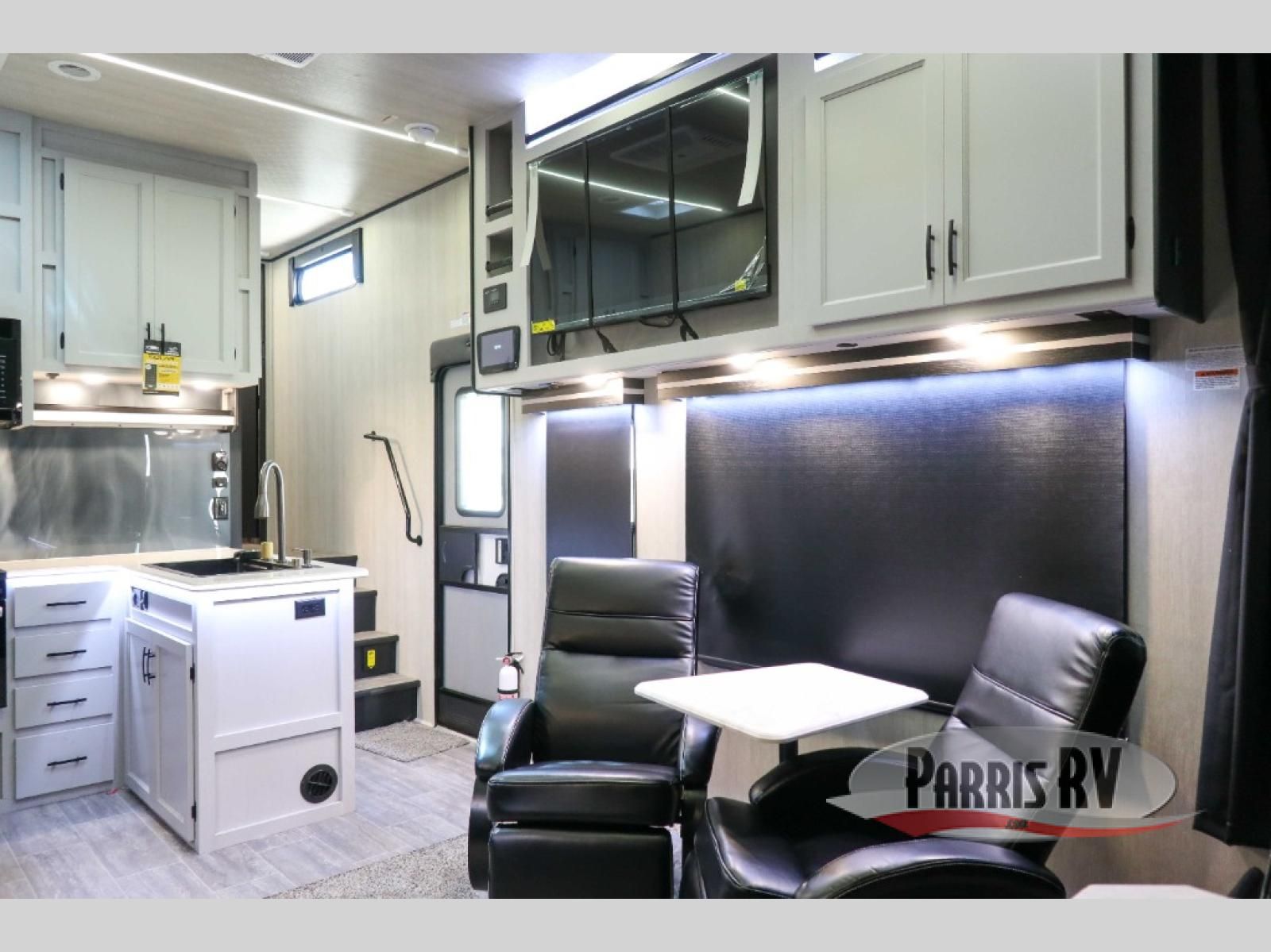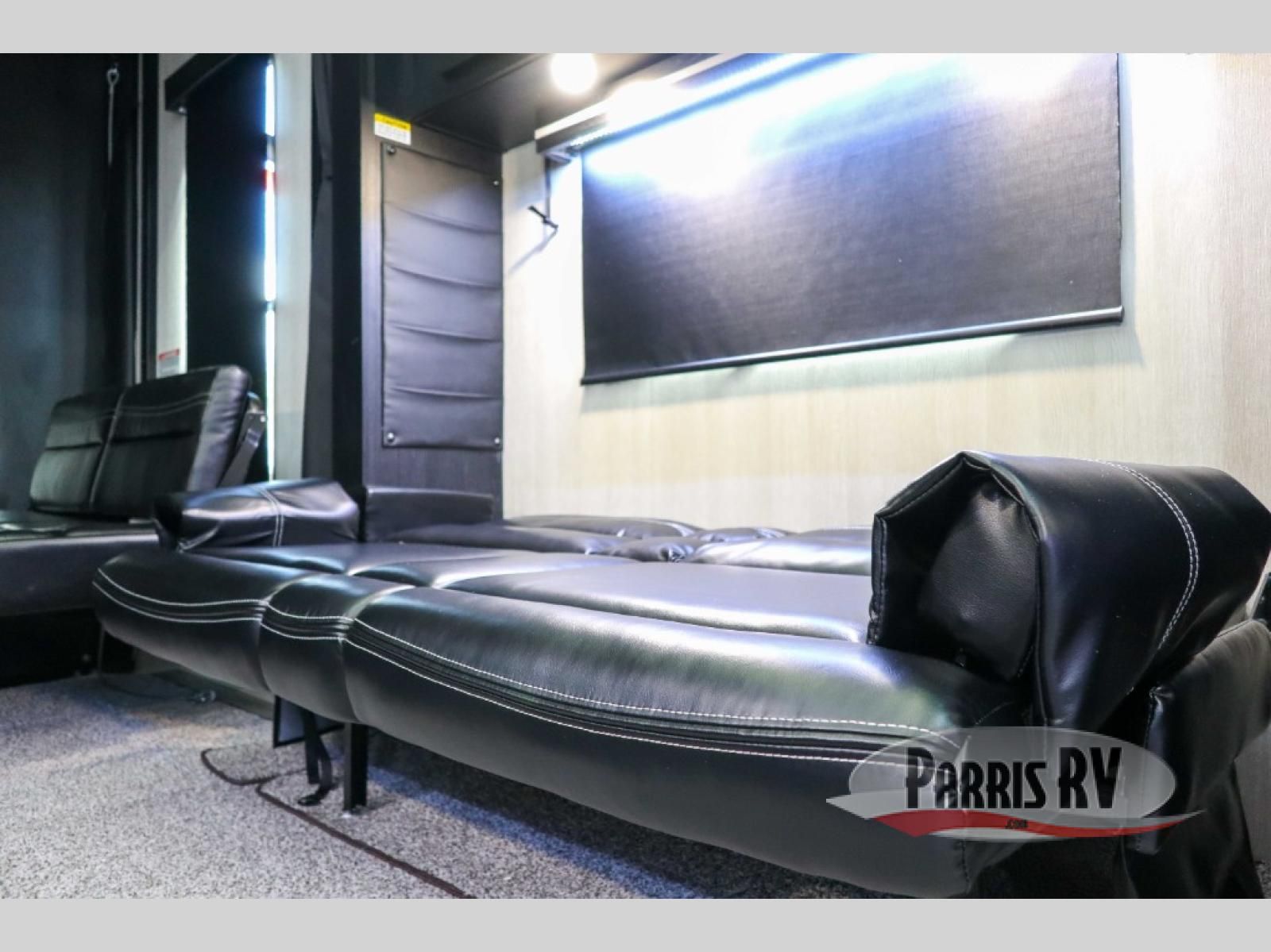 Stand out from the crowd with this Vortex toy hauler! You can enjoy a comfortable night of rest on your very own king-size bed in the front master suite. This space has a wardrobe slide for storing your sweaters, a nightstand to place your alarm clock on, and a countertop on the other side of the bed that you can place décor on. The kitchen is equipped with great tools, like the three-burner range that you can use to fry up some eggs and bacon, and you'll also be able to take a load off in the two lounge chairs.