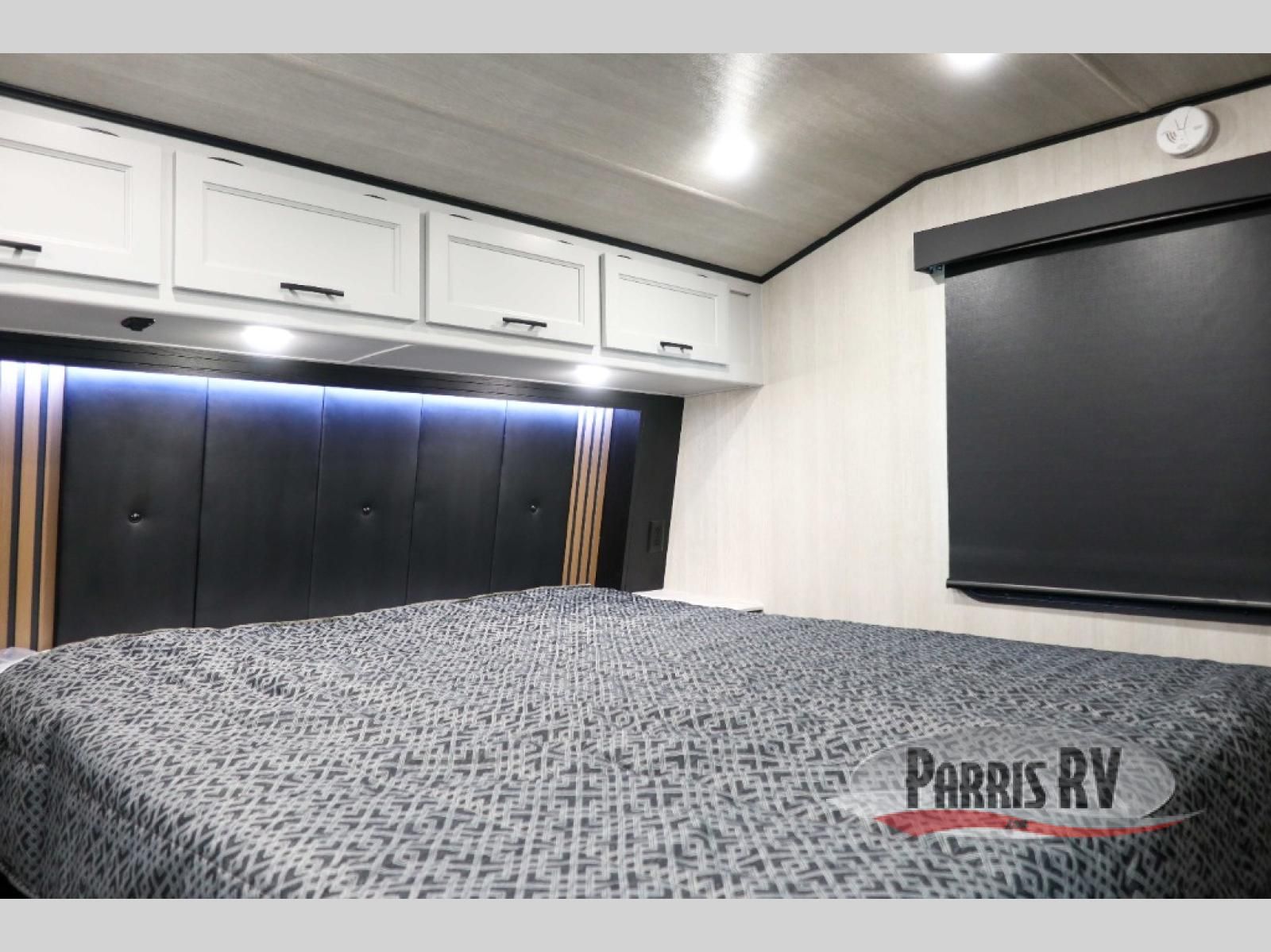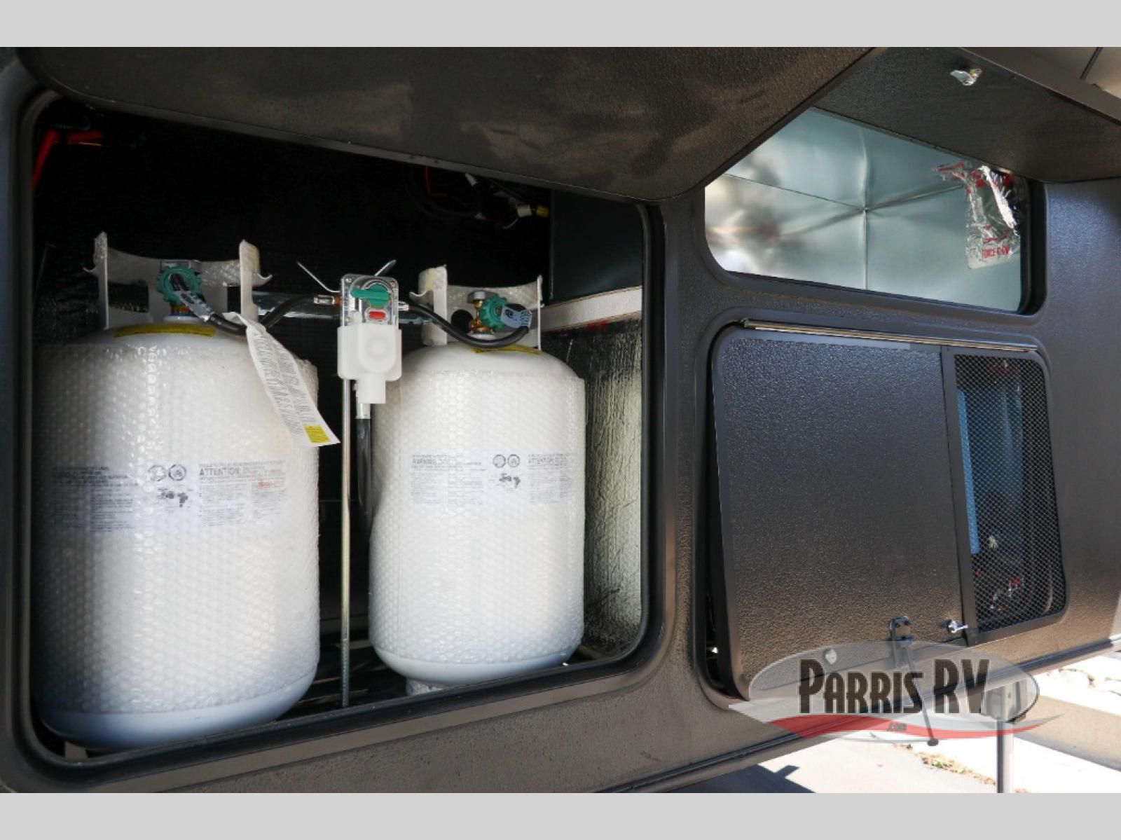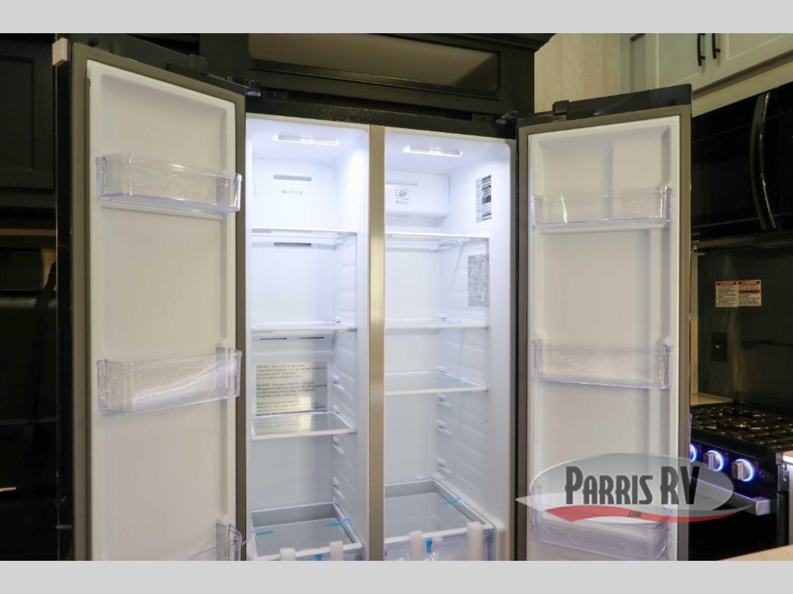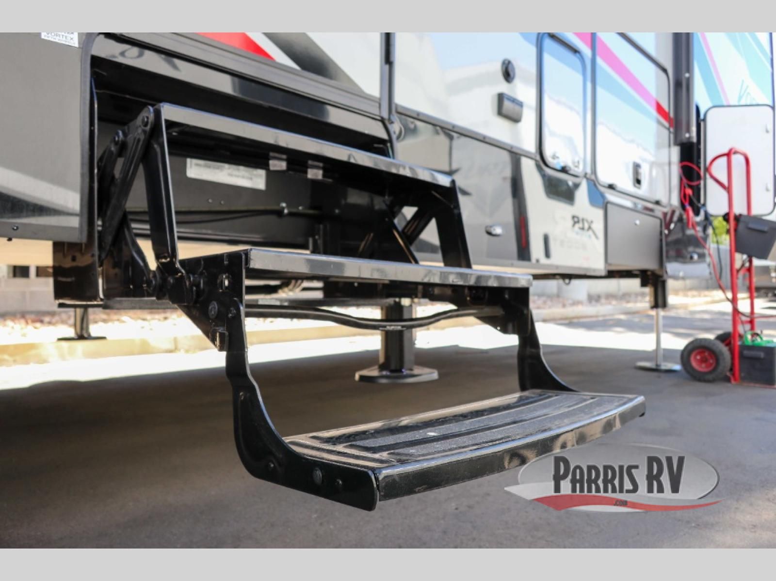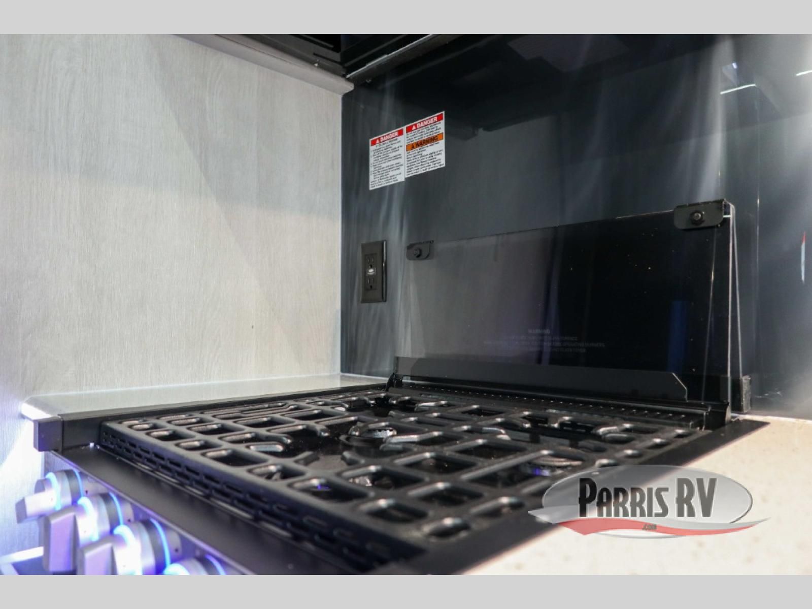 Stand out from the crowd with this Vortex toy hauler! You can enjoy a comfortable night of rest on your very own king-size bed in the front master suite. This space has a wardrobe slide for storing your sweaters, a nightstand to place your alarm clock on, and a countertop on the other side of the bed that you can place décor on. The kitchen is equipped with great tools, like the three-burner range that you can use to fry up some eggs and bacon, and you'll also be able to take a load off in the two lounge chairs.