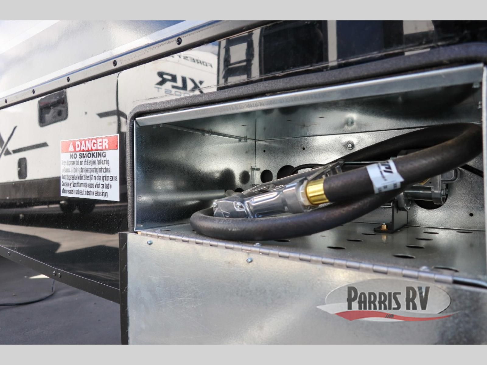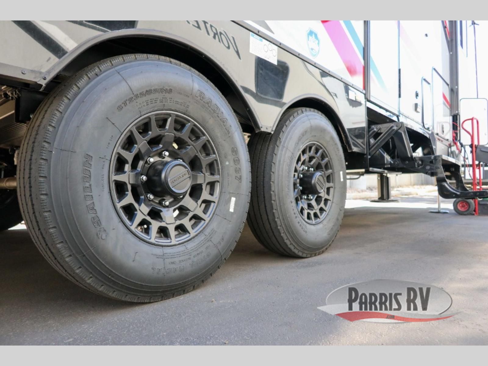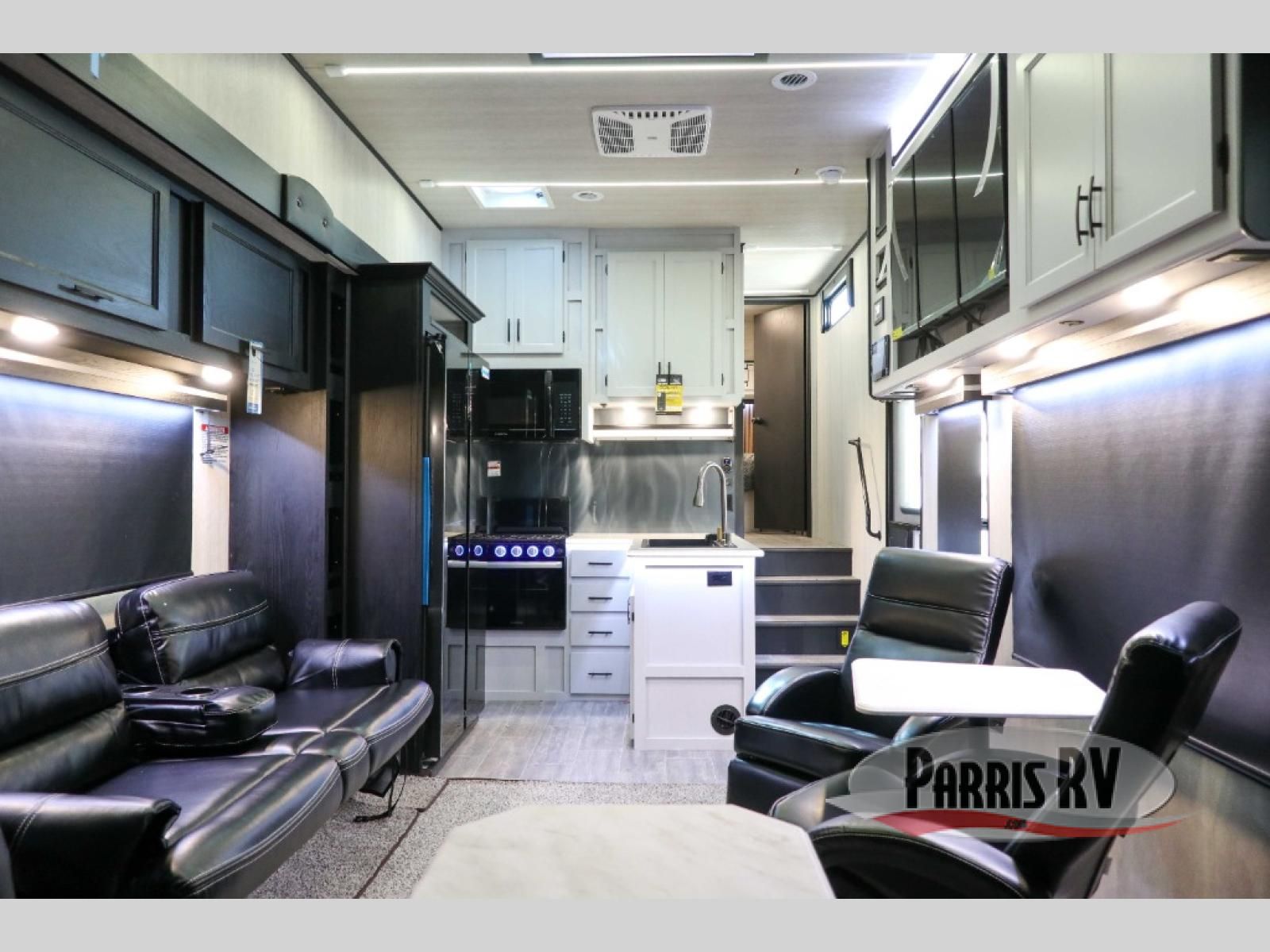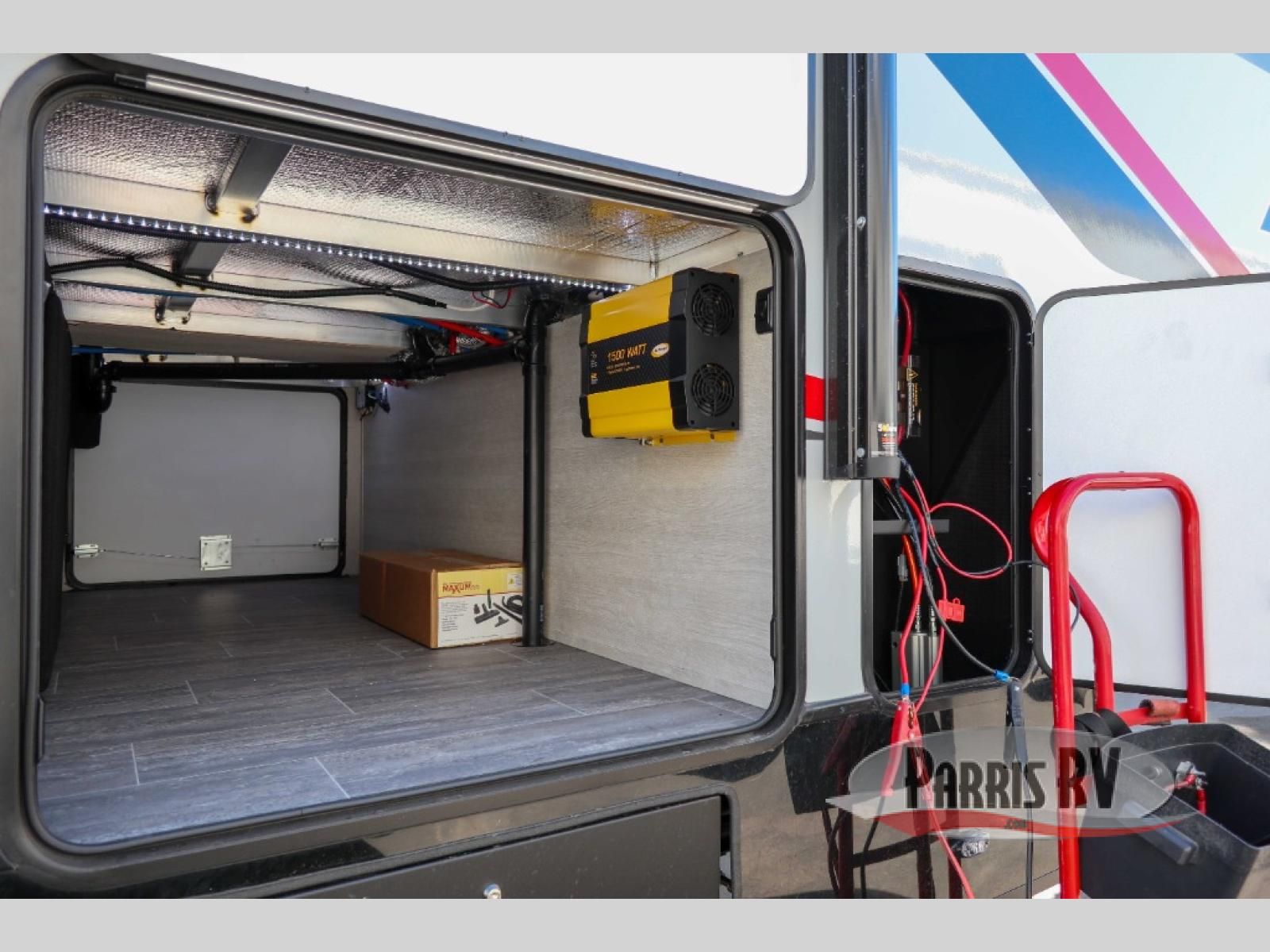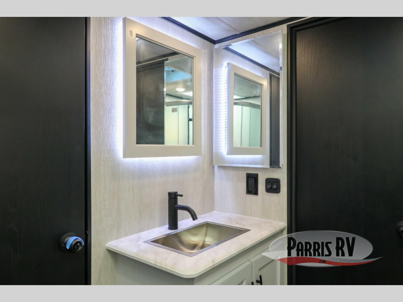 Stand out from the crowd with this Vortex toy hauler! You can enjoy a comfortable night of rest on your very own king-size bed in the front master suite. This space has a wardrobe slide for storing your sweaters, a nightstand to place your alarm clock on, and a countertop on the other side of the bed that you can place décor on. The kitchen is equipped with great tools, like the three-burner range that you can use to fry up some eggs and bacon, and you'll also be able to take a load off in the two lounge chairs.
