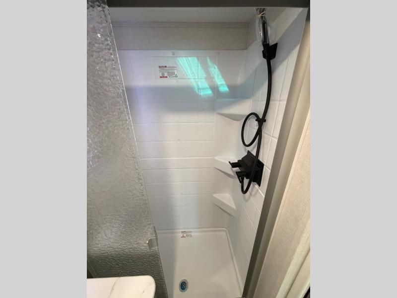 Bathroom: Large walk-in shower with a glass door and high-output power vent